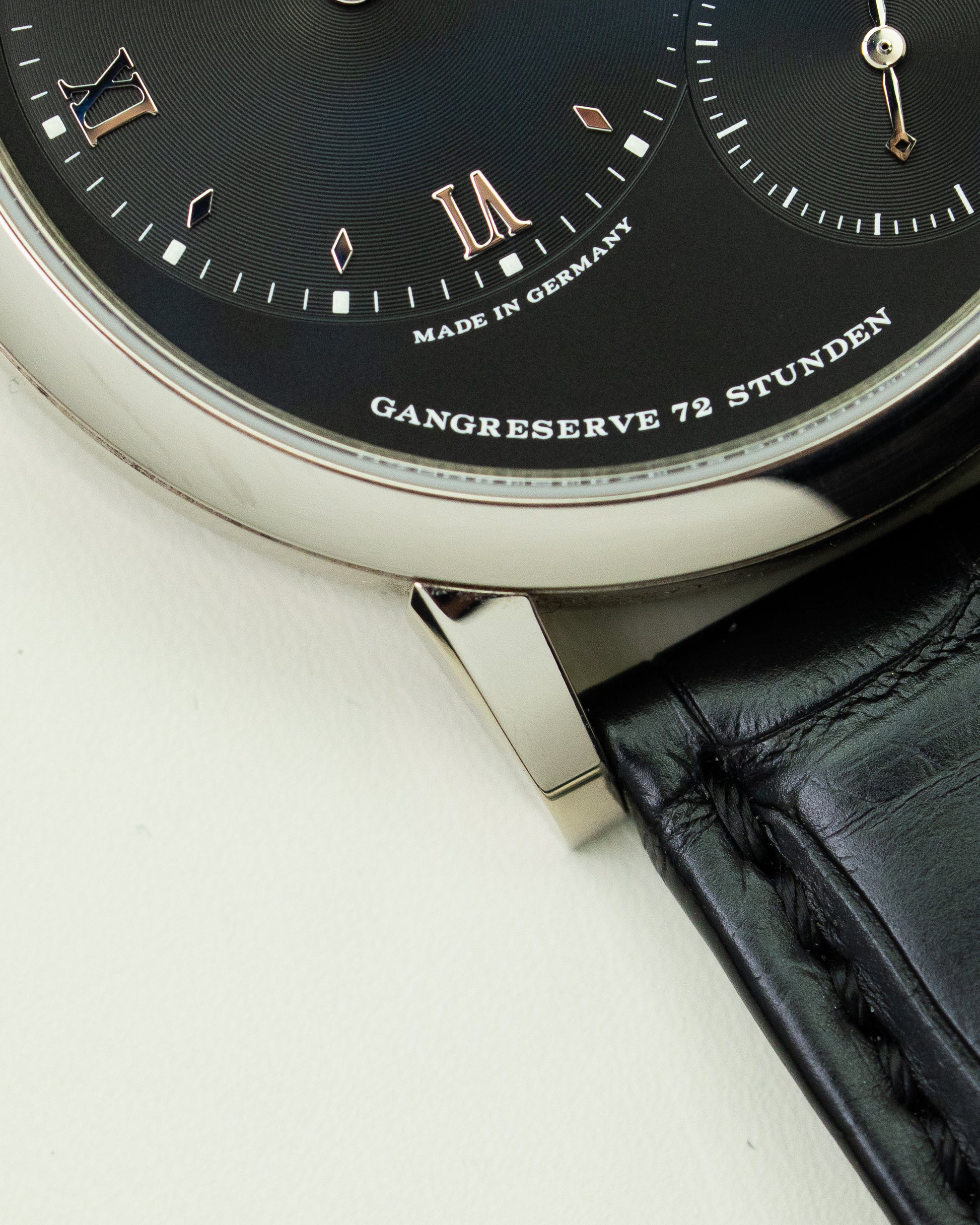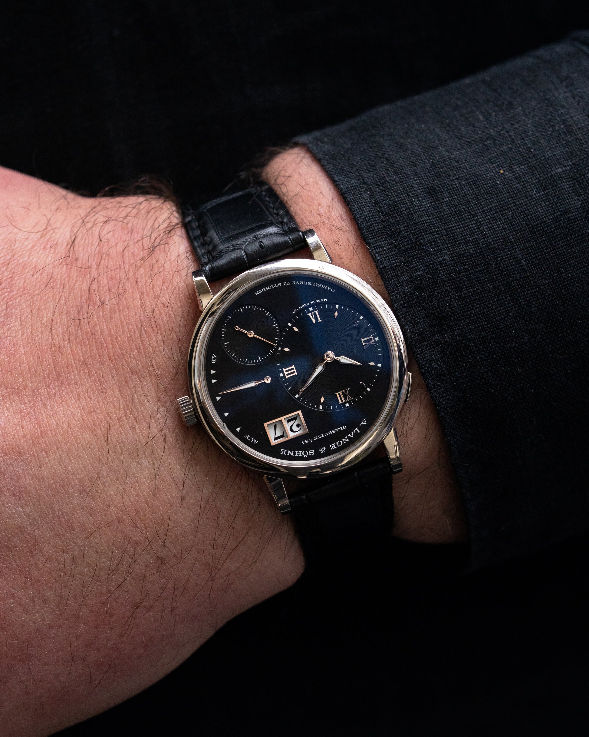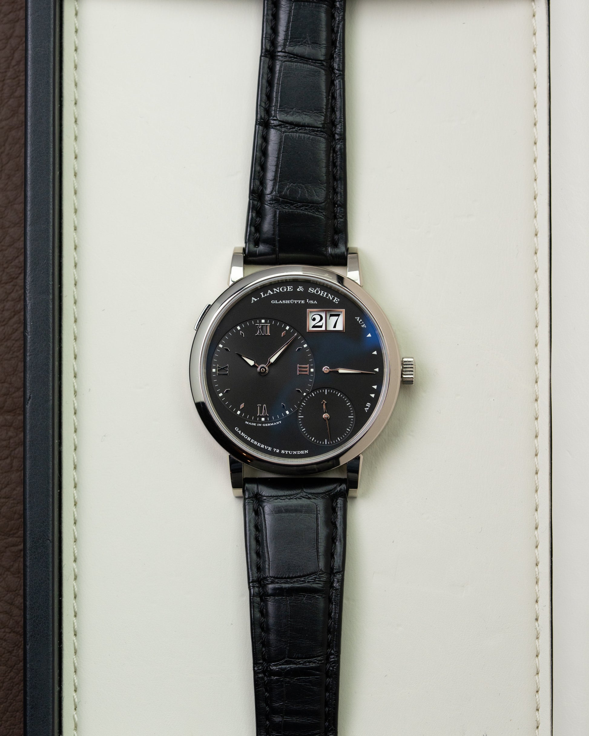This Grand Lange 1 in 18K white gold embodies the brand's iconic asymmetric dial layout. The 41mm measuring case houses the hand wound calibre L095.1 seen through a clear case back. The solid silver black dial displays the time, off-center seconds, date and power reserve indicator. You don't need to wind this precious timepiece everyday, the power reserve is an incredible 72 hours. Discontinued today and very rare, it remains highly sought after by collectors.