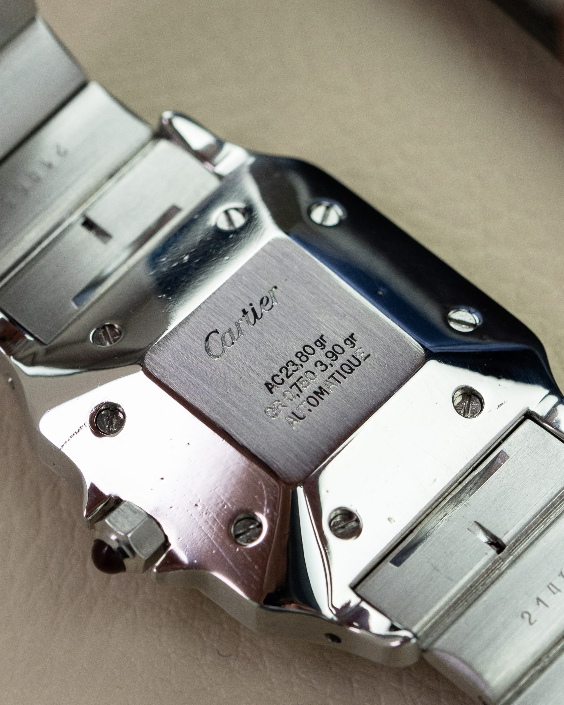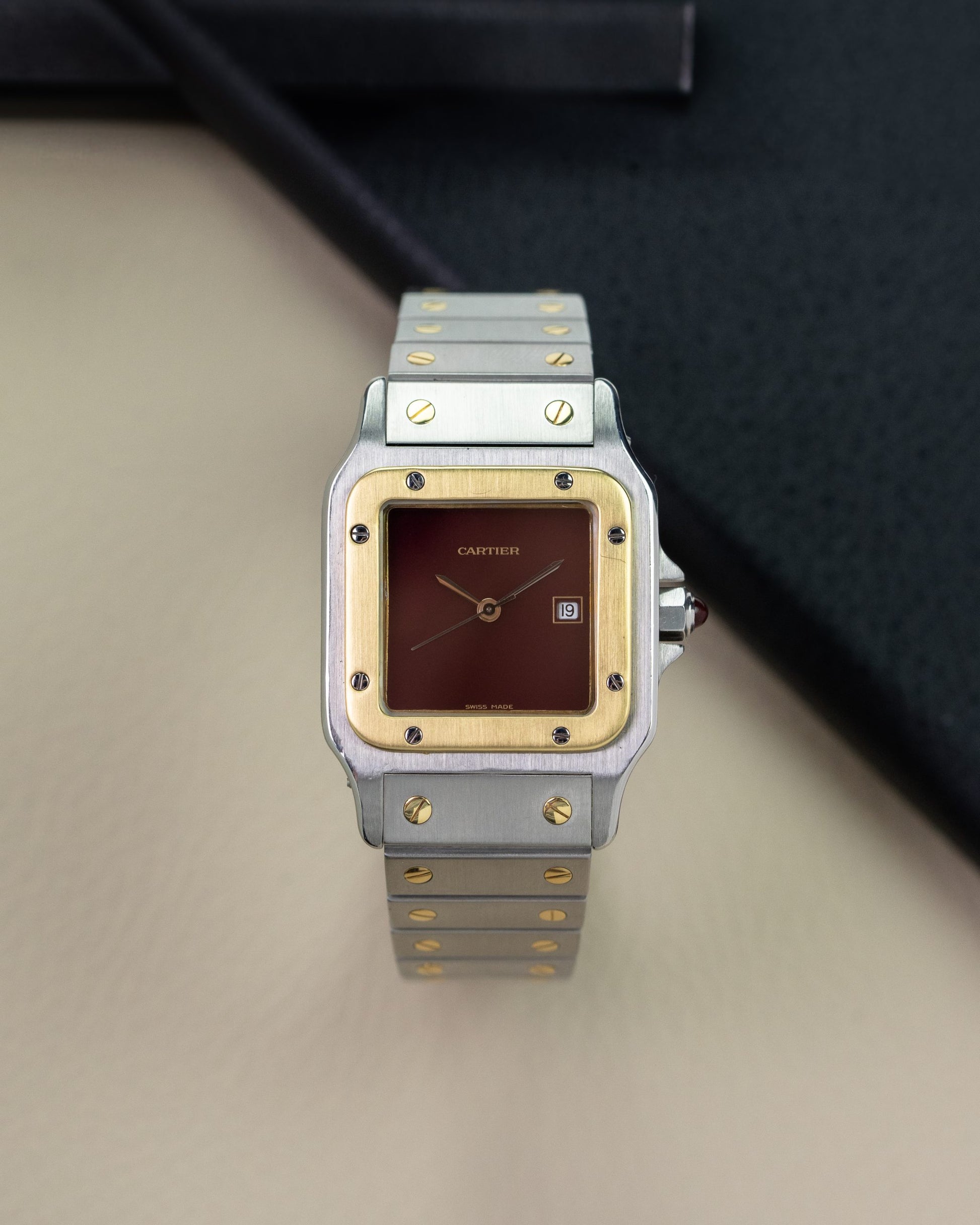 Cartier, a fusion of class and craftsmanship, this Cartier Santos Carrée in rare finds, of course we also have the ‘normal’ 2961 with the white dial and polished bezel, but this watch is special for its dial, which is a beautiful ‘Burguny’ or ‘Oxblood’. This model, as delivered from the factory, does has the brushed bezel and the original ruby red cabochon.