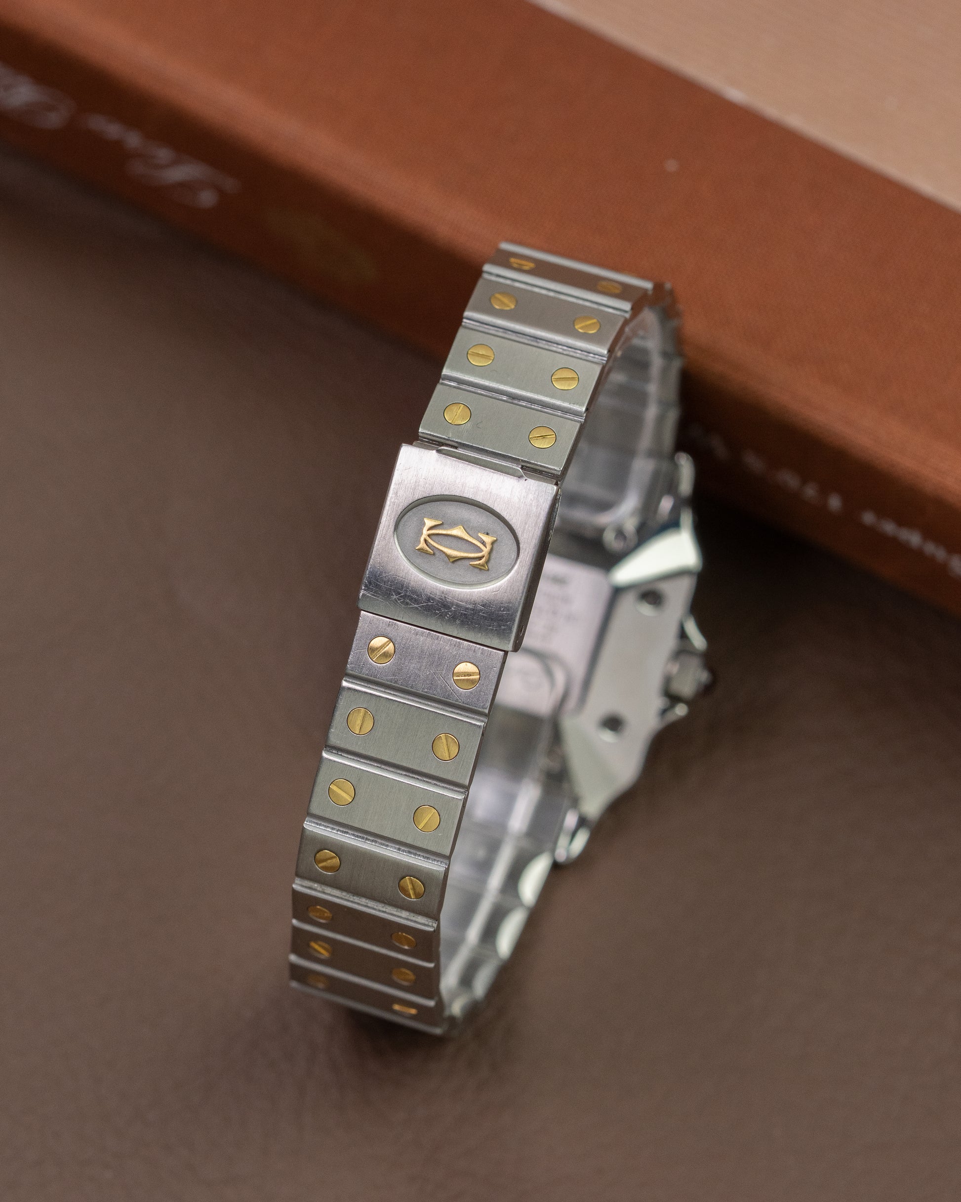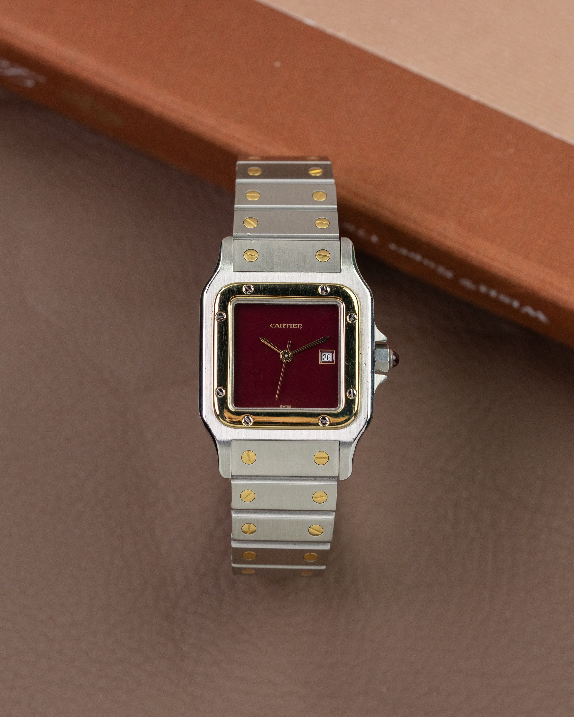 Who doesn't love a Burgundy dial? This beautiful Cartier Santos has one fitted in a beautiful gold and steel square case.