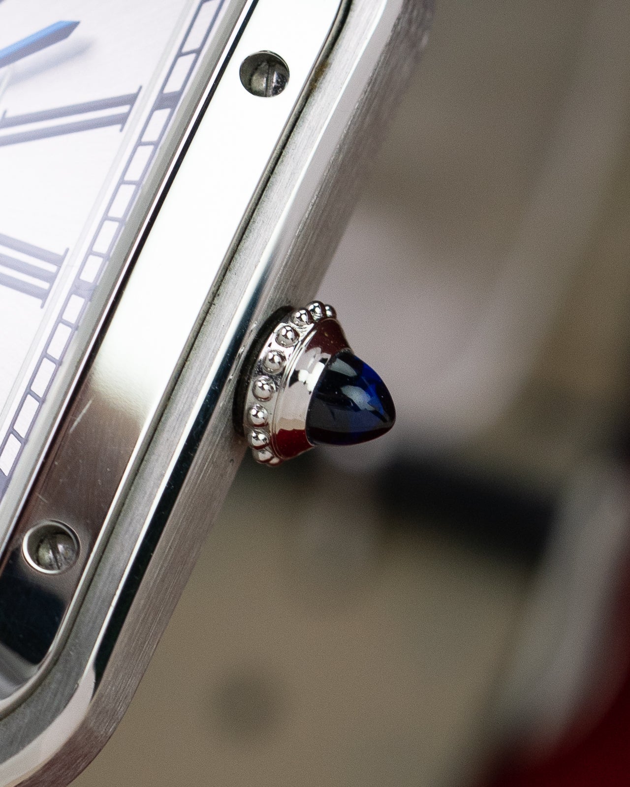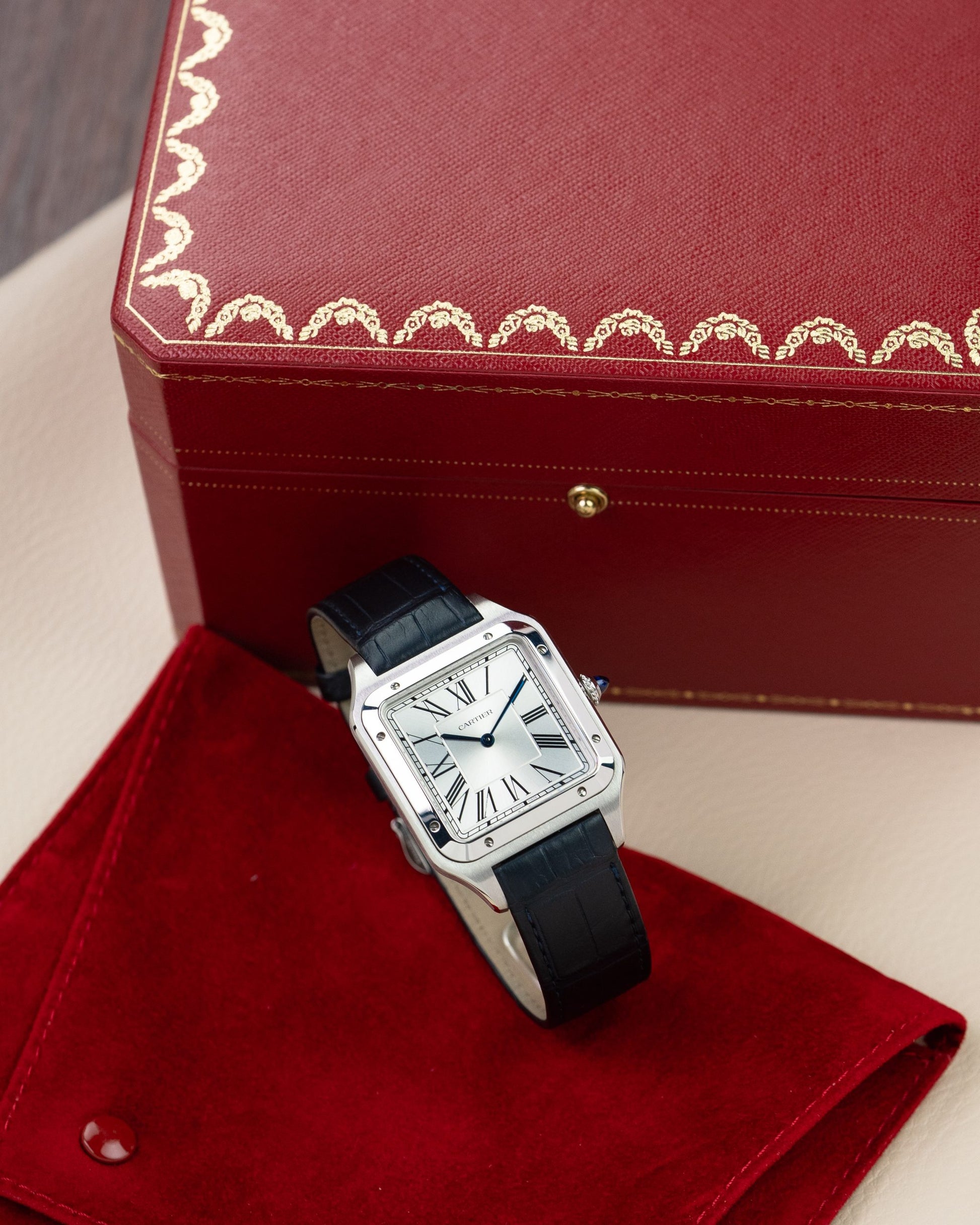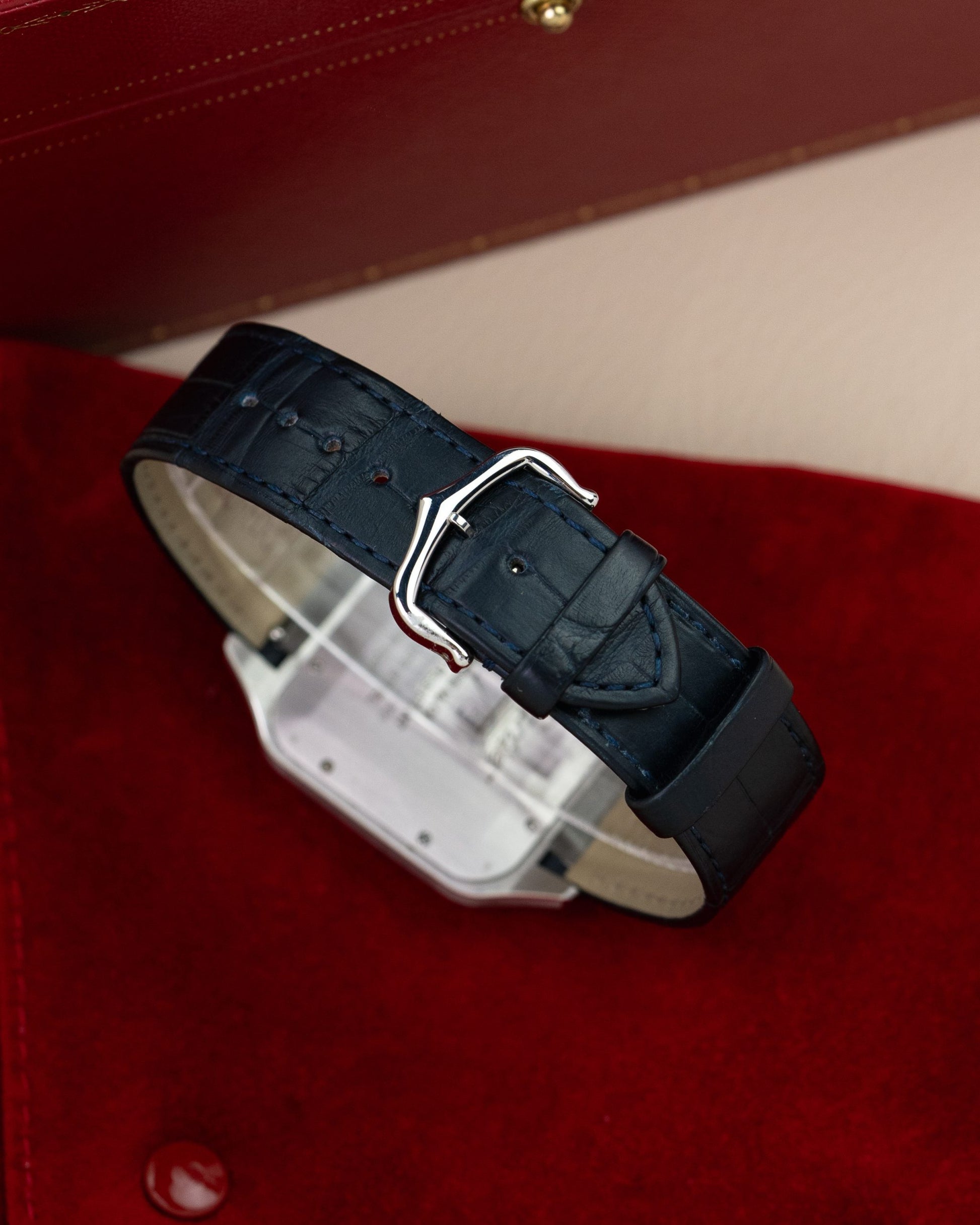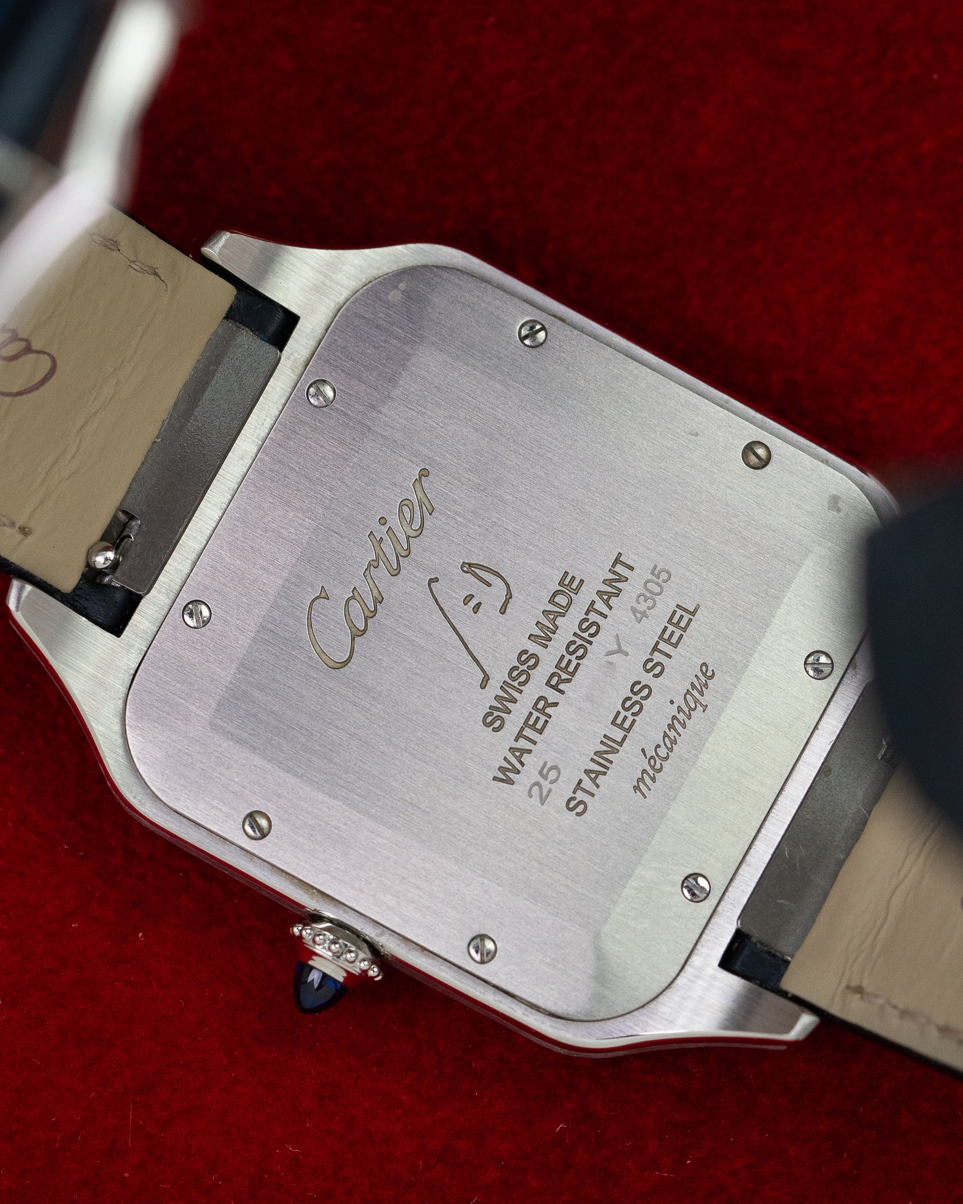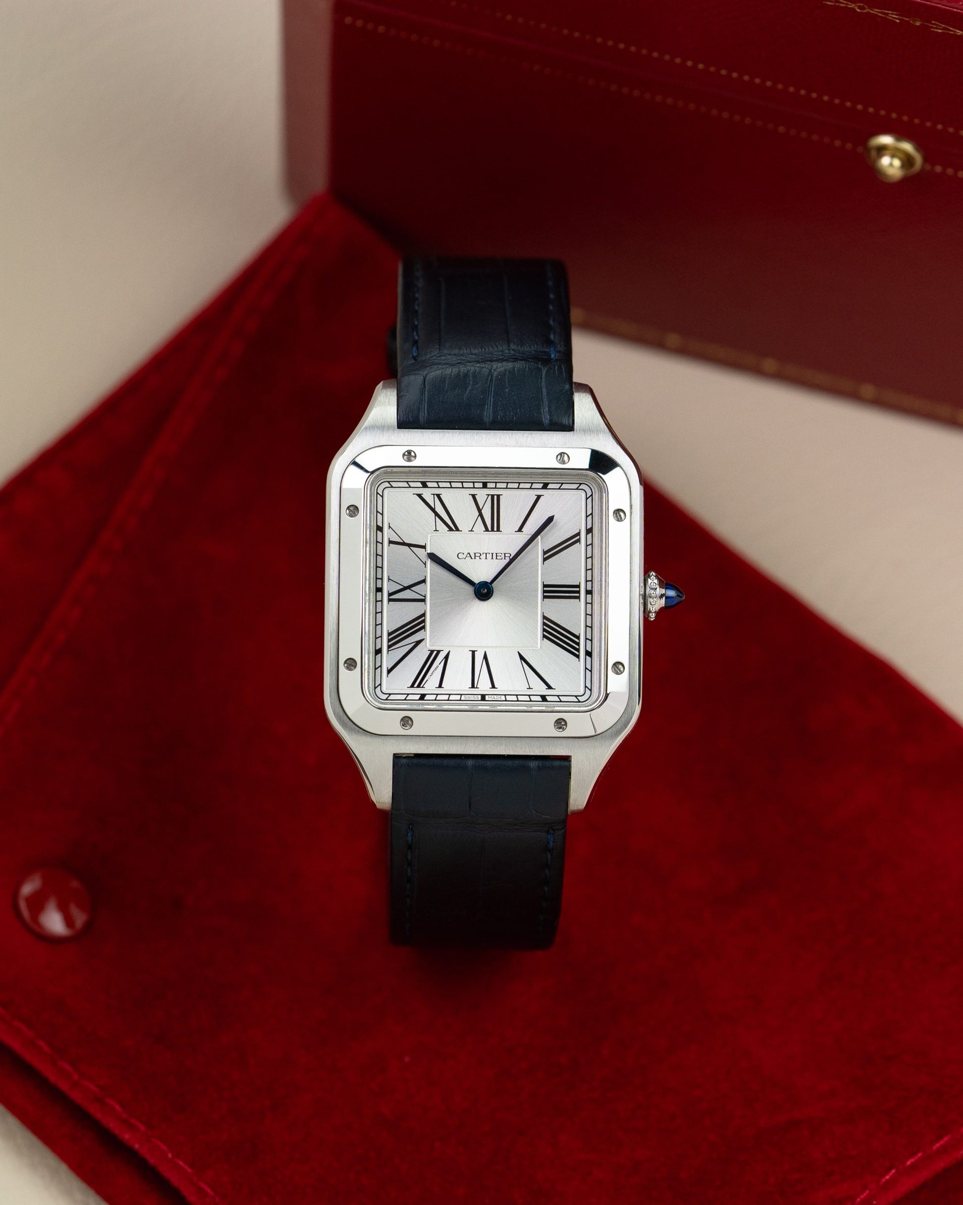 It's a pleasure to offer you this Santos-Dumont. This particular example features a mechanical movement with manual winding, calibre 430 MC. Which even adds on the feeling of wearing that iconic first Dumont.