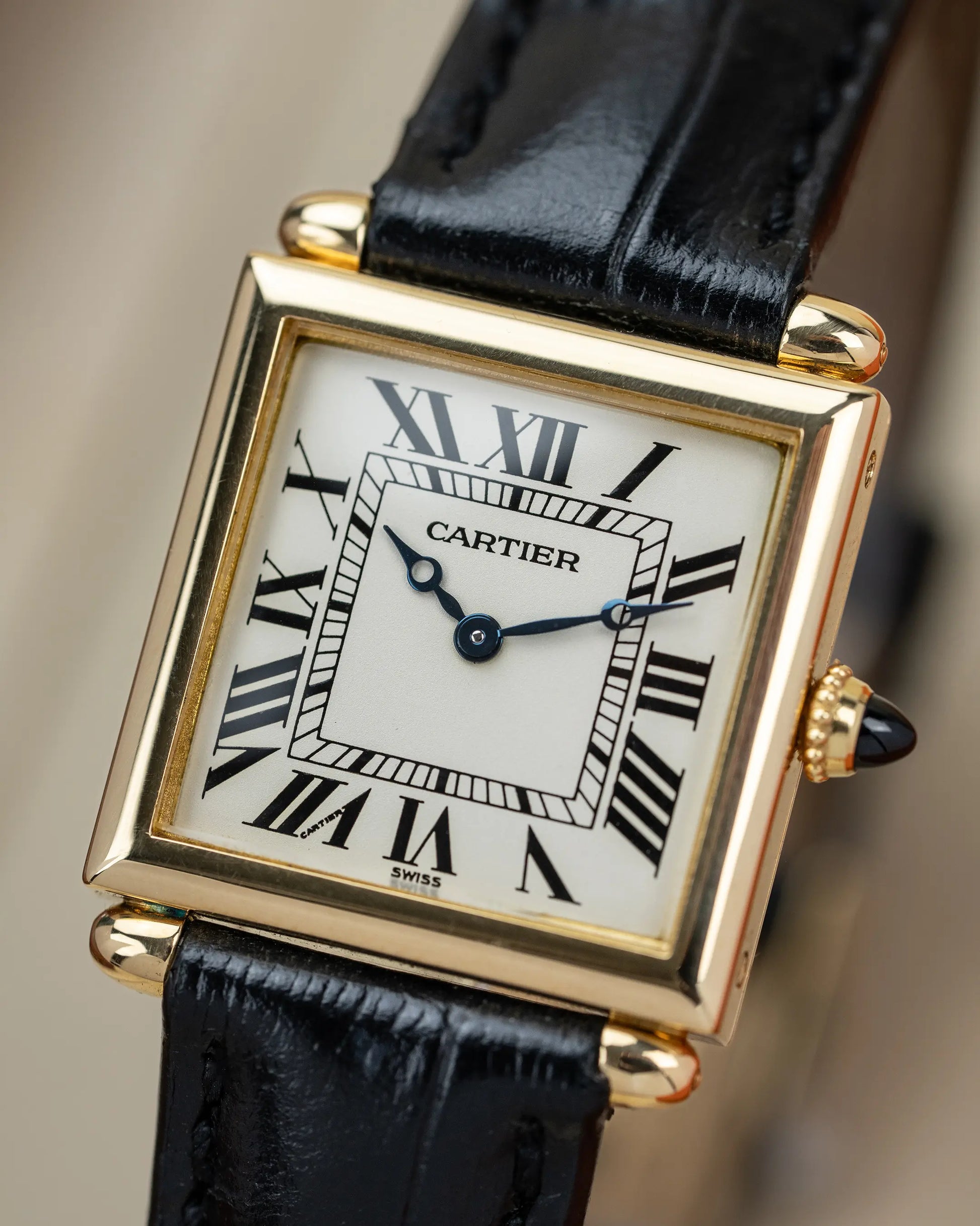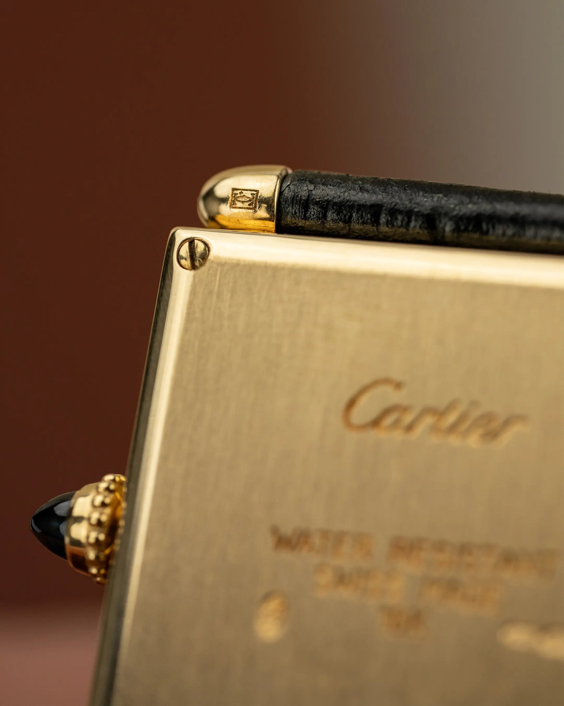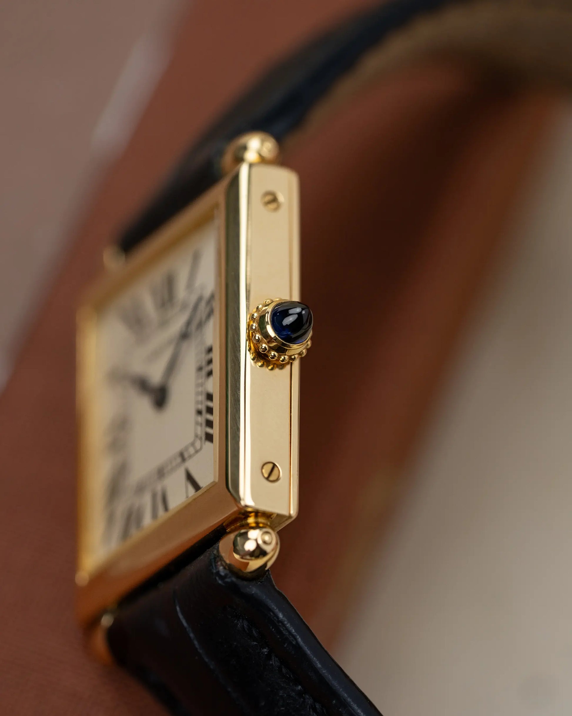 There are a few features we want to enlighten about this specific piece. The Obus obviously features the iconic design features we all know from Cartier. The classic Roman numerals. Now let’s dive into the case of this Obus which is obviously fitted with the iconic Roman numerals, but this isn’t your regular tank like we already said. The 18K Gold Obus is fitted with blue steel Breguet hands, in stead of the ‘regular’ sword-shaped hands we usually see at Cartier.