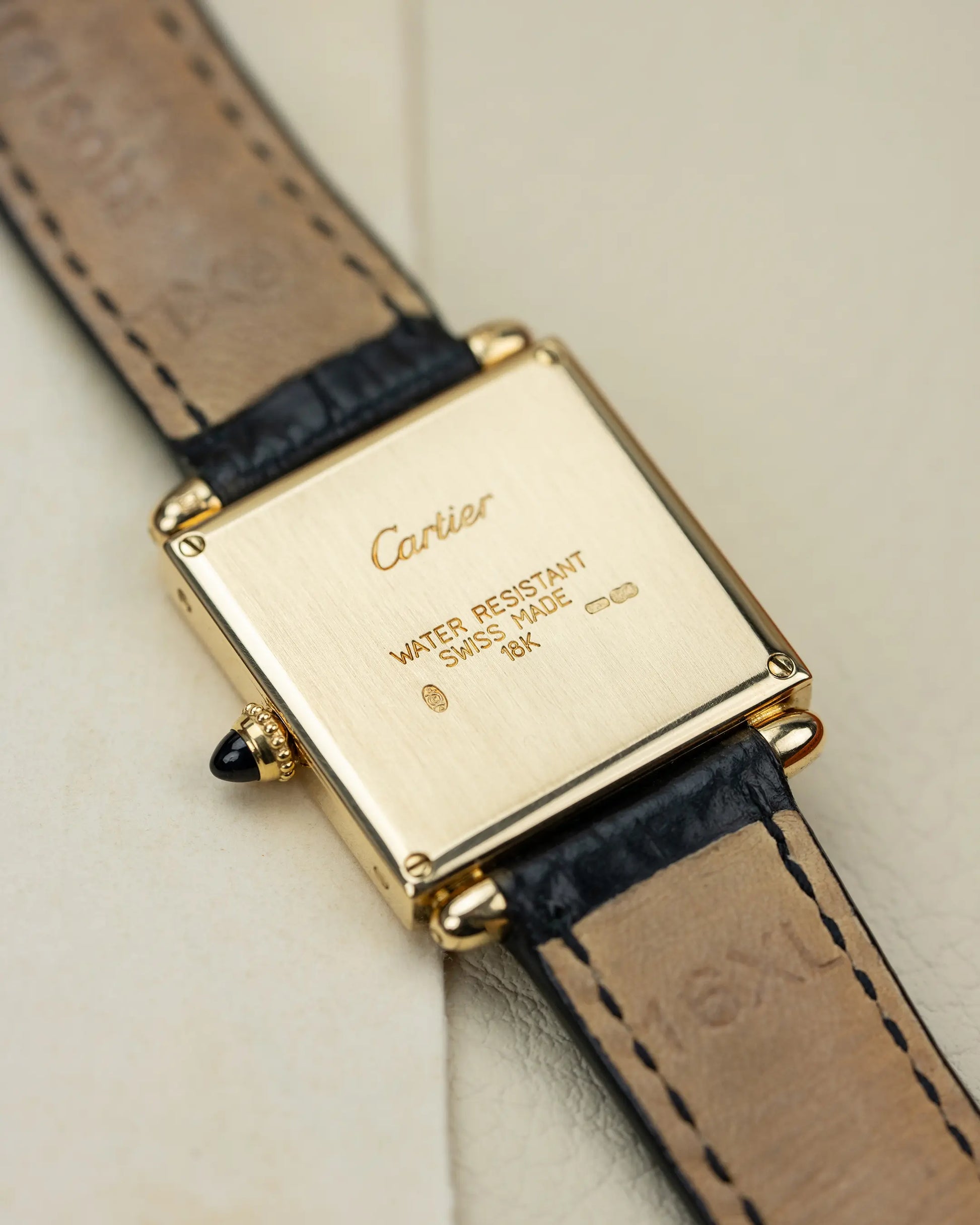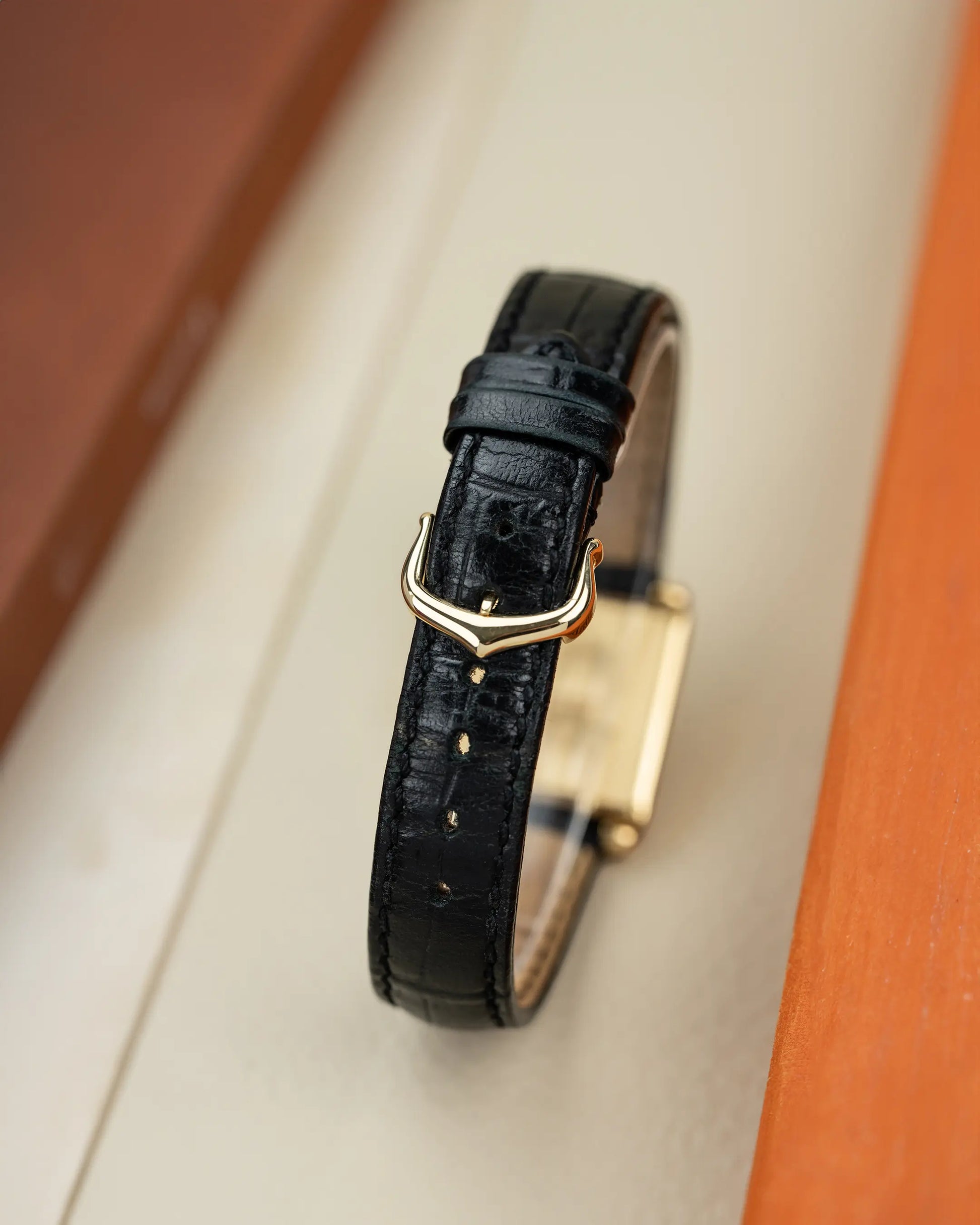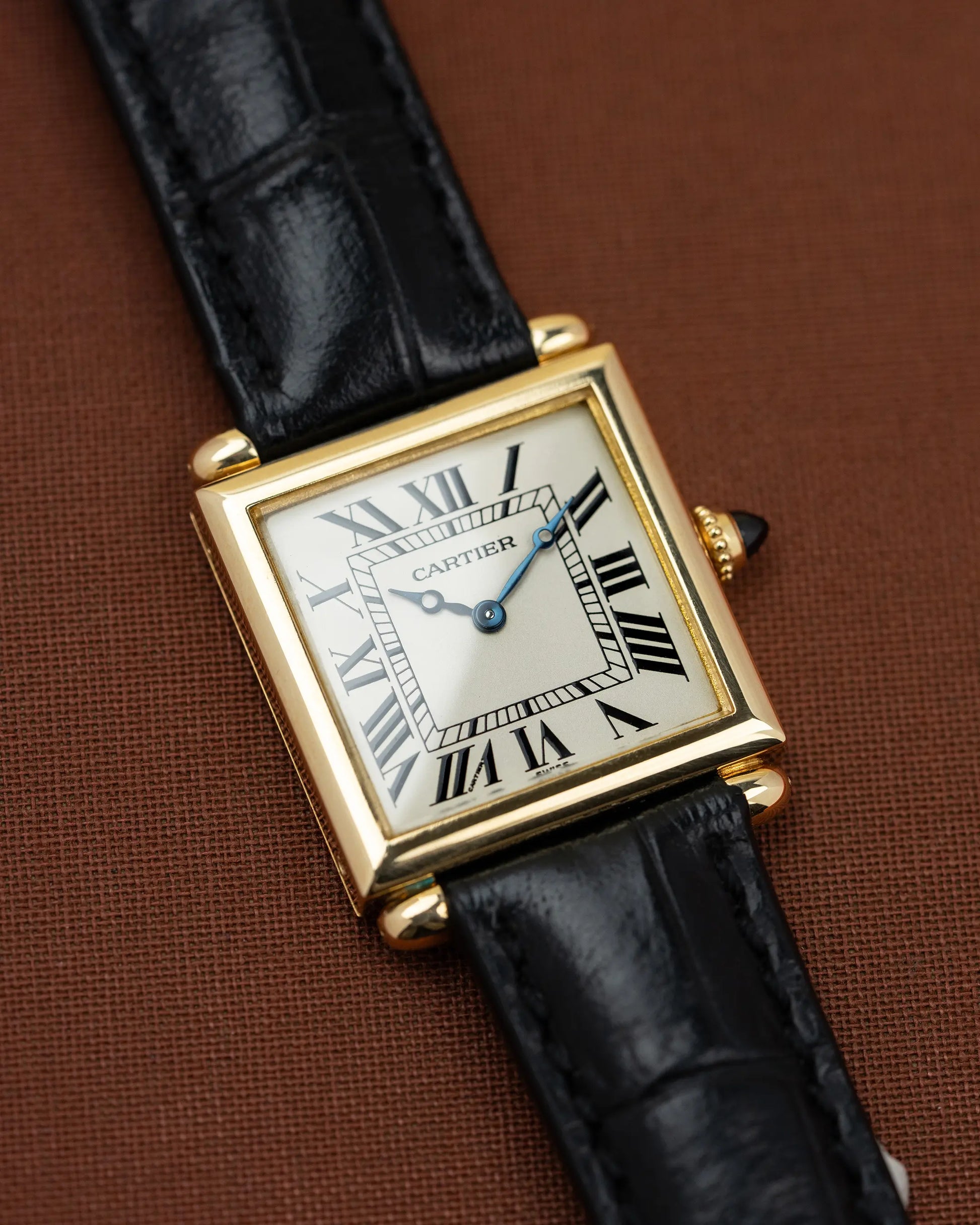 There are a few features we want to enlighten about this specific piece. The Obus obviously features the iconic design features we all know from Cartier. The classic Roman numerals. Now let’s dive into the case of this Obus which is obviously fitted with the iconic Roman numerals, but this isn’t your regular tank like we already said. The 18K Gold Obus is fitted with blue steel Breguet hands, in stead of the ‘regular’ sword-shaped hands we usually see at Cartier.