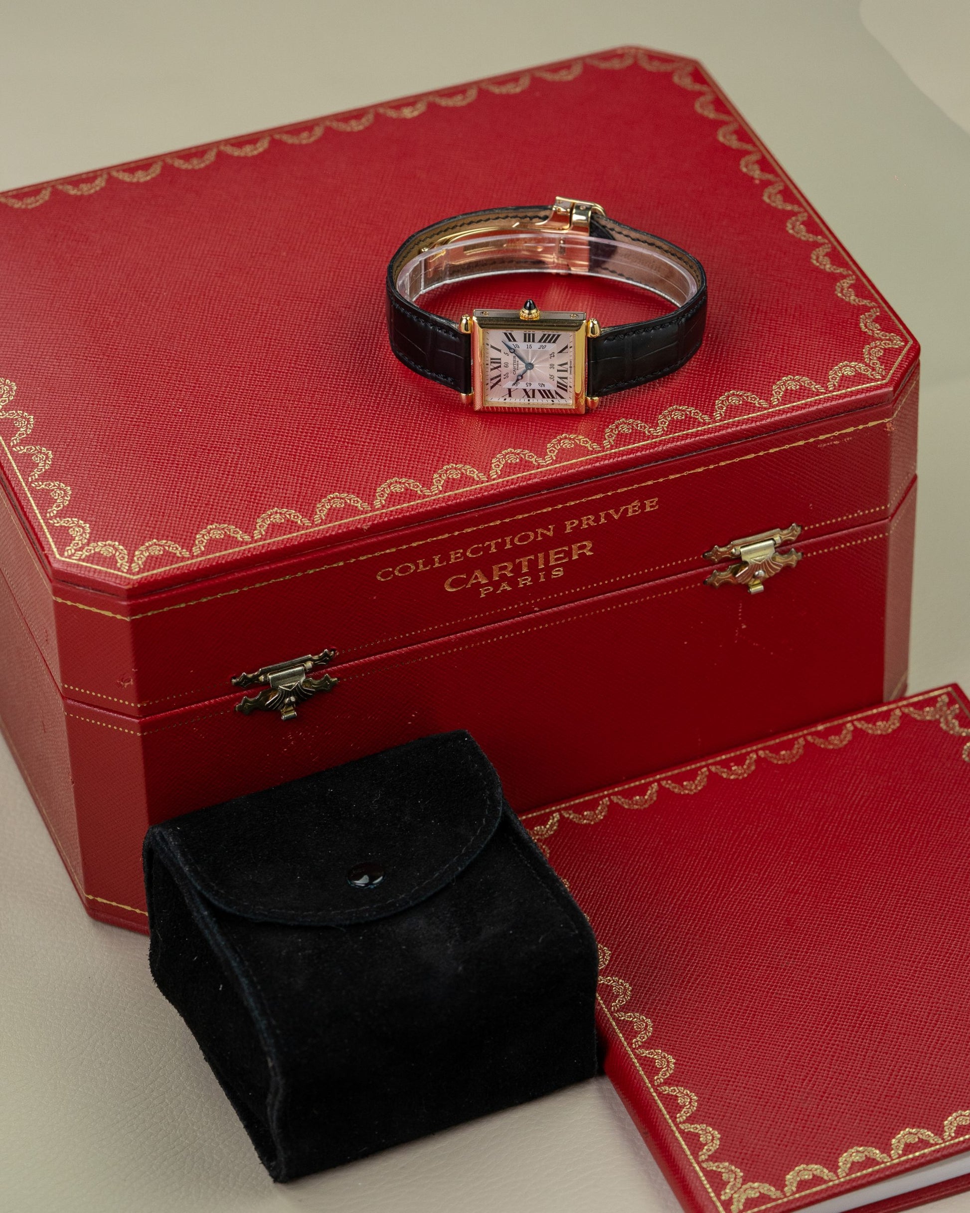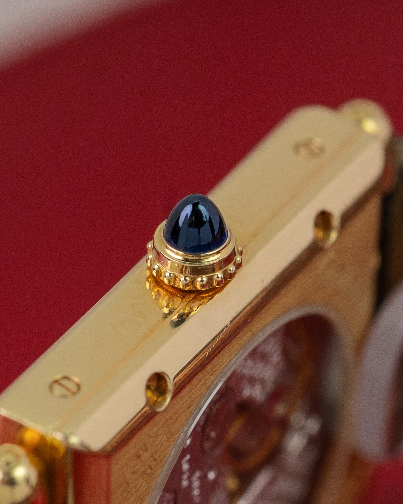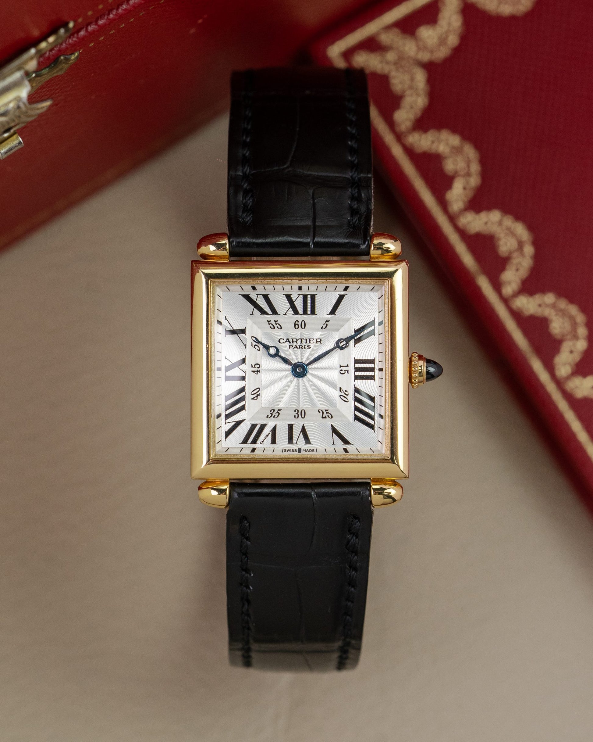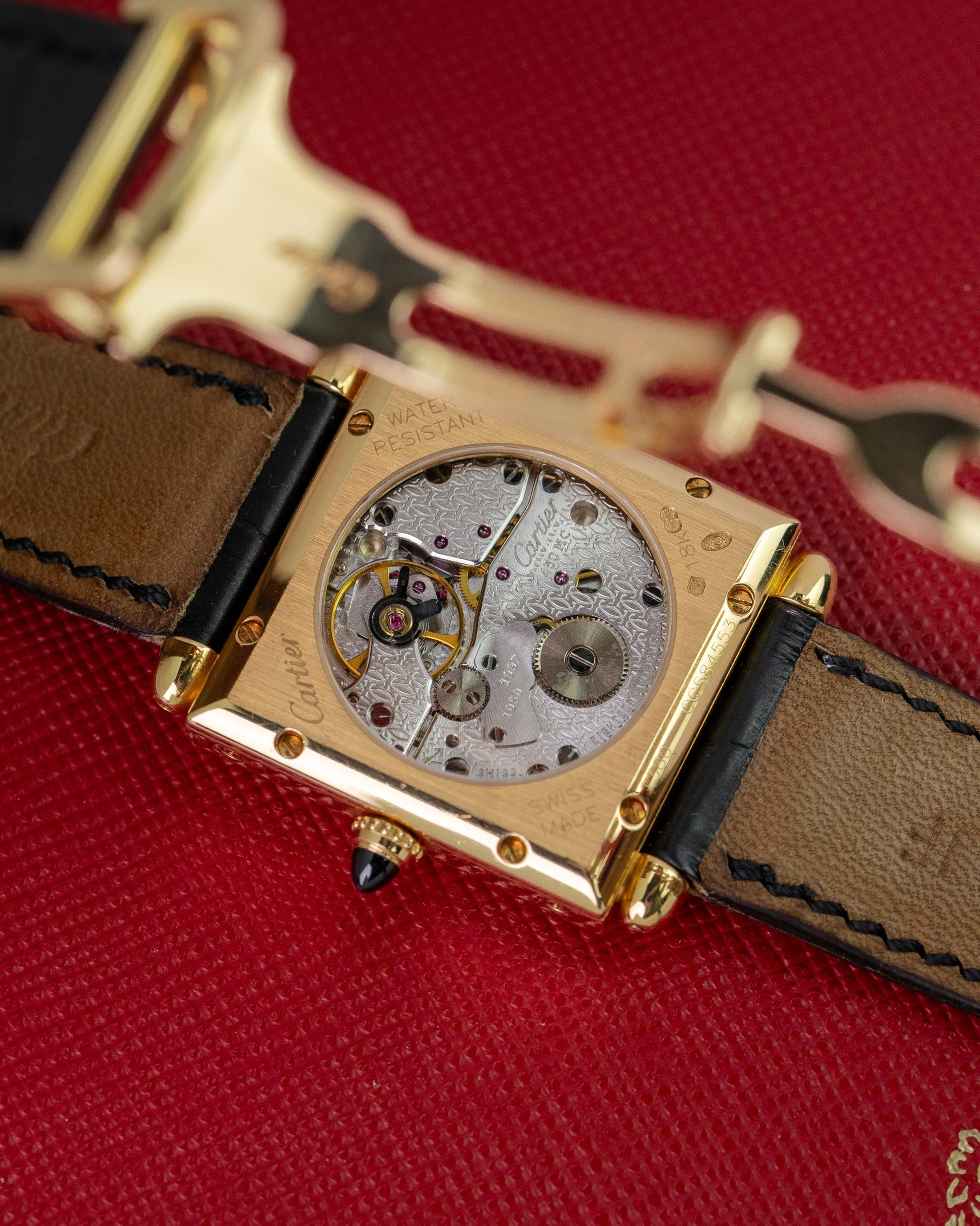 The CPCP Collection is inspired by Cartier’s iconic designs from the early 20th century. These watches were crafted with the finest materials and showcased exquisite craftsmanship, often featuring complications such as tourbillons, perpetual calendars, and minute repeaters. This classic Tank Obus is crafted in 18K Yellow Gold and was first introduced in 1923. The casebook allows you to have a look at the manual winding movement.