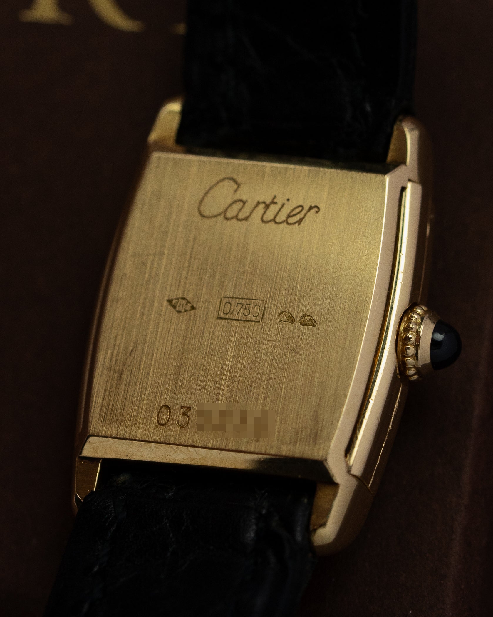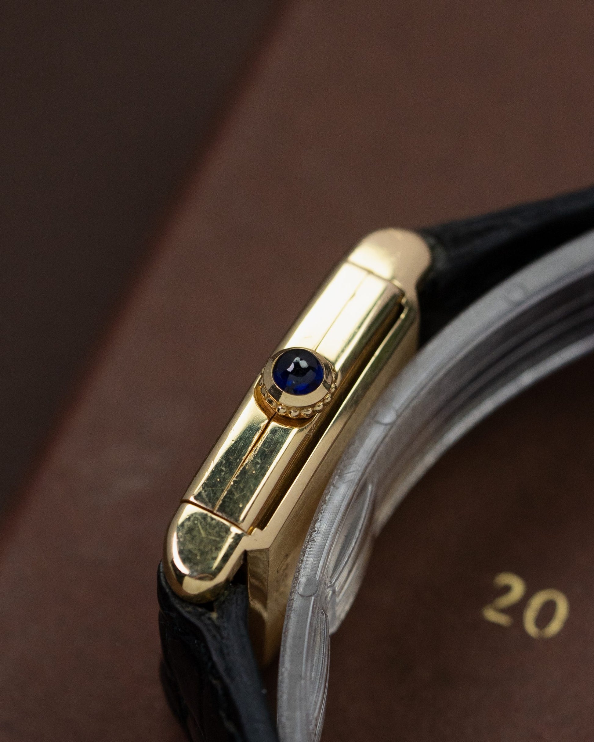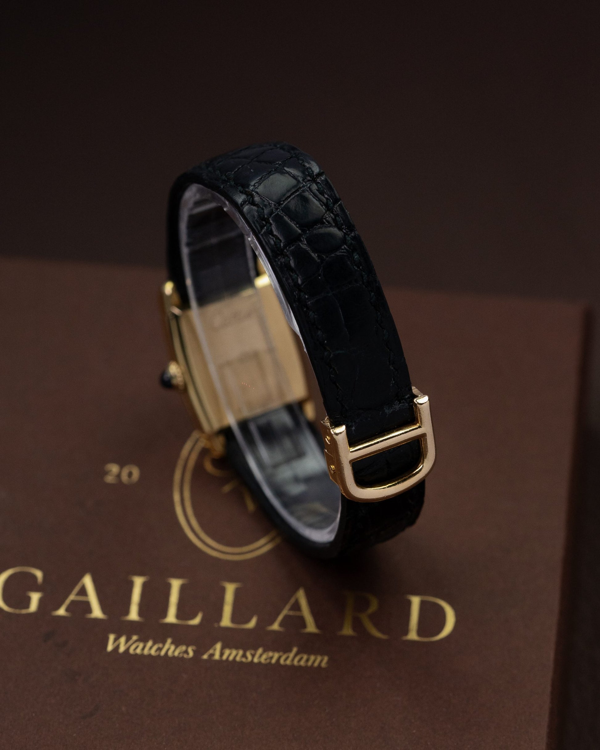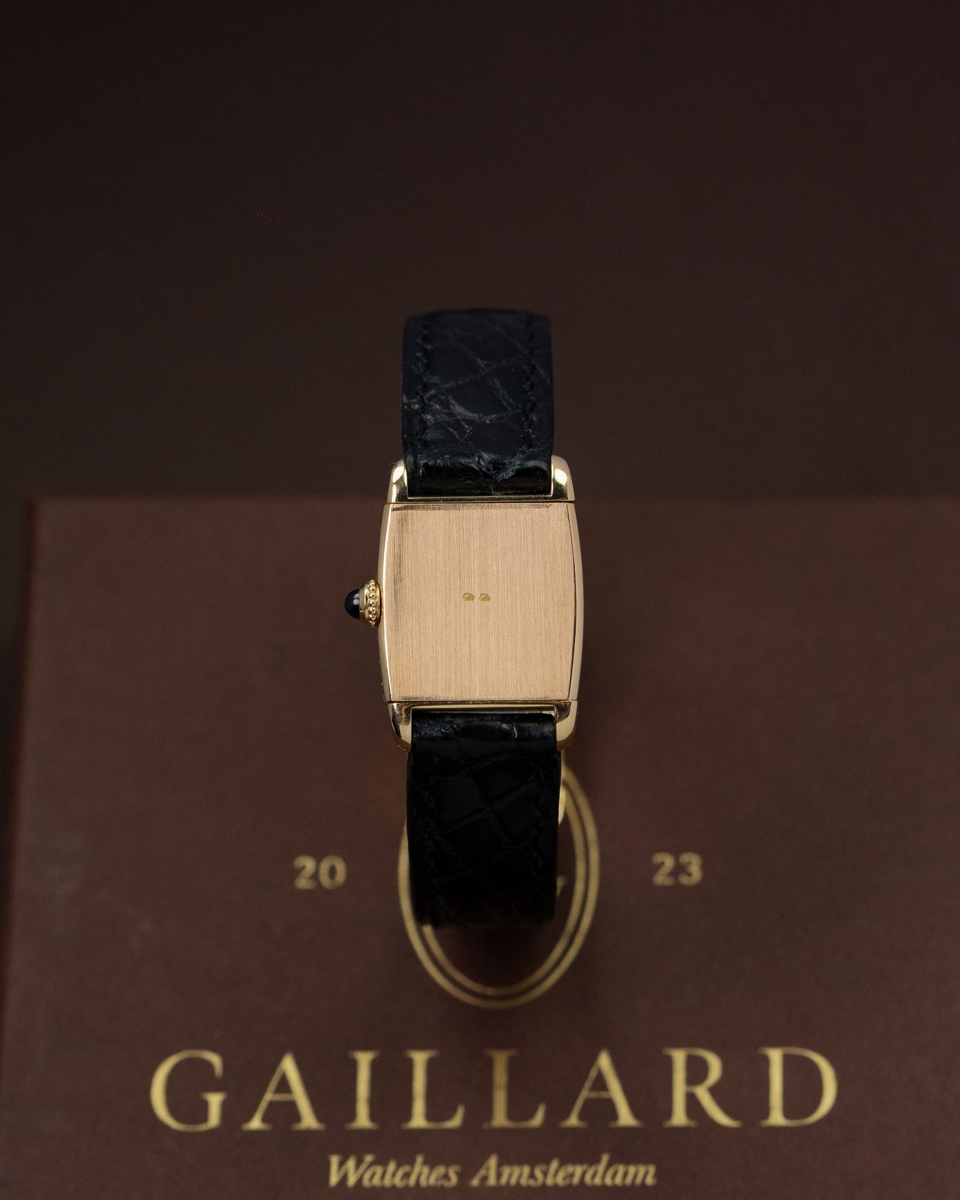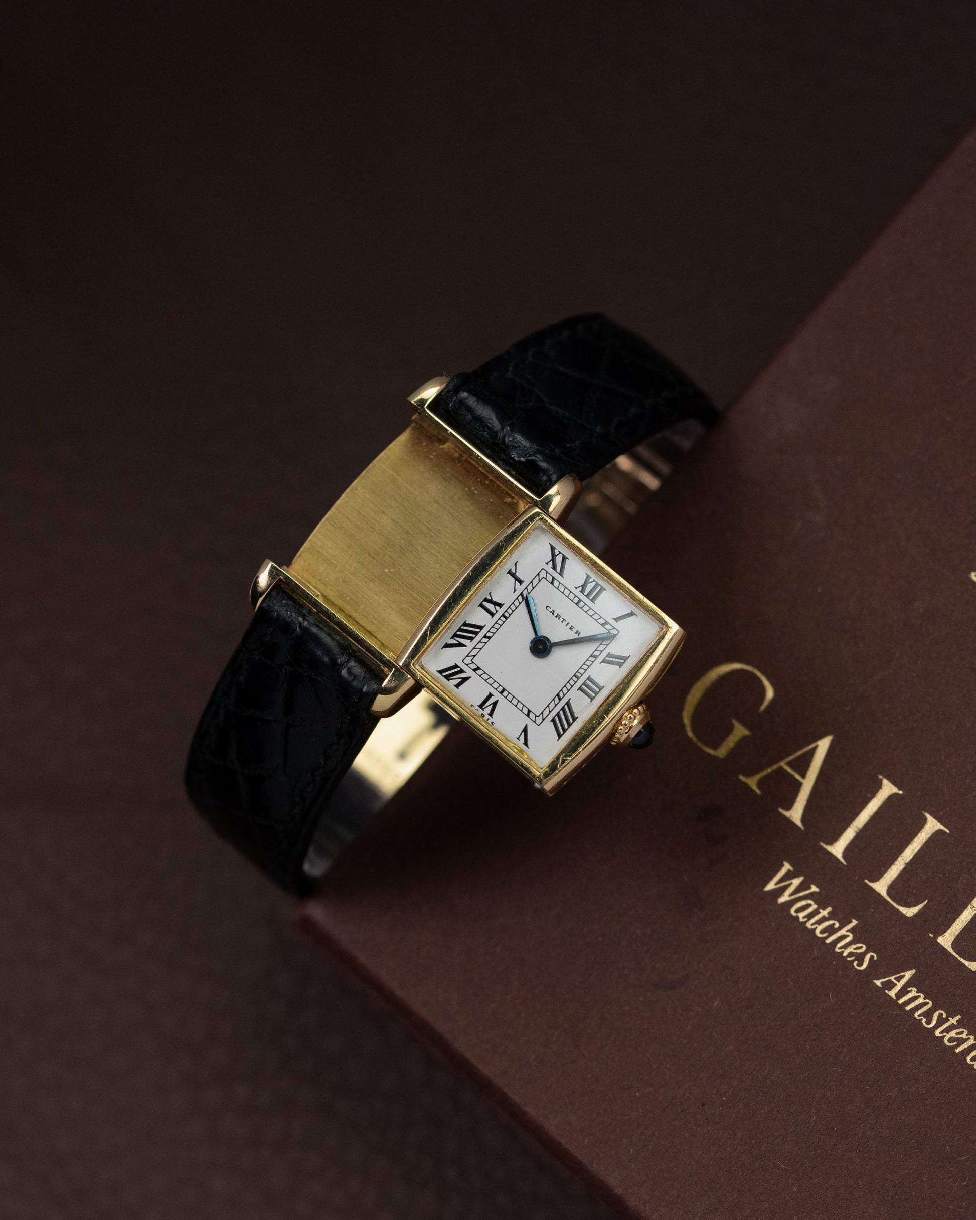 Beneath the mineral glass, you will find an original, perfectly preserved white dial with Roman numerals and the Paris mark at the 6 o’clock position. The case is complemented by an original Cayman strap with a period-correct Cartier folding clasp.