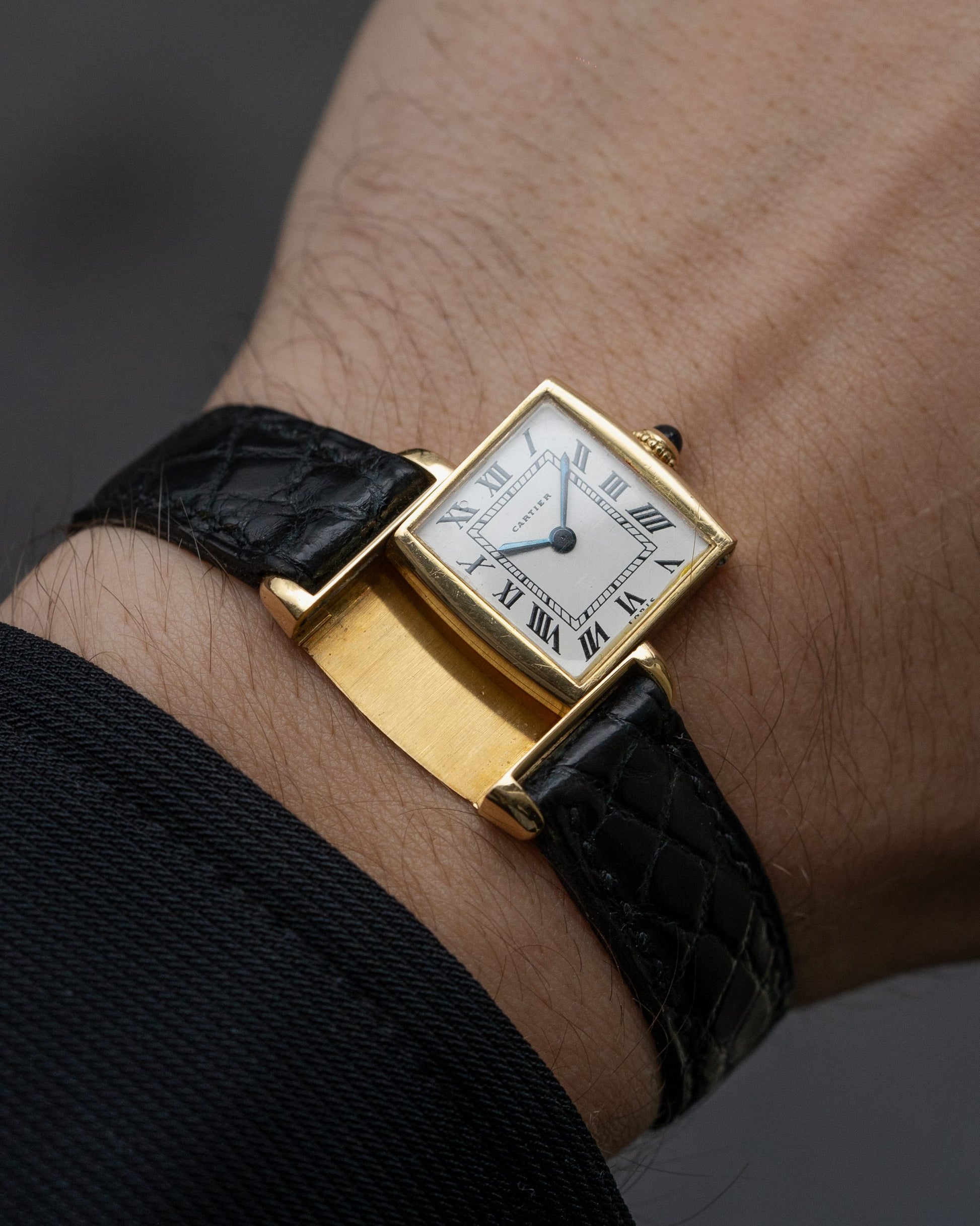 With the growing interest in special Cartier watches that have hit the market in recent years, we are continuously amazed by the unique and lesser-seen models produced by Cartier during the 1960s and 70s. This particular one is definitely something to remember or keep with you forever. When you think of a Reverso, you probably picture the well-known model by Jaeger-LeCoultre, but that’s not the case here. What you see before you is the Cartier Reverso. These models are typically available in two sizes, and we are offering the smaller version.