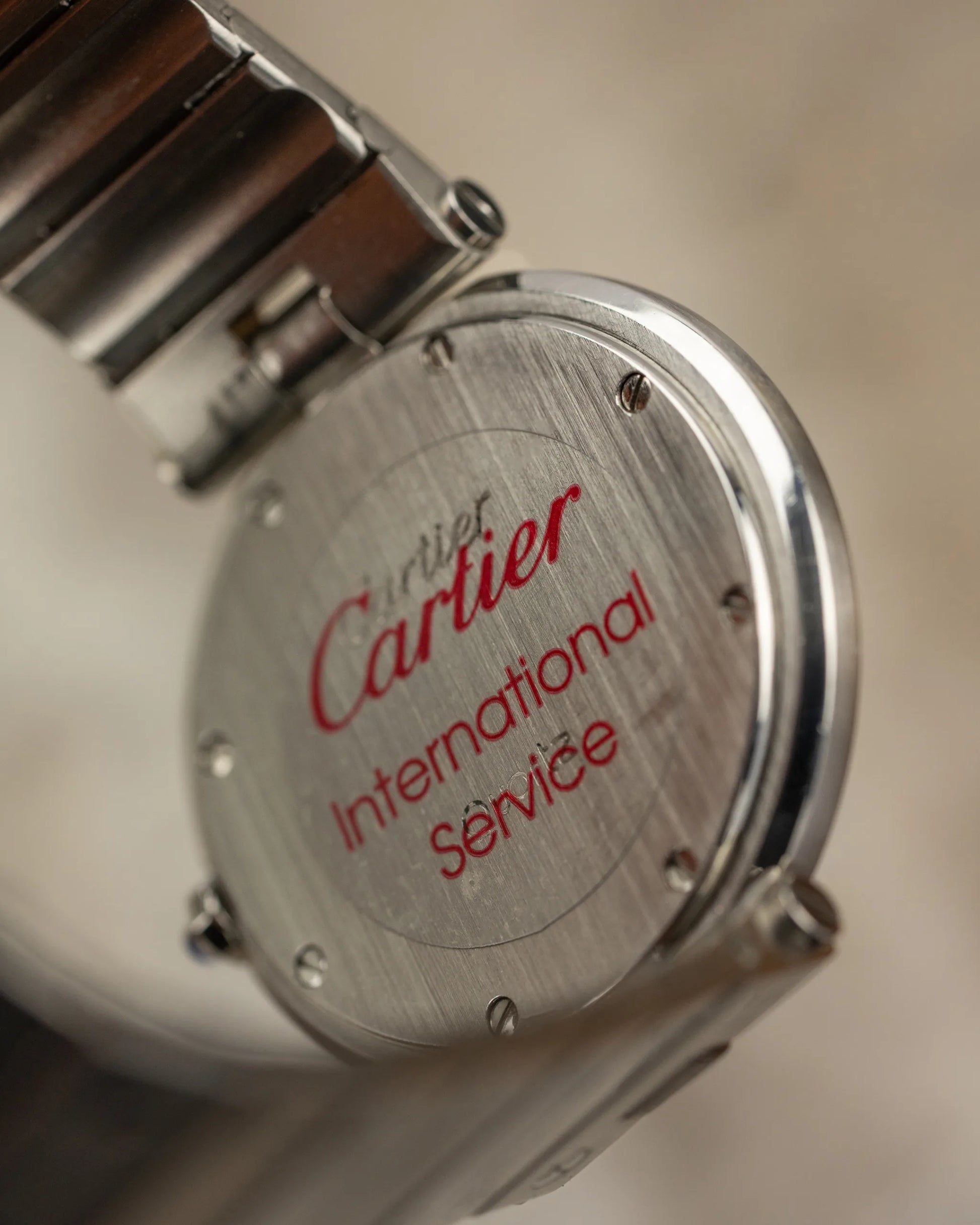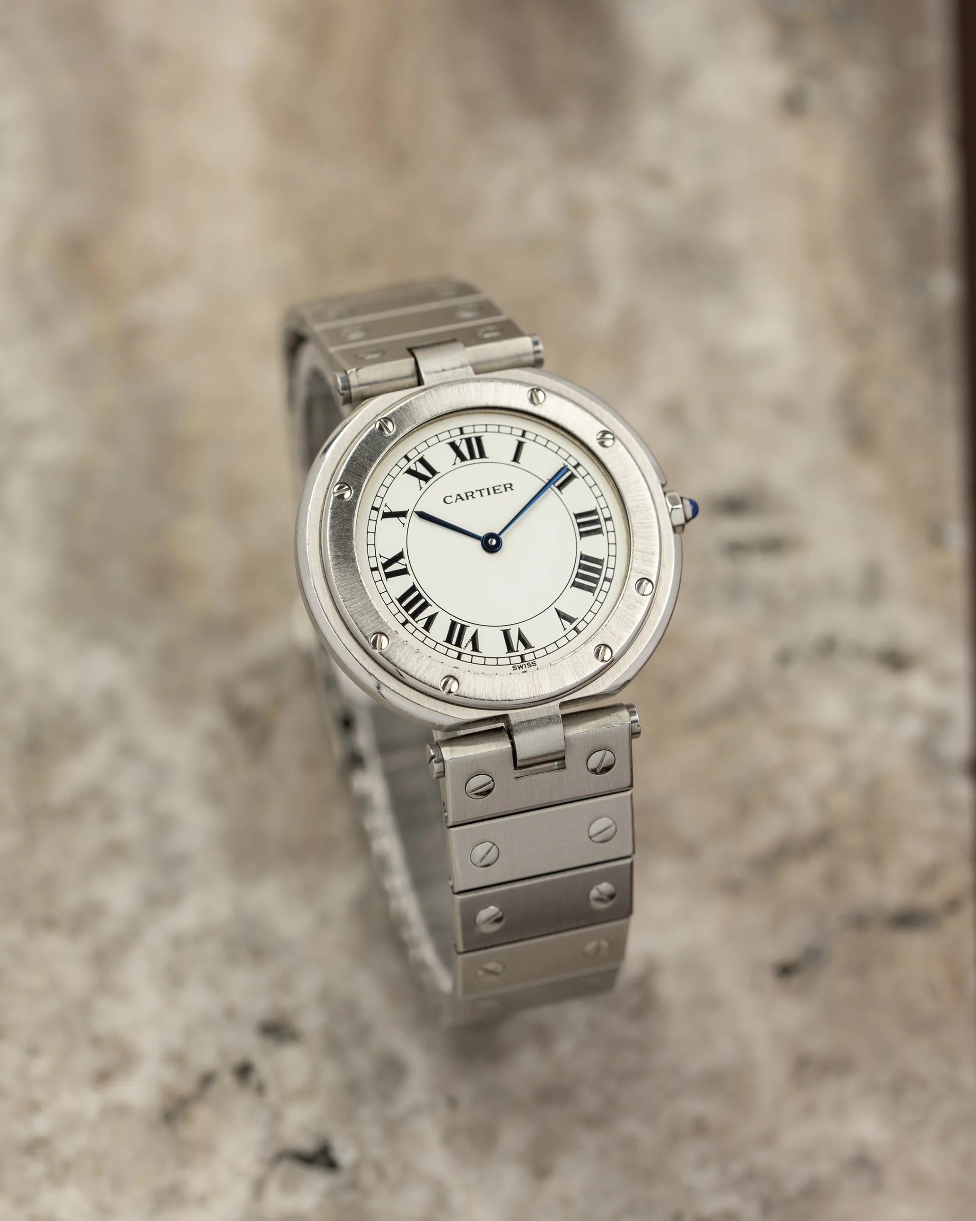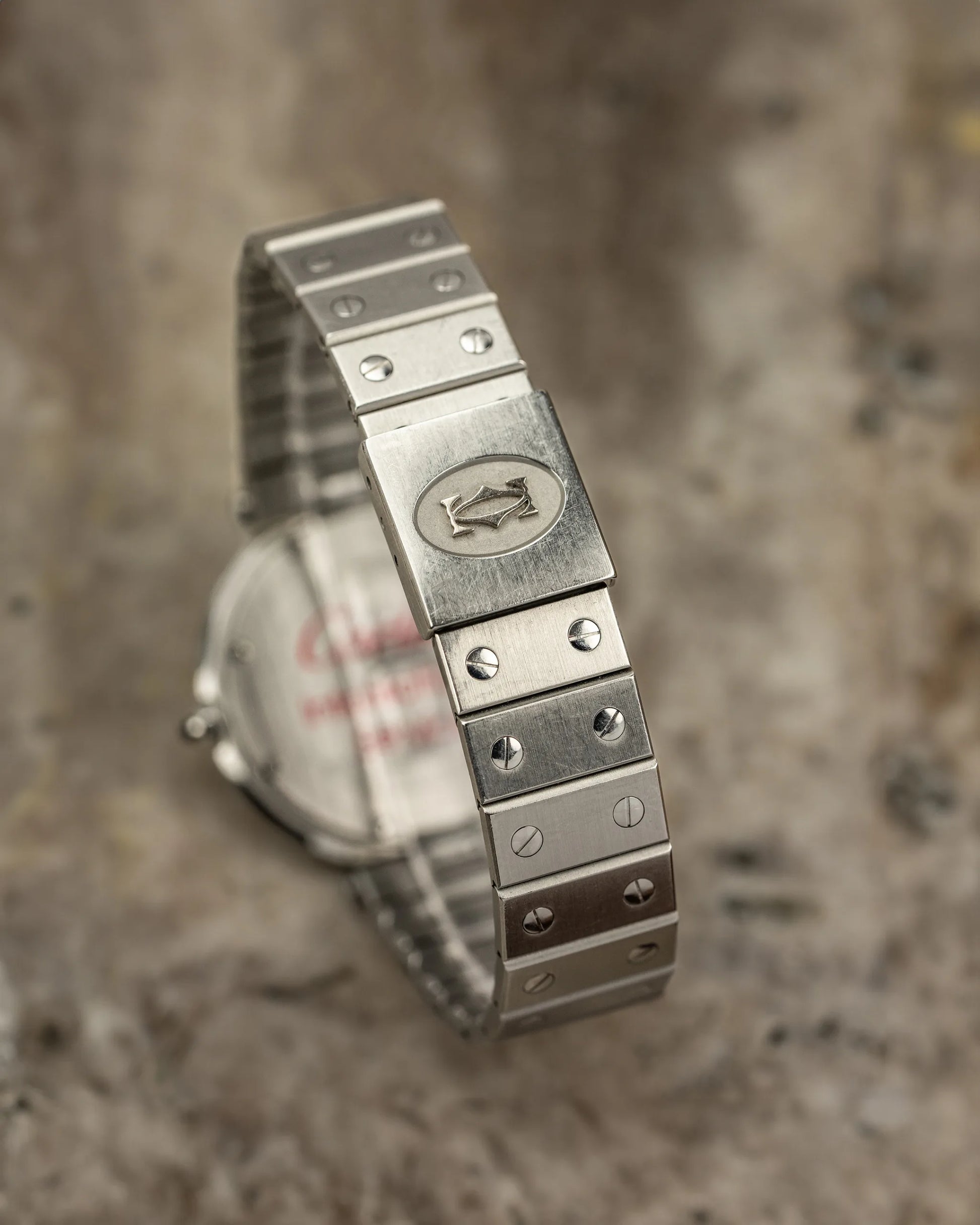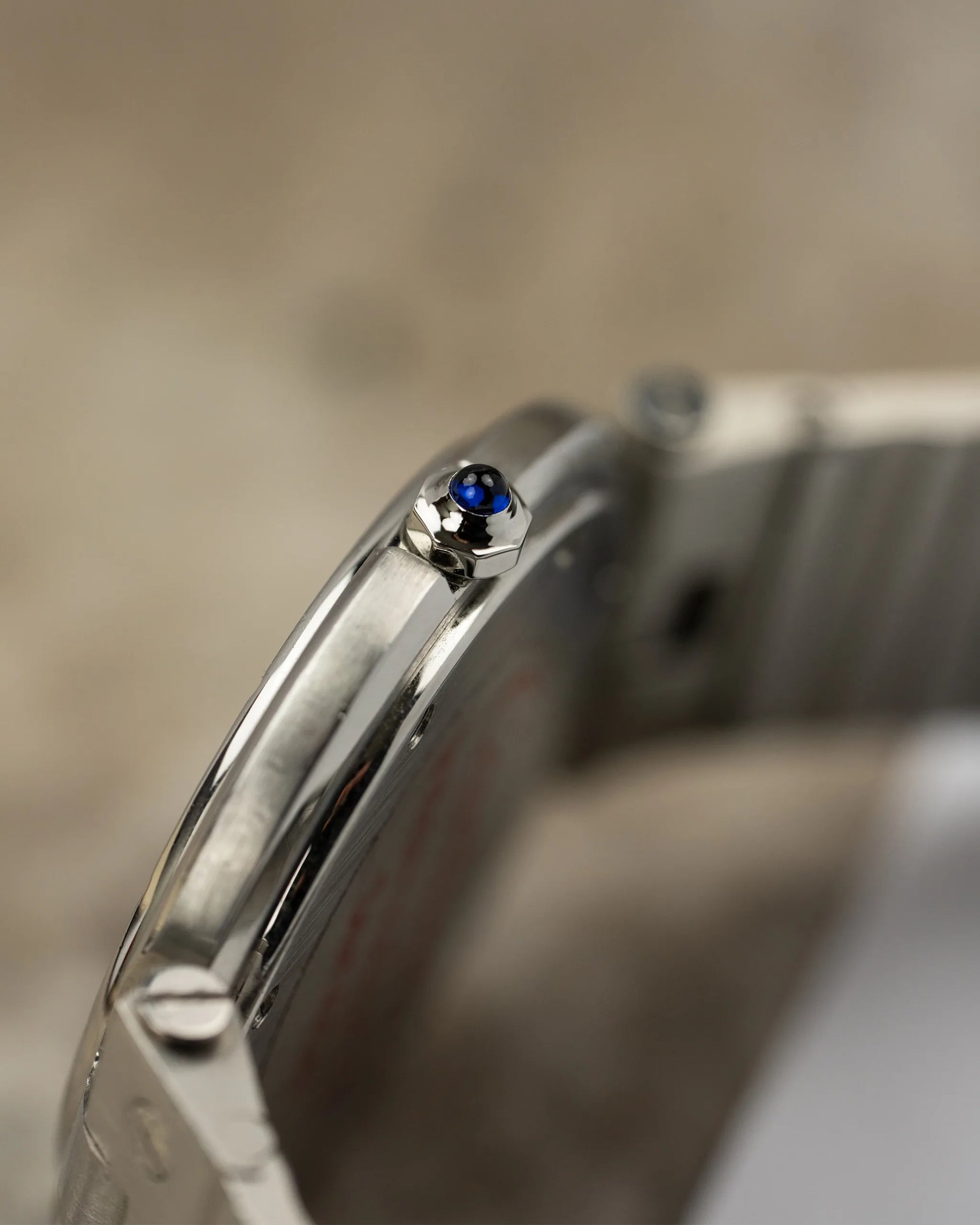 The Santos evolved through time, and one of those evolving moments was the Santos Vendôme Ronde collection. This particular features a round case shape that is borrowed from the Cartier Ronde. The round case together with its extended ‘shoulder’ lugs on the 6 and 12 o’clock position that holds a bar that connects to the bracelet is a perfect example of Cartier’s innovative designs and craftsmanship.