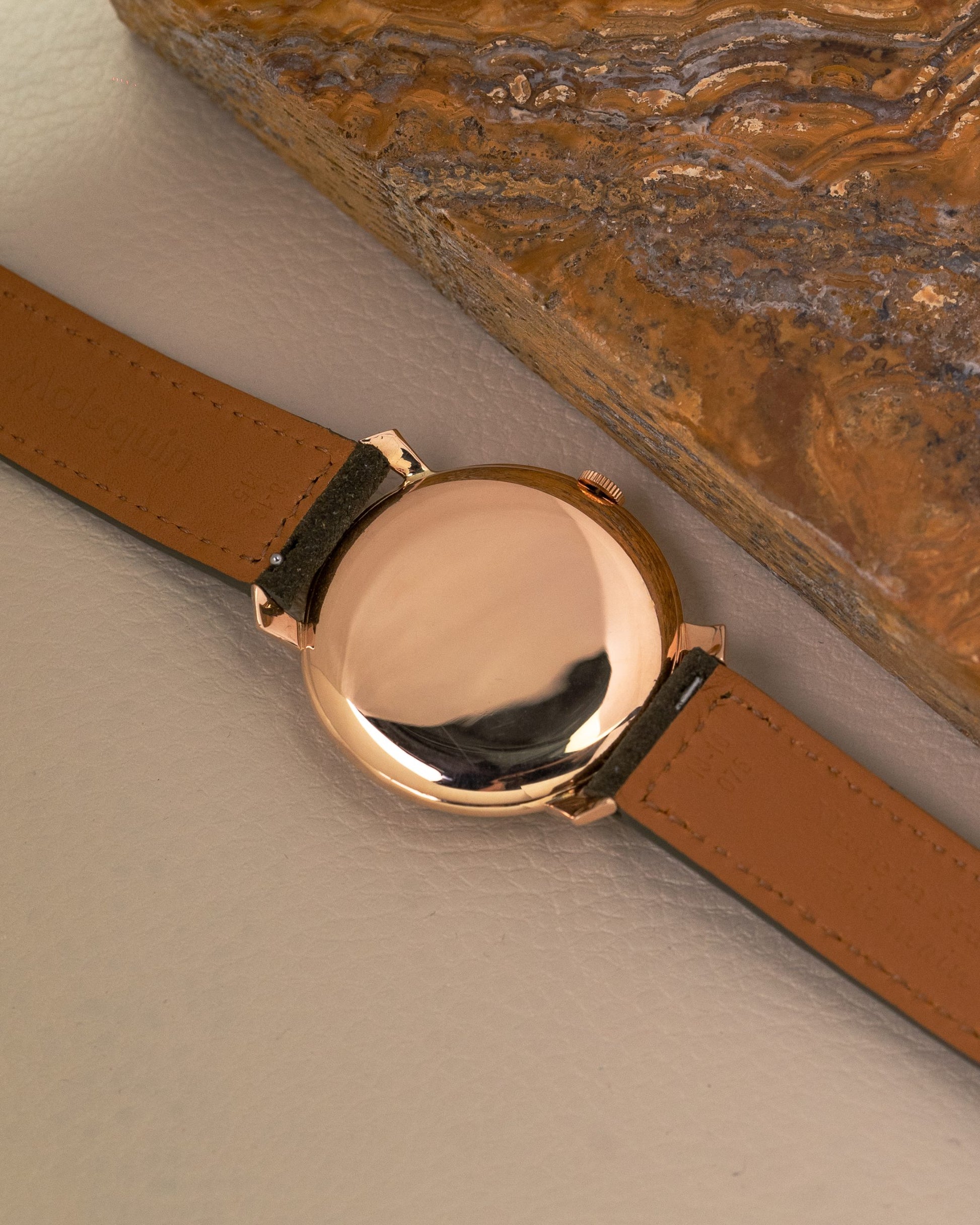 We are slowly gravitating more towards timeless and different design aesthetics, which makes finding pieces like this even more satisfying. This Cal.89 is crafted in 18K Rose Gold which is uncommon to see. There are many tiny details to be found on the dial which we love. The dial is complimented with Rose Gold Arabic Numerals on the quarter hour-markers which is a stunning combination together with the Alpha hands. There is still one thing to mention. The so called ’Shark’ lugs is our favorite feature which doesn’t disturb its classy look, but rather adds depth to its aesthetic.