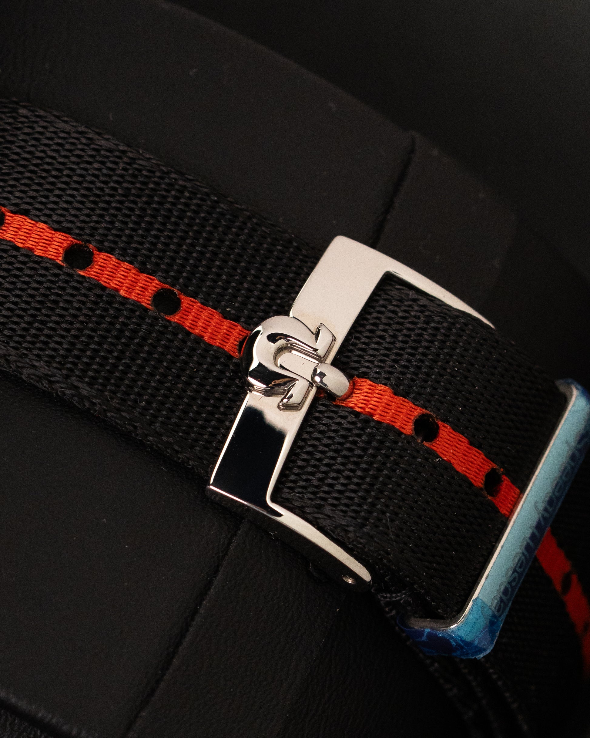 The minute subdial at the three o'clock position, displays the first three minutes of time in orange referring to the time Ultraman could stay in superhero-mode. On the seconds subdial located on the 9 o'clock position, there is a hidden silhouette of Ultraman's profile. This detailed watch comes on a matching nato strap that adds a lot of charm.