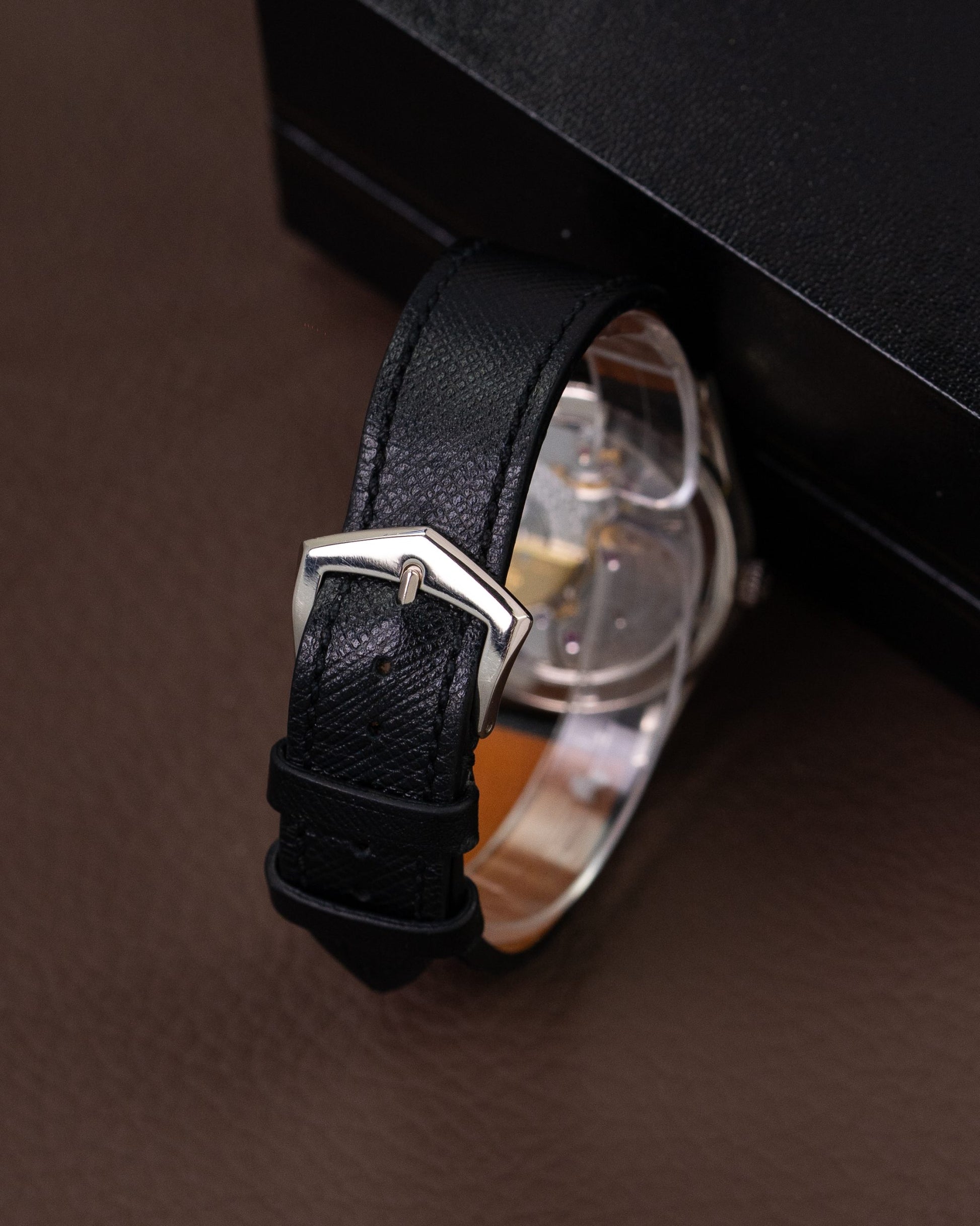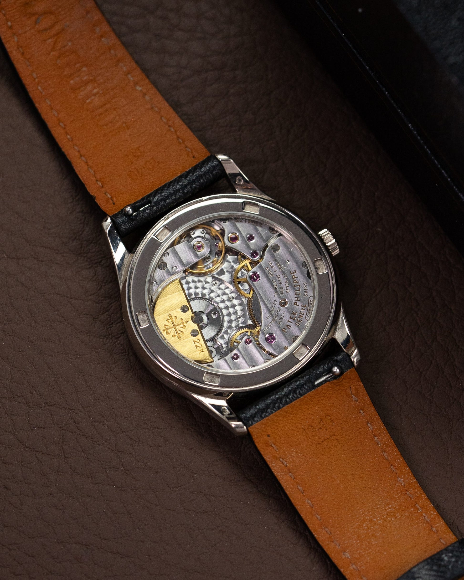 The dial is a deep black, featuring white gold Breguet numerals and hands. On the case back, a sapphire crystal reveals the masterpiece within: Patek Philippe’s caliber 240 movement with a 22K yellow gold micro rotor. The case is in very good condition, showcasing high-polished lugs and a matte finish on the sides. It comes with a strap of your choice and includes the original white gold Patek Philippe buckle. The crown is adorned with the Calatrava cross logo.