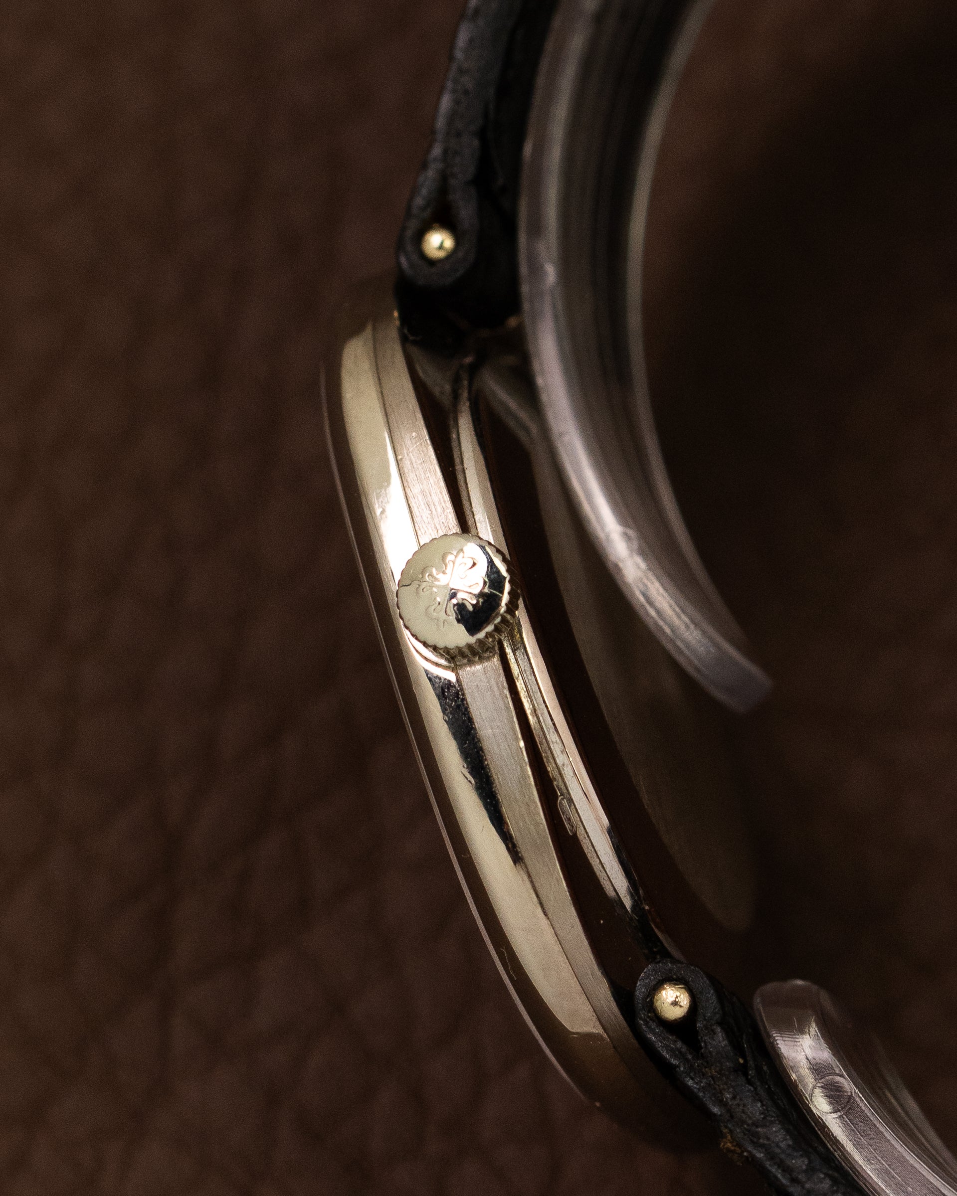 This particular example is the ref. 3648/1G, with the "G" indicating that the watch is crafted in 18K white gold (“or gris”). It comes fitted with a sleek black leather strap, completed by its original 18K white gold Patek Philippe buckle.
