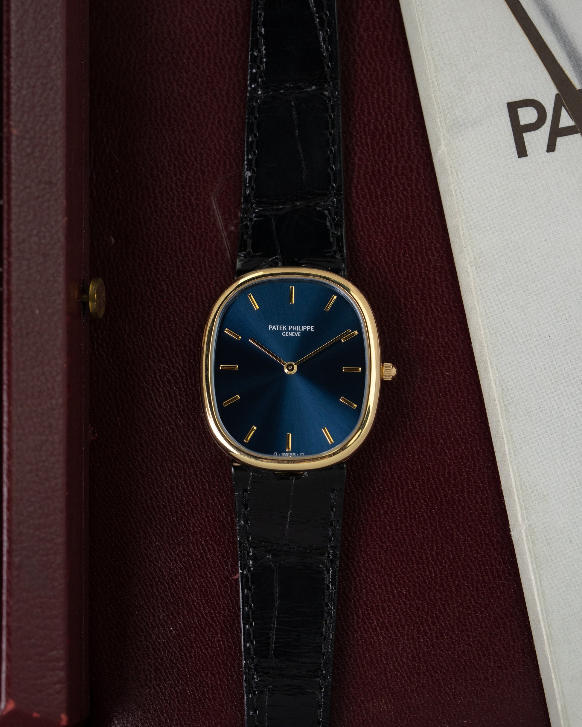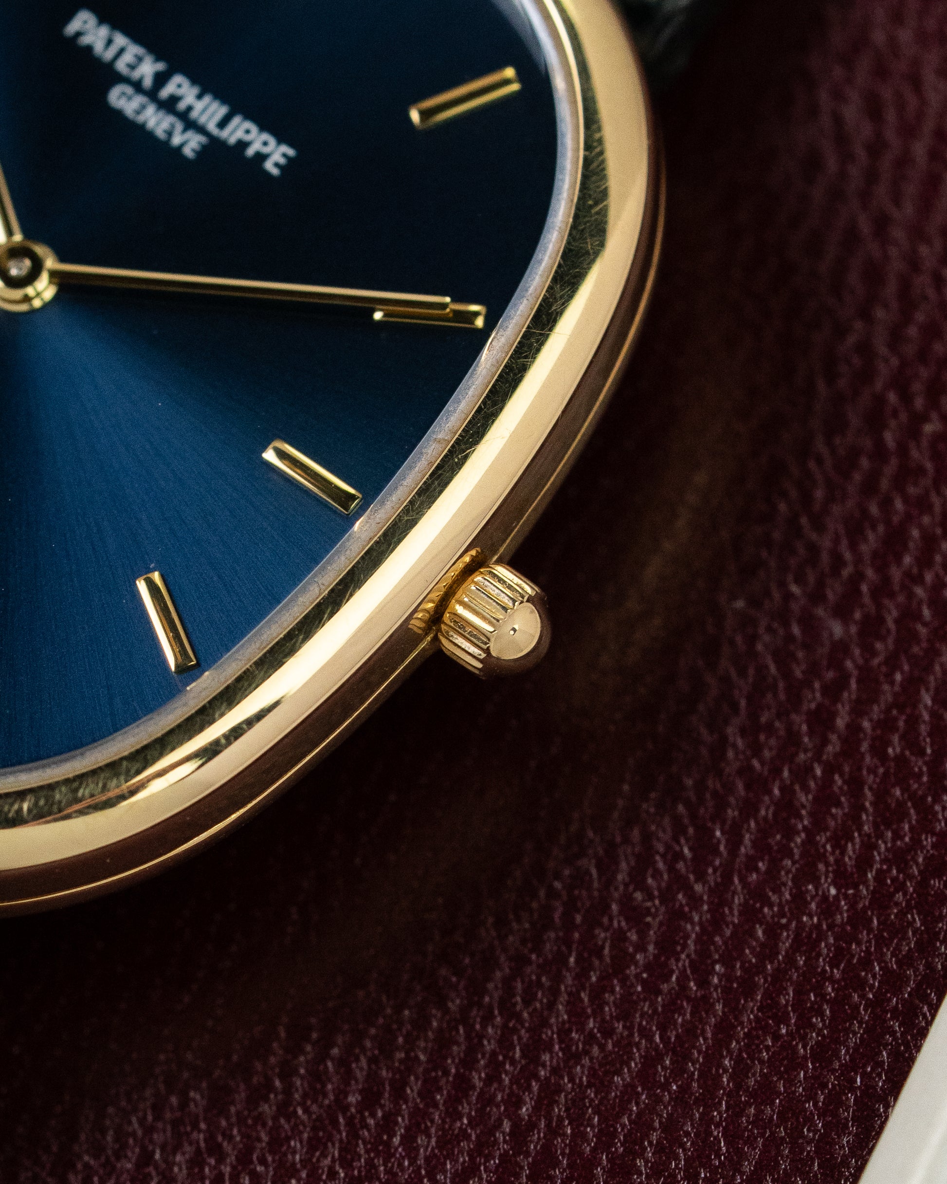 The Patek Philippe 3738, is an all-time classic within the collection of the house. The 18K yellow gold case measures 31.1mm x 35.6mm and is considered 'Jumbo' size for it's era. The dark blue dial has the iconic beautiful sunburst finish. Displayed on the dial is only the hour and minutes hand, making this timepiece look very clean.