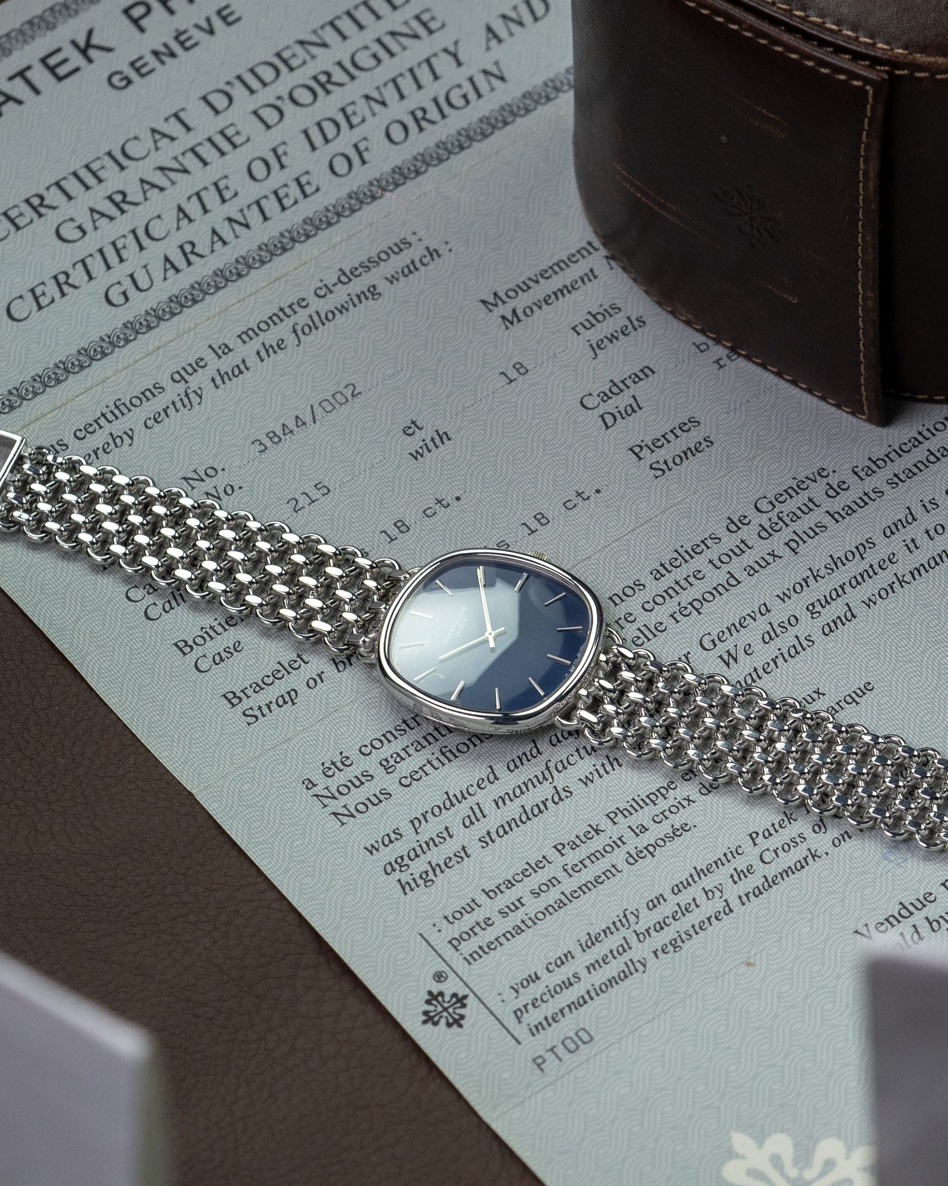 We present the Patek Philippe 3844, which was produced in several variations. This particular model is crafted in 18K white gold and features a blue dial that displays characteristic aging, similar to other models of its kind. In our opinion, this adds a special touch to its appeal. The watch is powered by a manual winding movement, which has recently been serviced. Accompanied by the original papers, this timepiece is ready for the collector or enthusiast who is looking for something beyond the ordinary Patek Philippe.