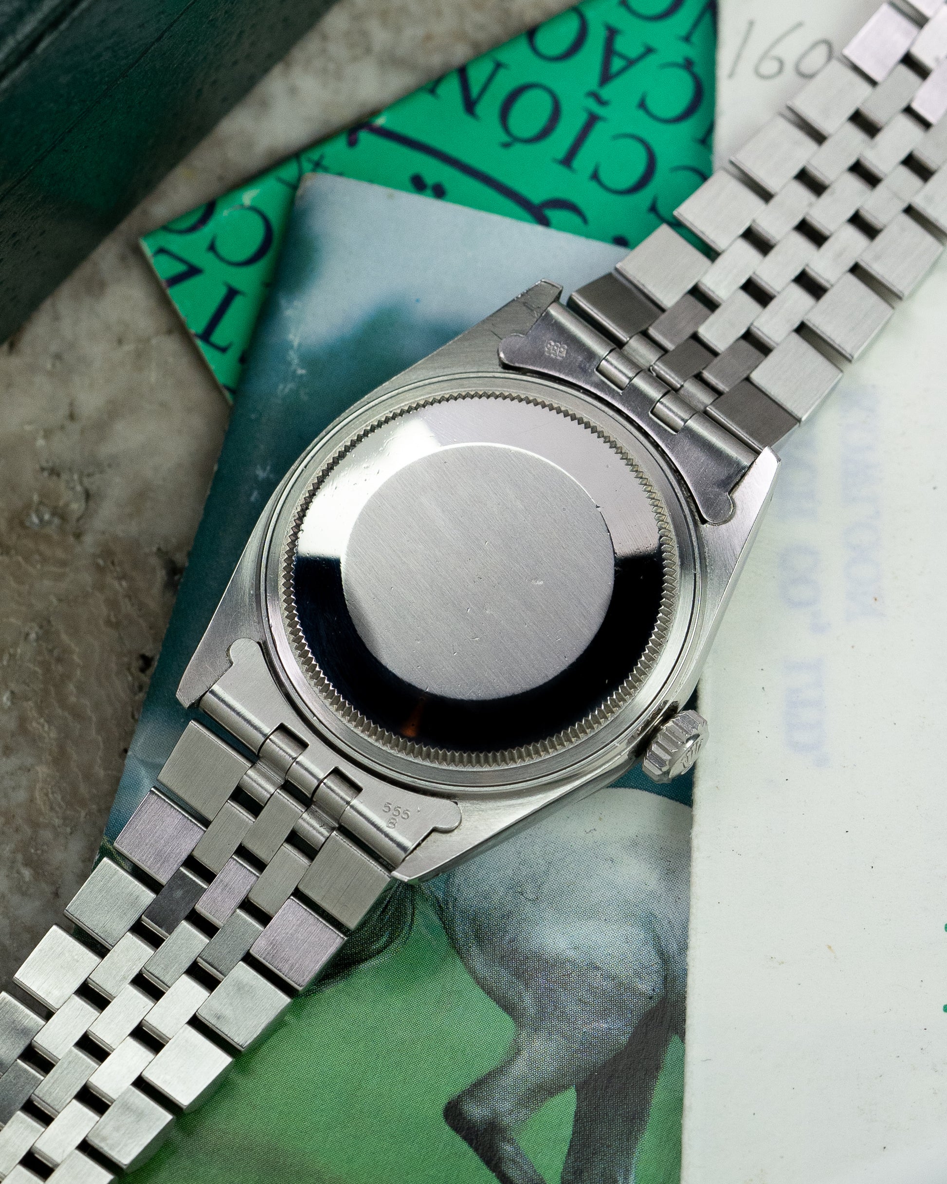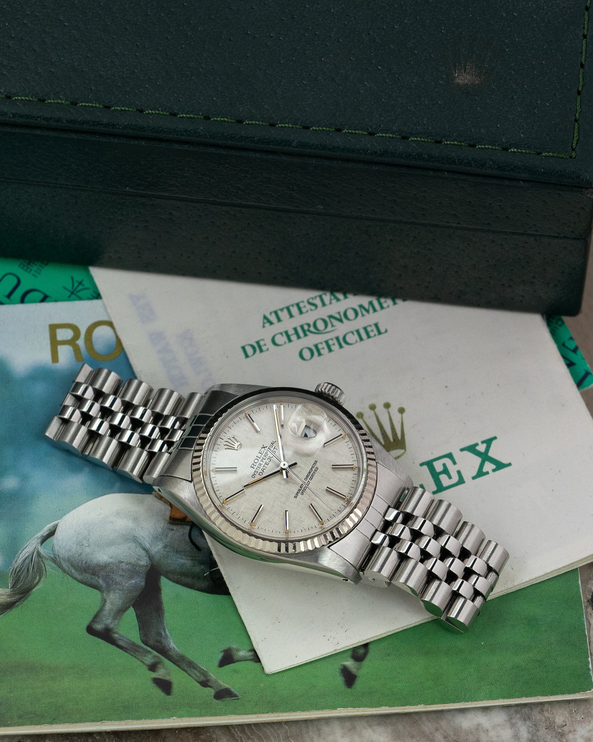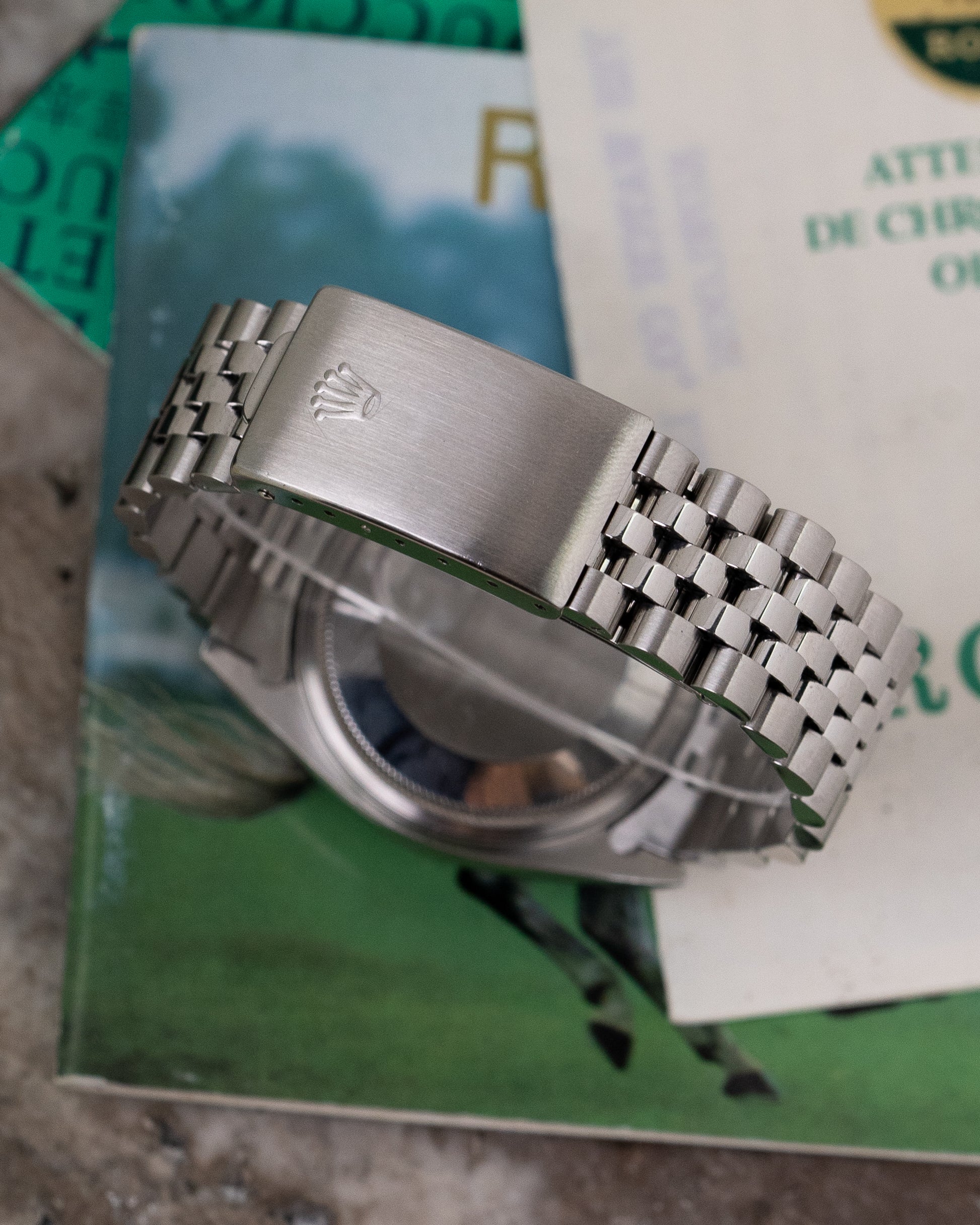 This Datejust 16014 is featured with a so called ‘Linen’ dial which gives the watch that special touch we truly love about watches. The ‘Linen’ dial is so much more playful than for example a sunburst dial, and is for someone who loves to move different from the common. This particular example is just how we like them. A thick & sharp case together with a Jubilee bracelet which shows almost no stretch!