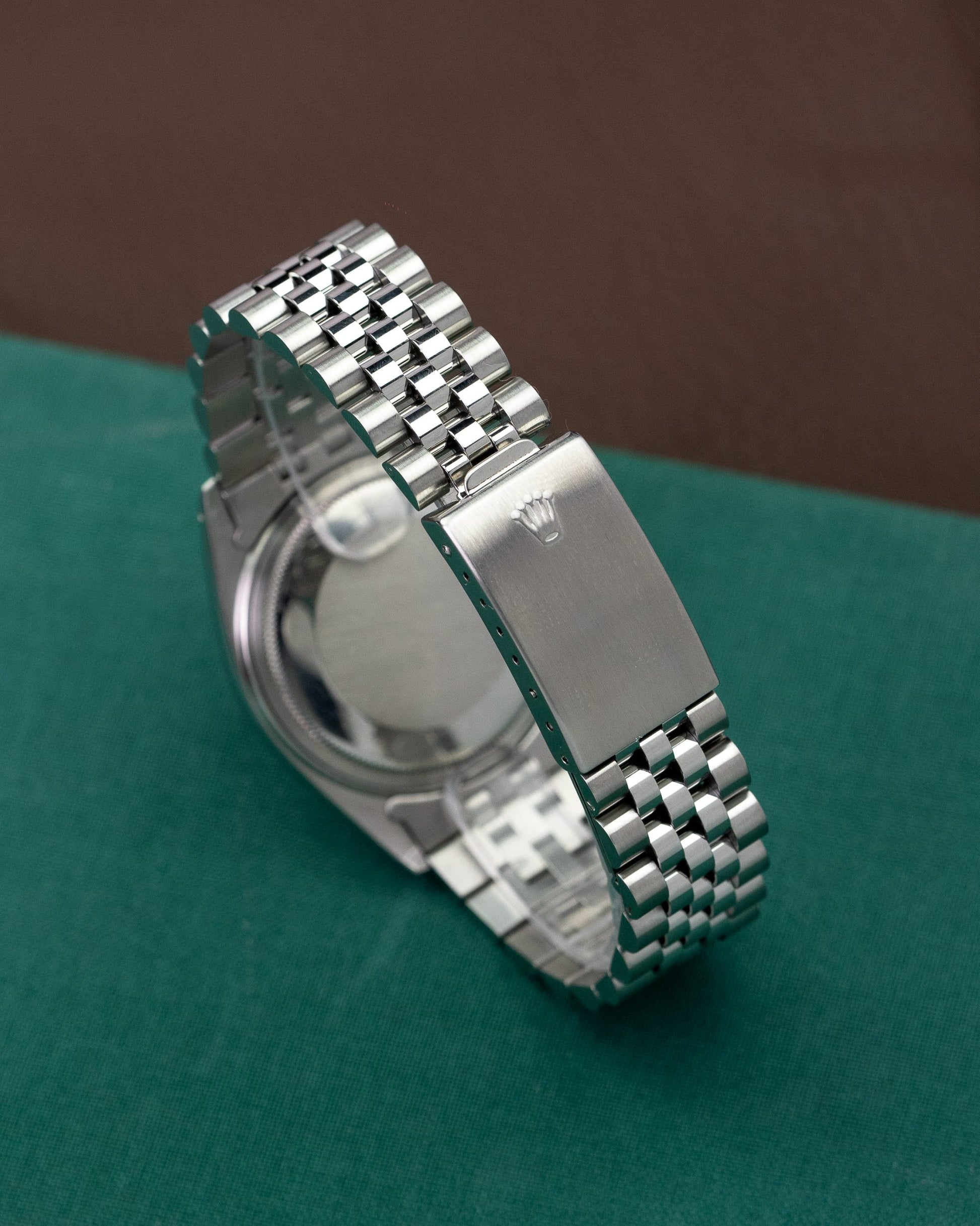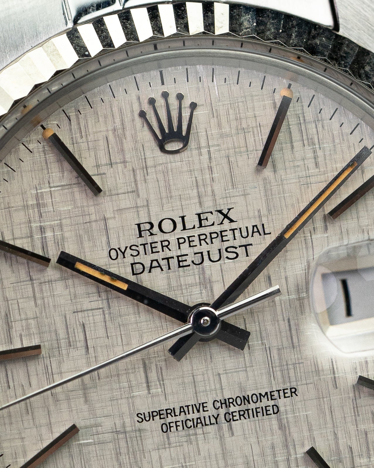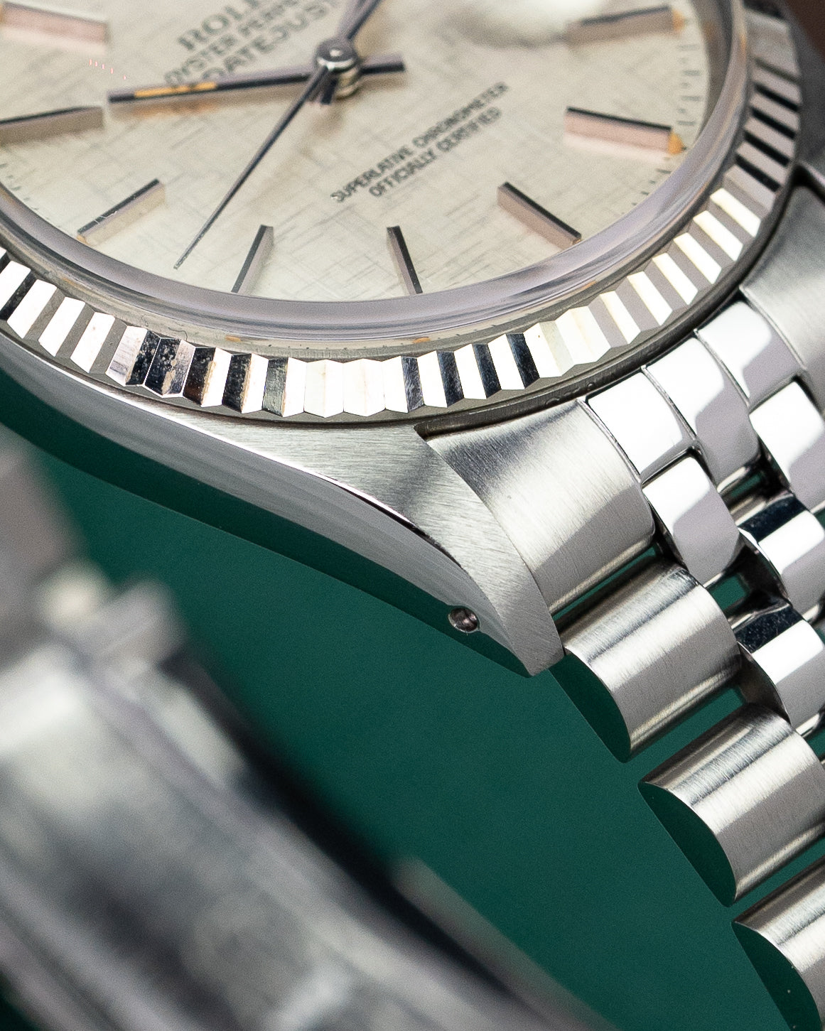 This Datejust 16014 is featured with a so called ‘Linen’ dial which gives the watch that special touch we truly love about watches. The ‘Linen’ dial is so much more playful than for example a sunburst dial, and is for someone who loves to move different from the common. This particular example is just how we like them.
