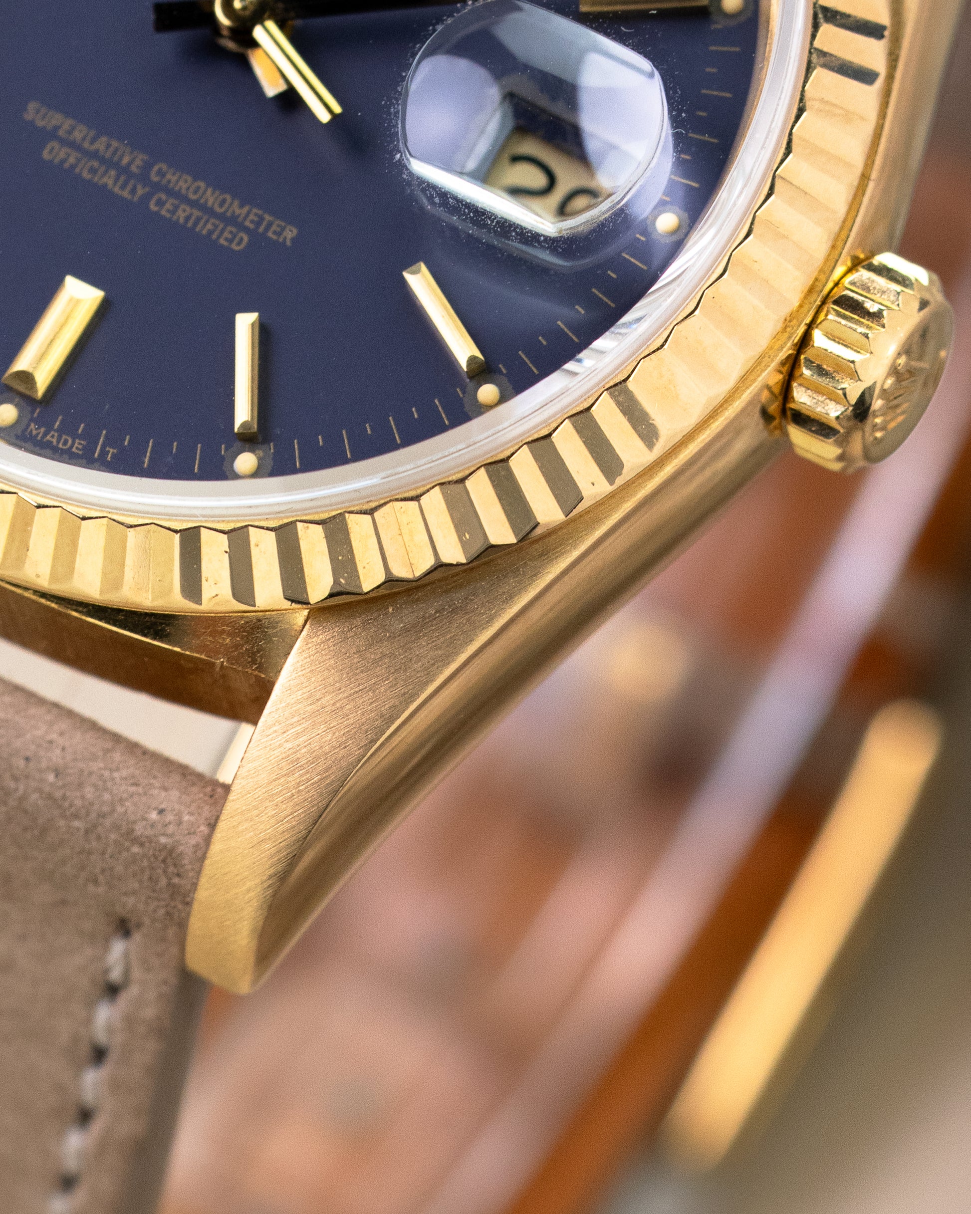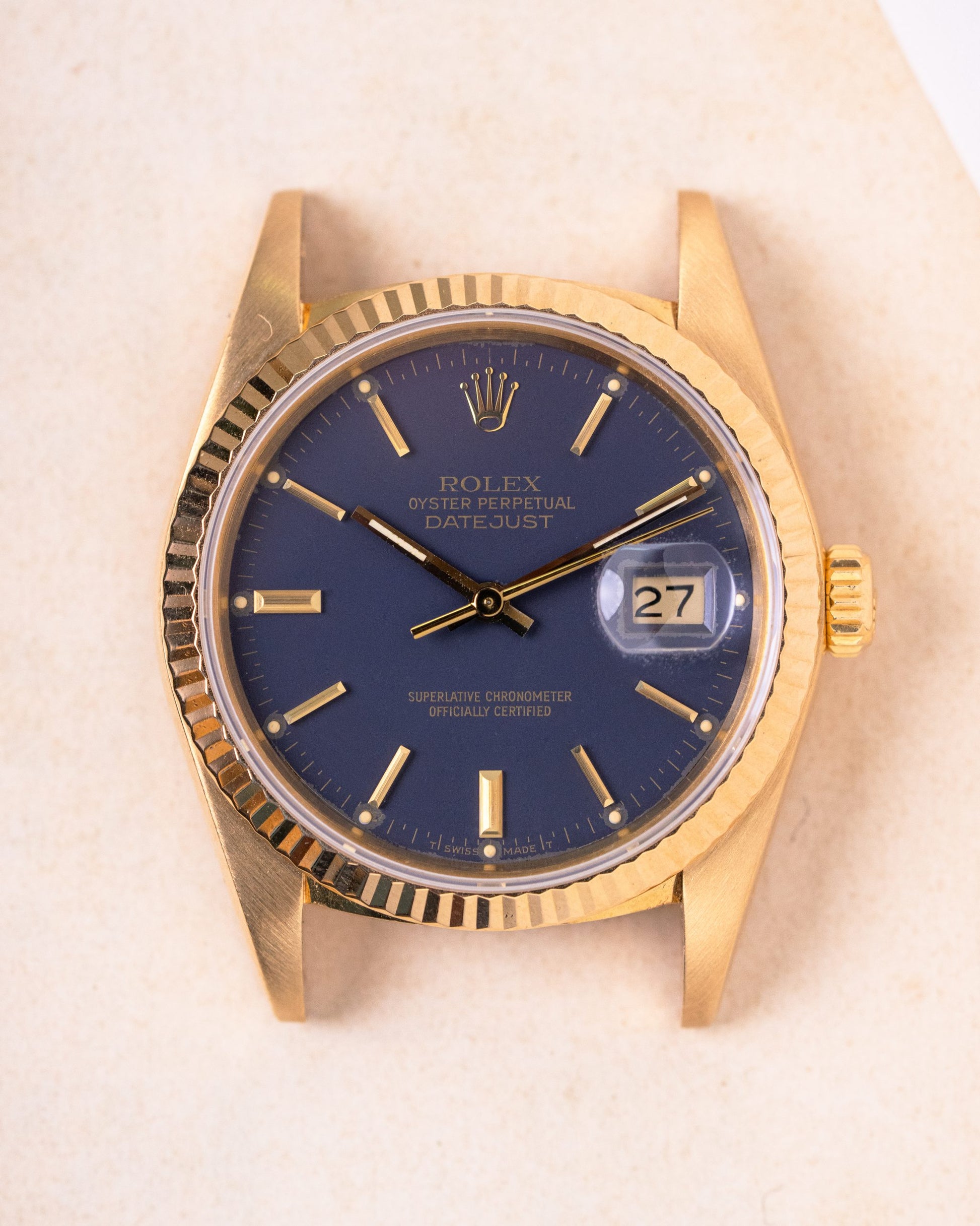 The Rolex Datejust is primarily known for its classic steel series, often seen with a jubilee bracelet and fluted bezel—watches that are commonly featured in our collection. However, this particular Datejust stands out as something truly unique. Crafted from 18K yellow gold and featuring a stunning blue-lavender dial, it is simply remarkable.