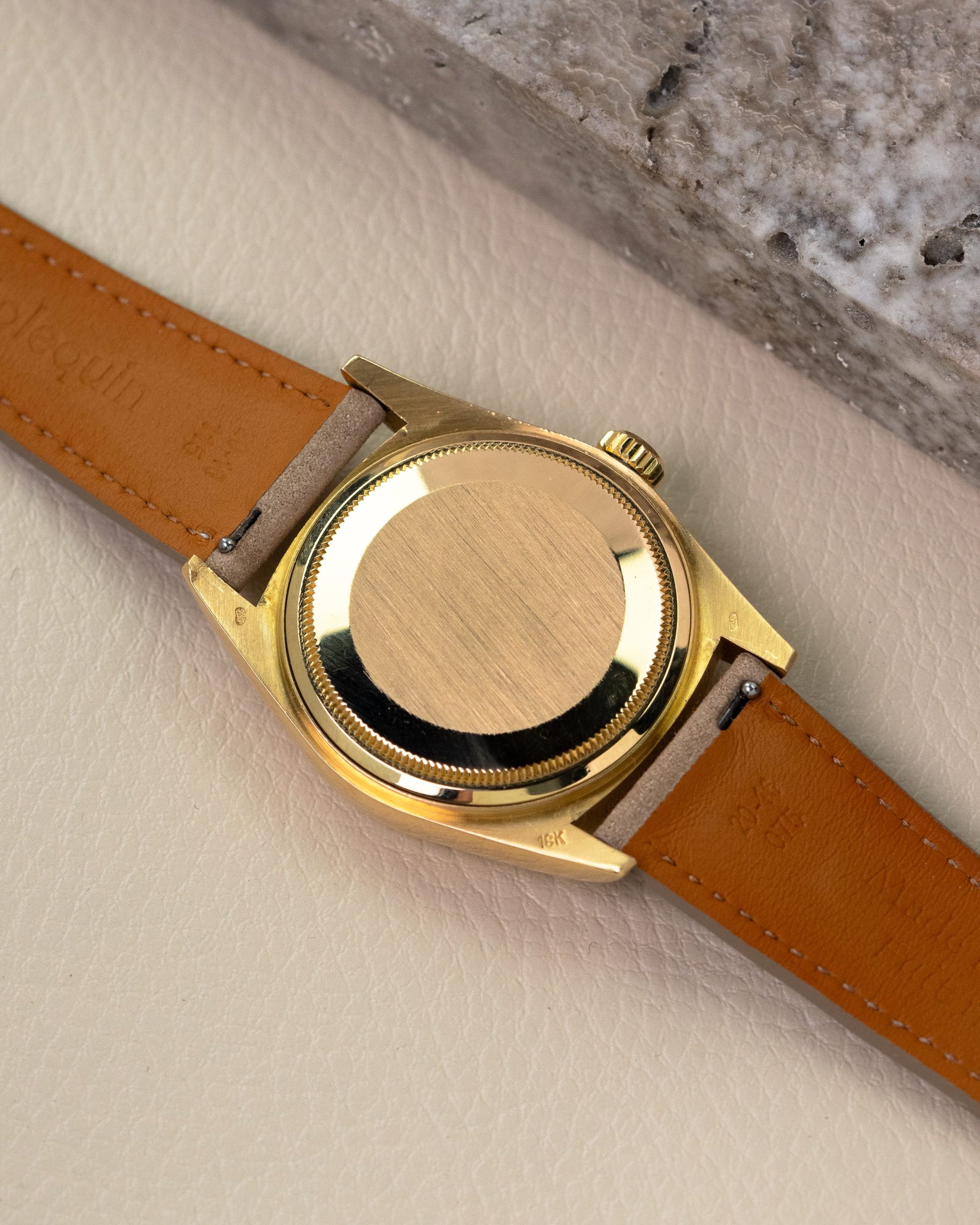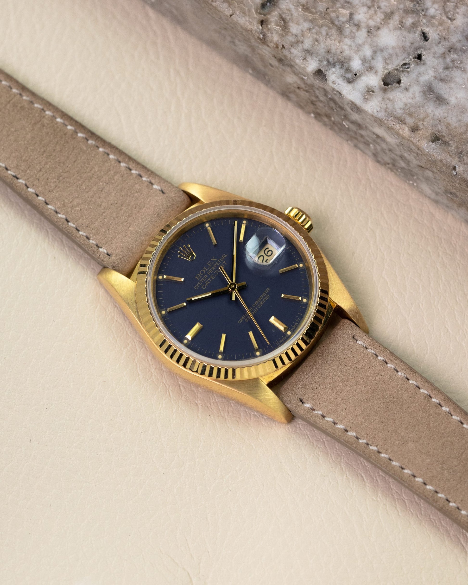 This timepiece is complemented by a beige suede Molequin strap and a plated Rolex buckle. If you’re in search of a classic watch that features a dial you won’t encounter often, don’t hesitate to reach out to us. We would be happy to assist you in adding this exceptional piece to your collection.