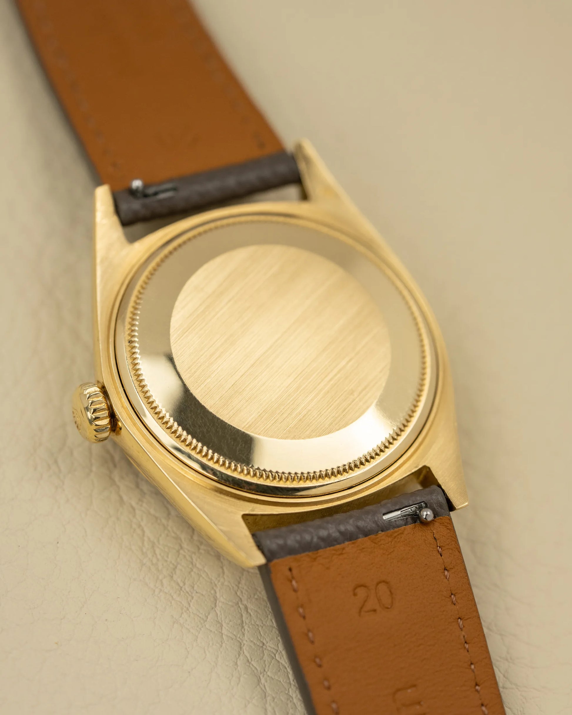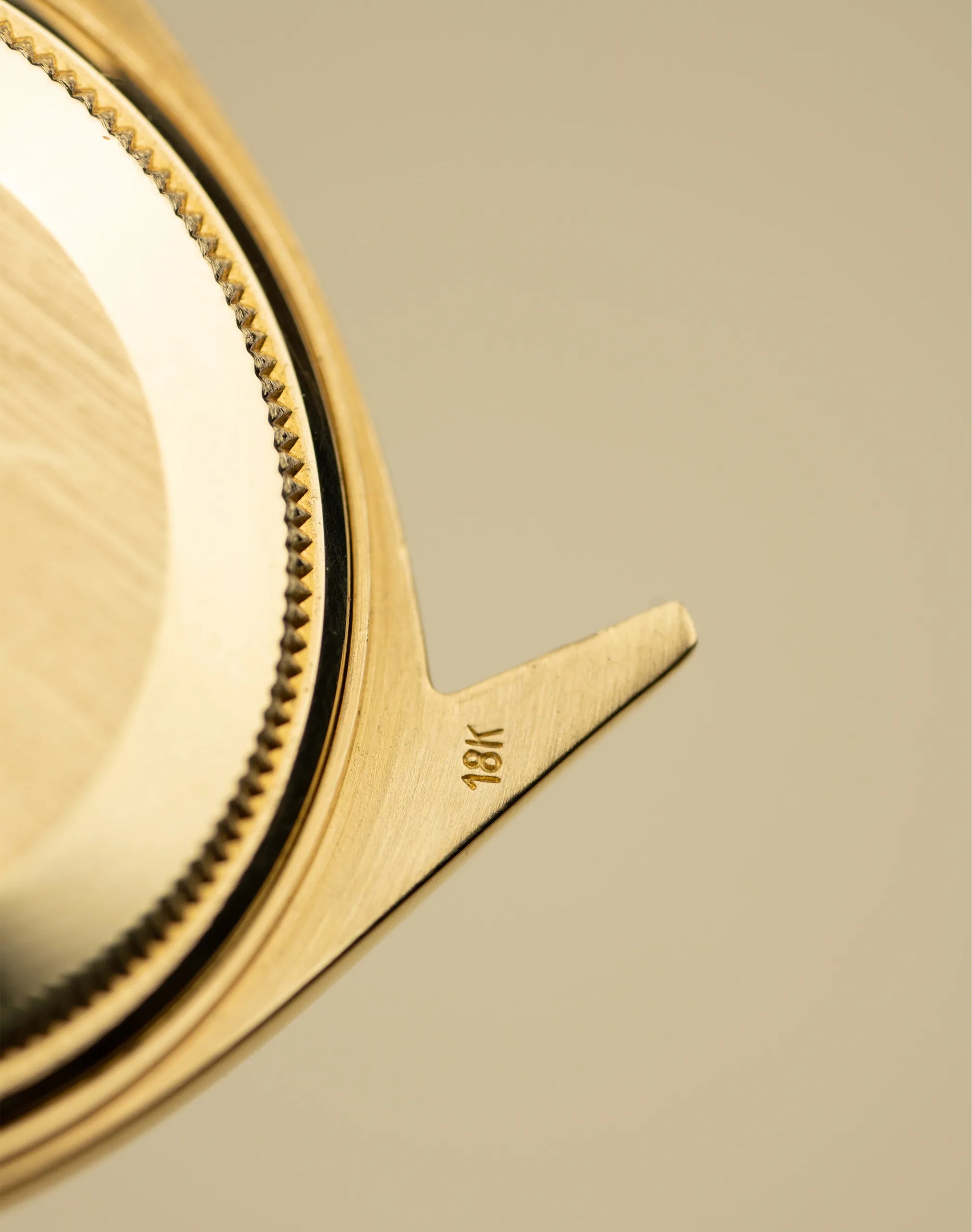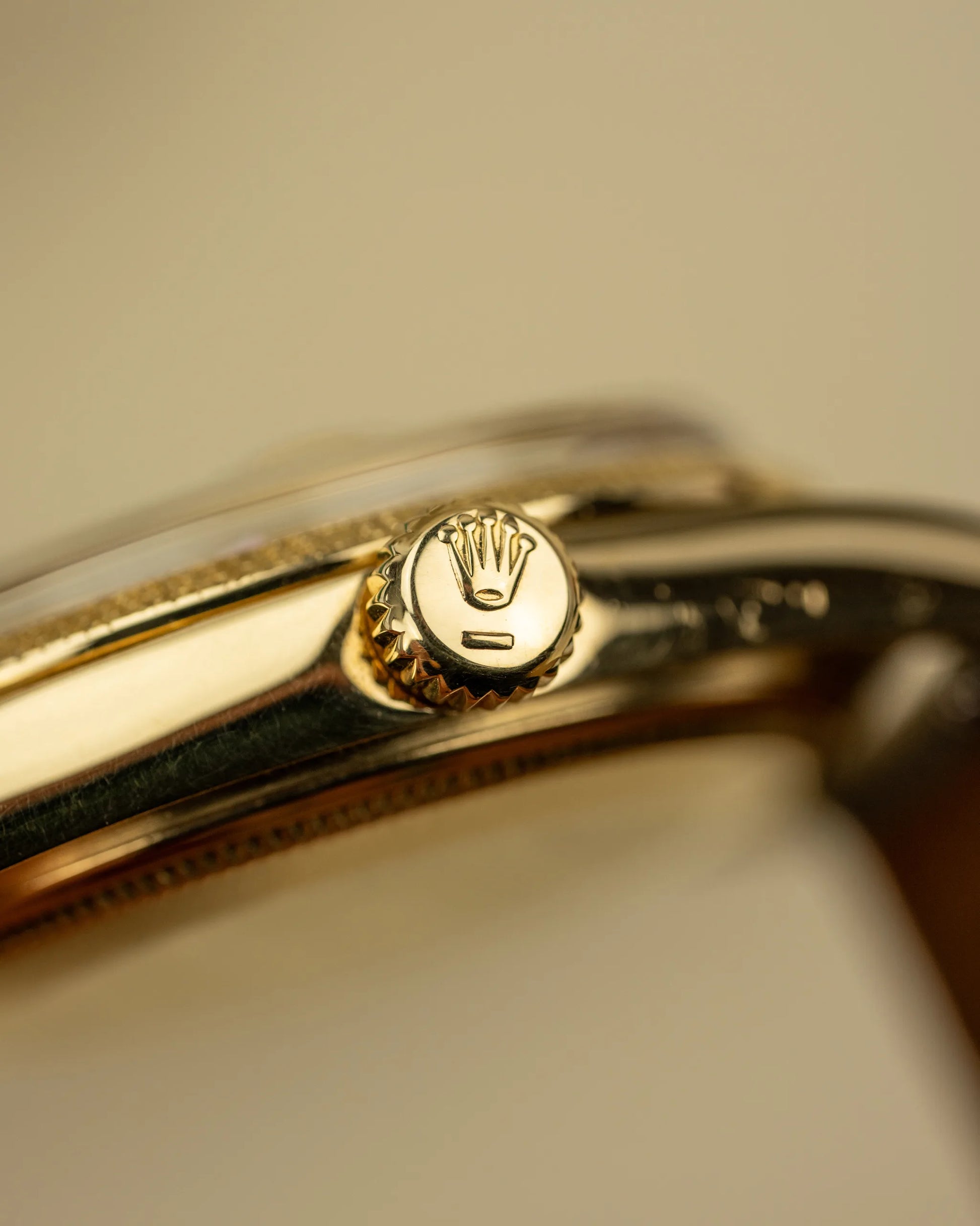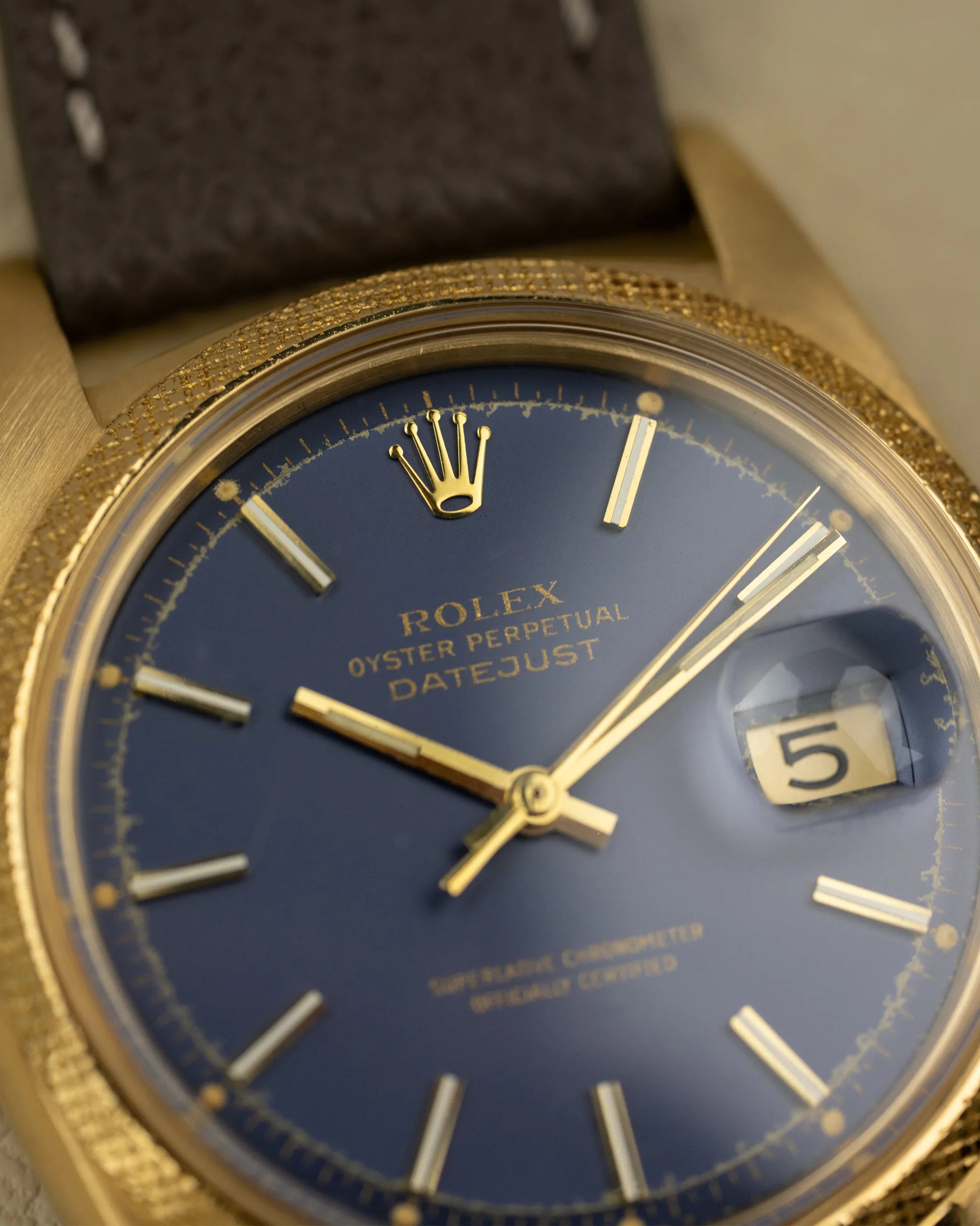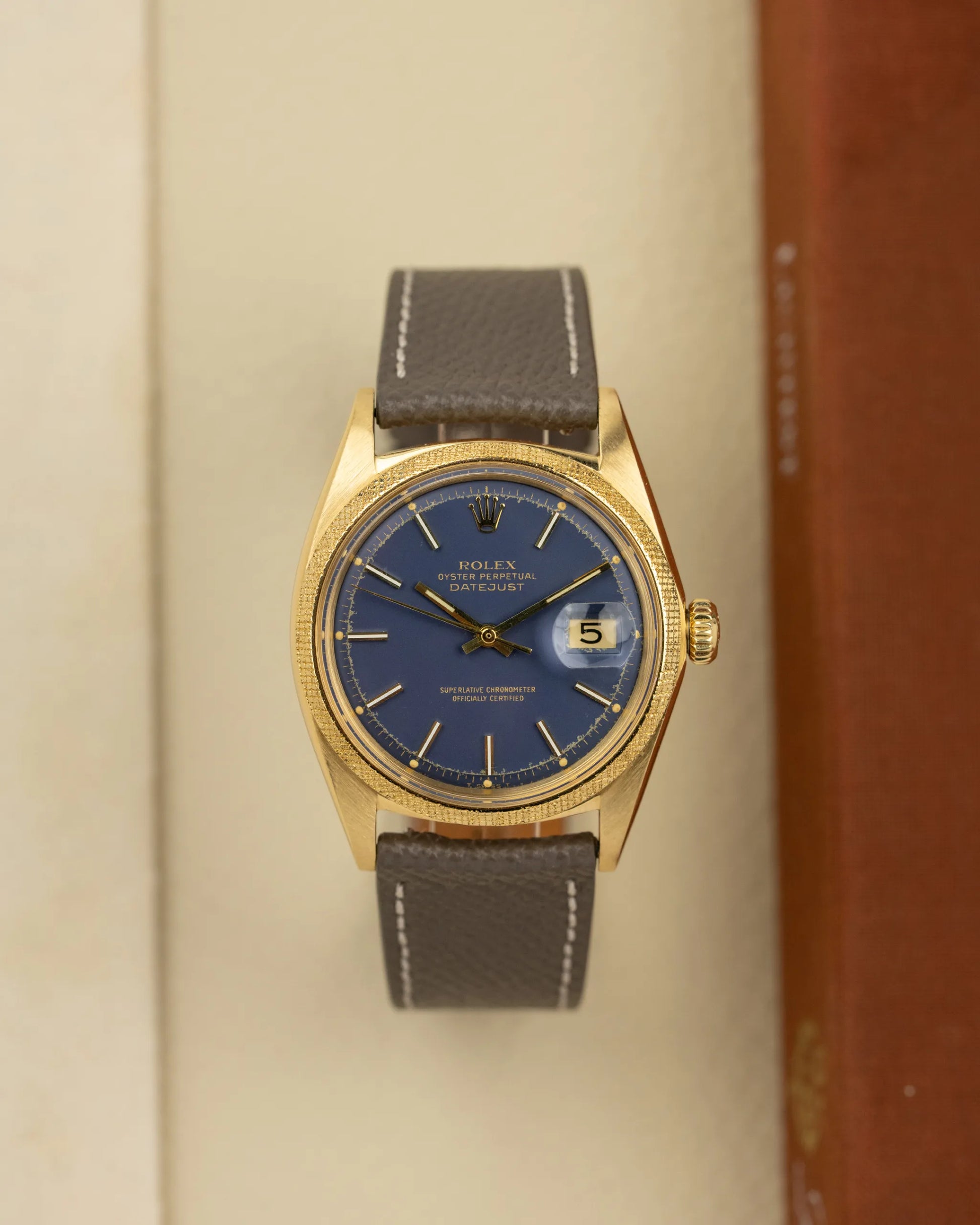 Another beautiful and rare Datejust has entered the store. We present to you an 18K yellow gold Datejust with a slightly colored matte blue dial and a so-called Morellis or Florentine finish. This is our third classic Rolex with a more specially finished bezel. We have previously had a bark and Moreau finish.