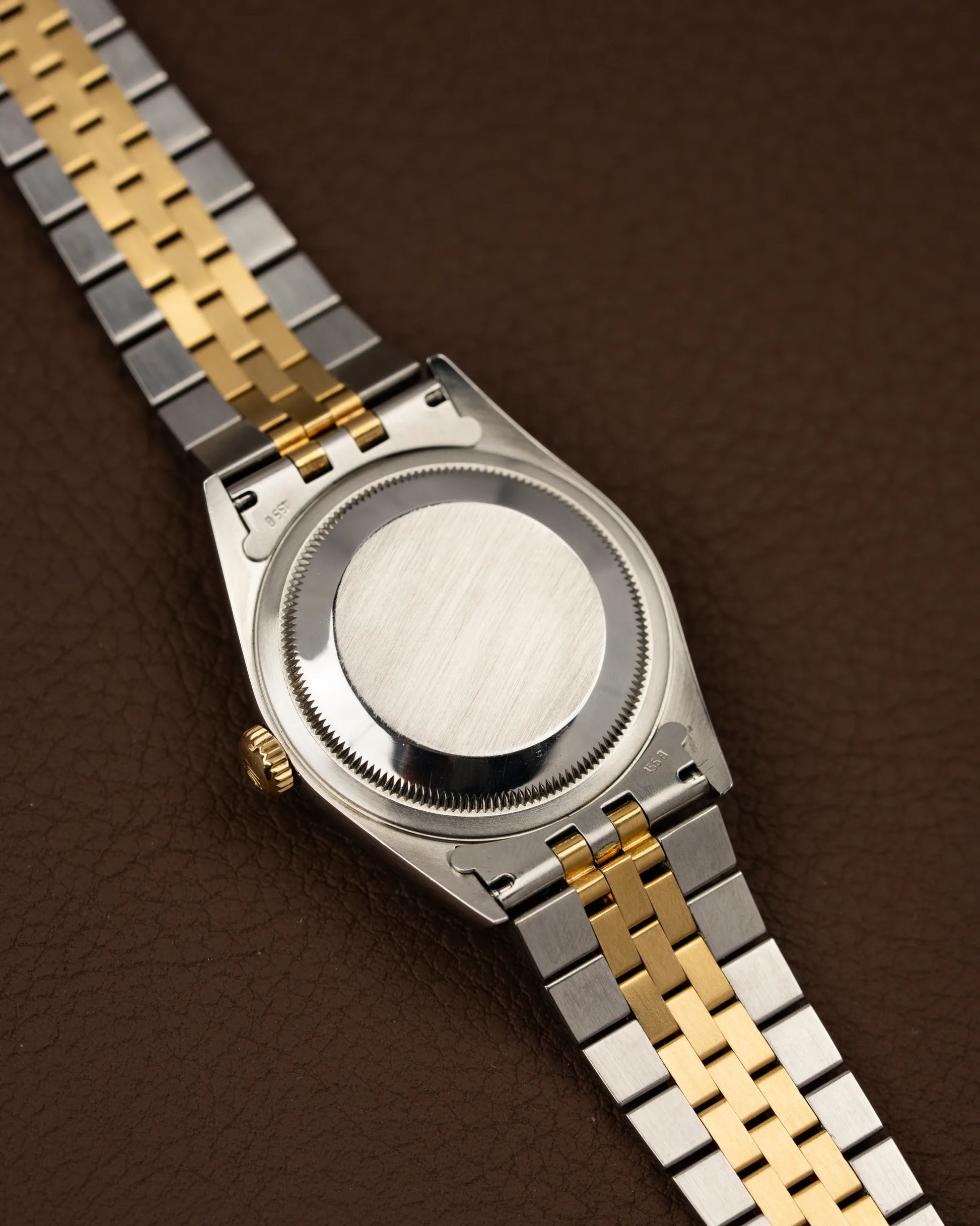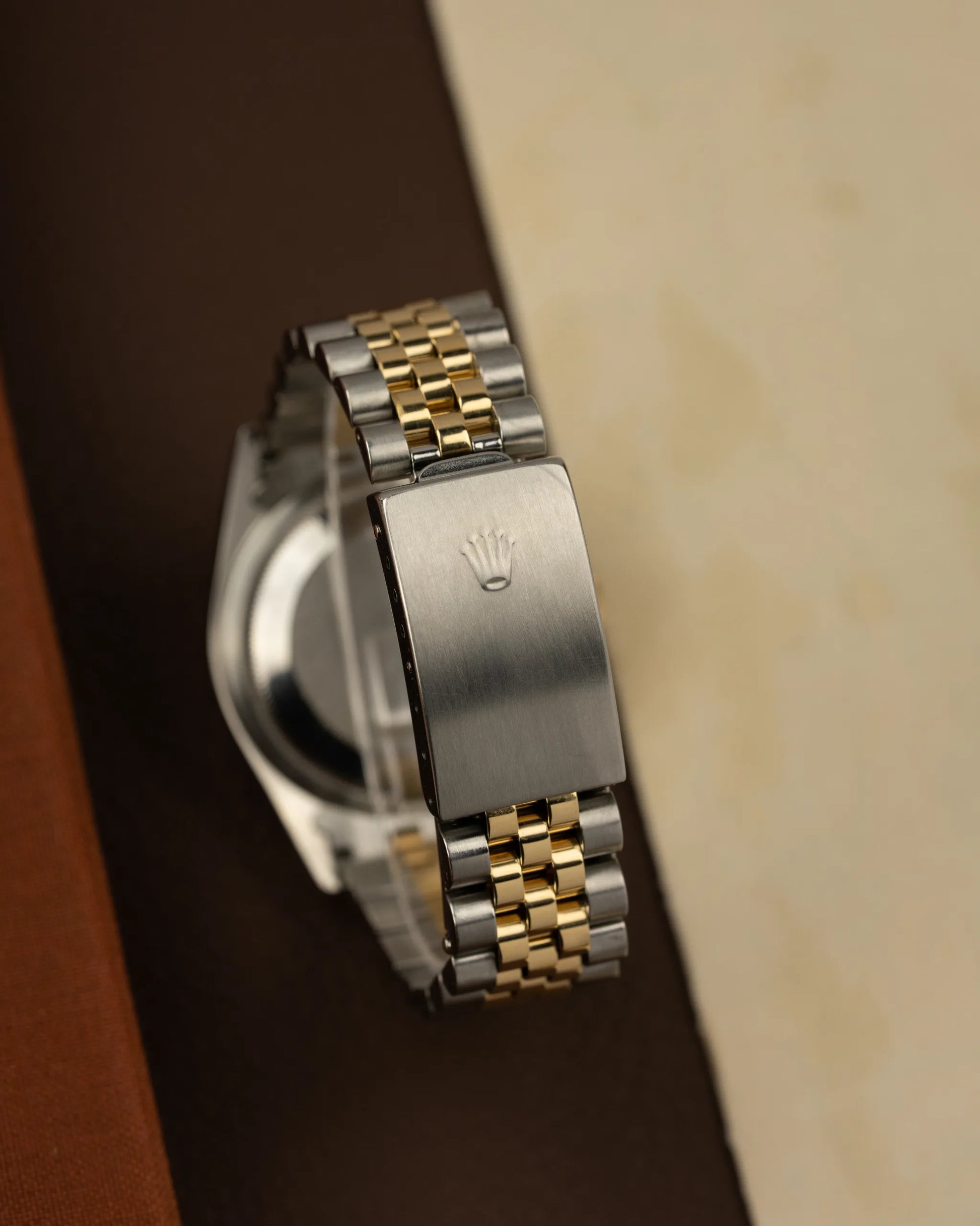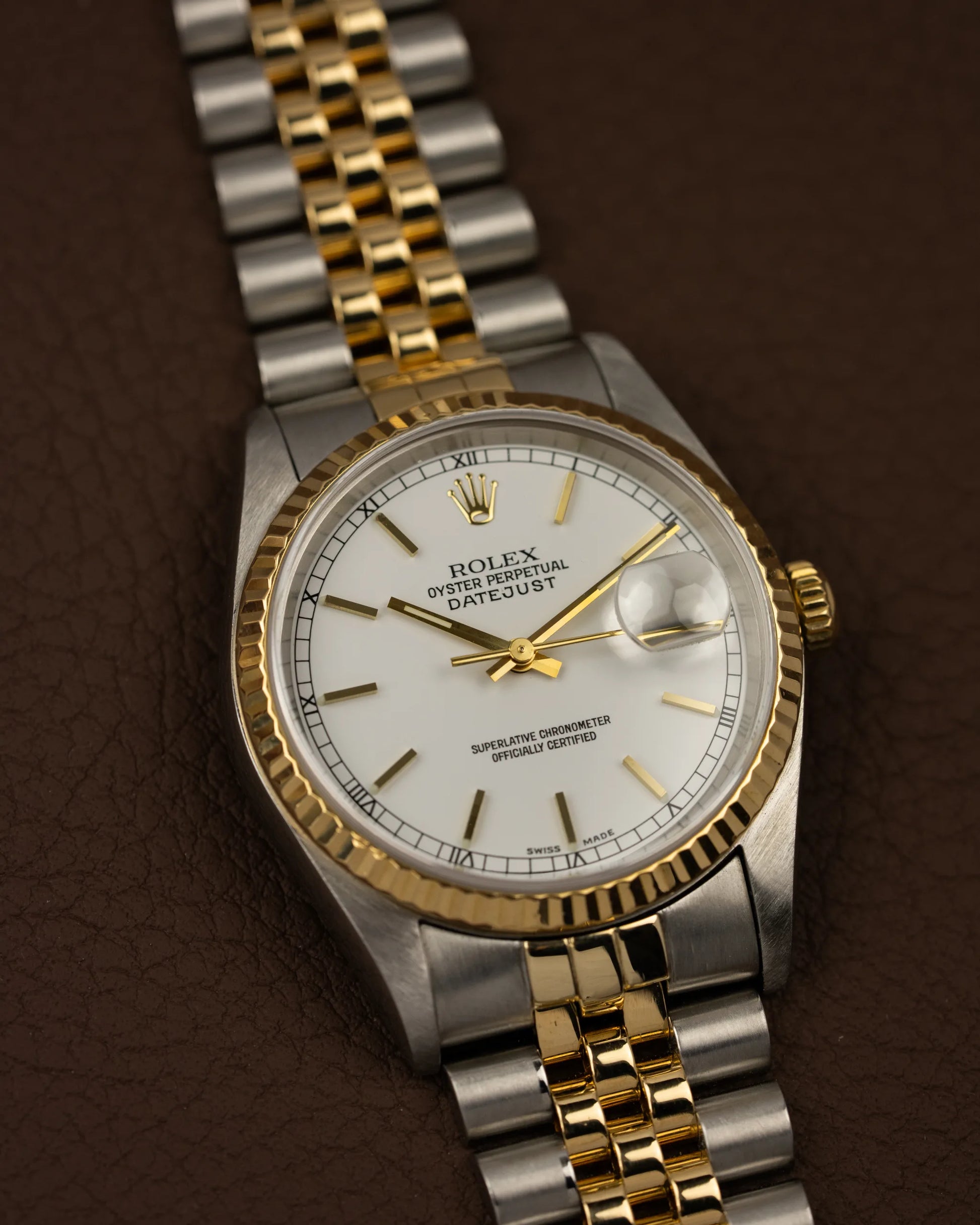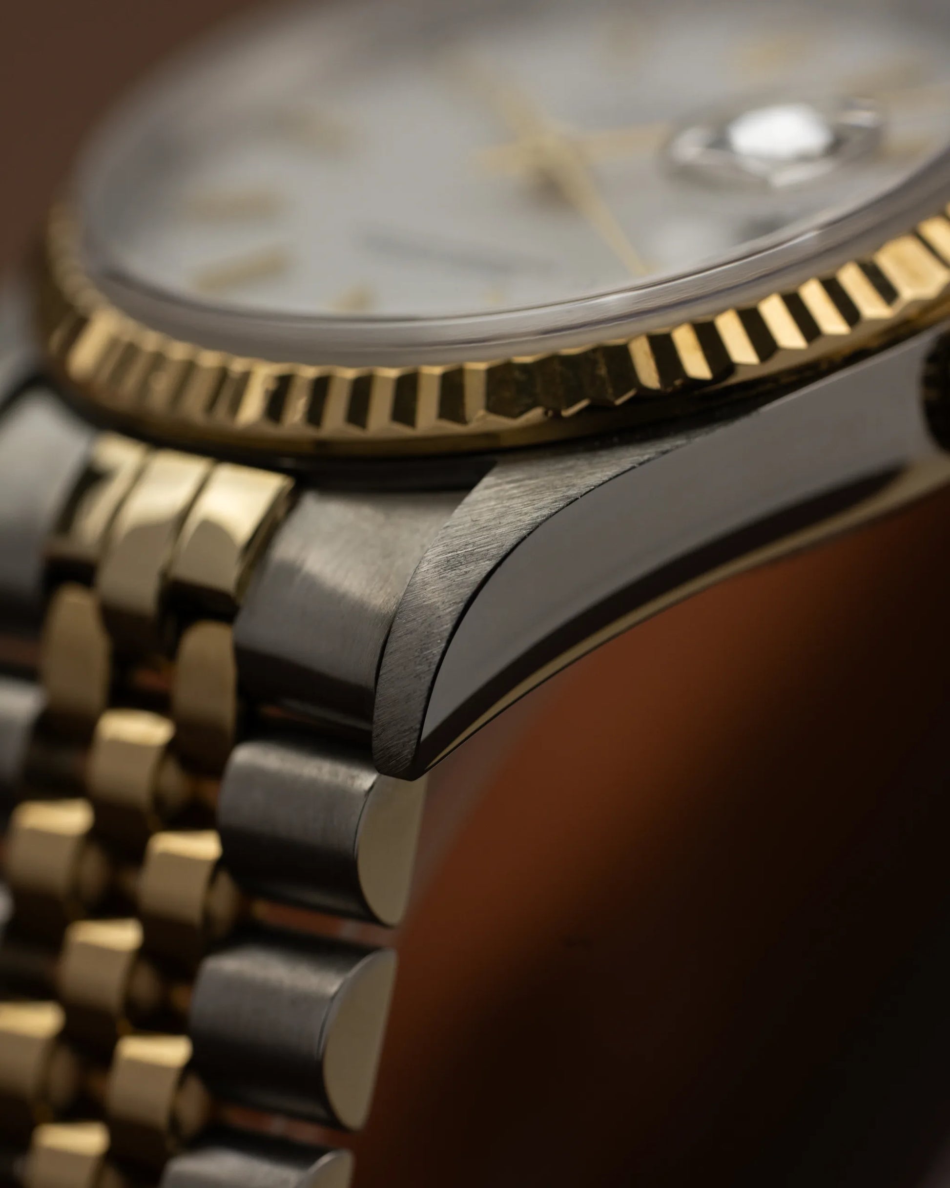 This particular one is a beautiful 16233, which is combining some design features we love in watches. Let's begin with the white lacquer dial which is stunning on its own, but combined with the gold and stainless steel finish makes it even better. Another thing we love? The condition. There are two things we always look at when selling something. Do we like it ourselves, and if the condition stood the test of time!