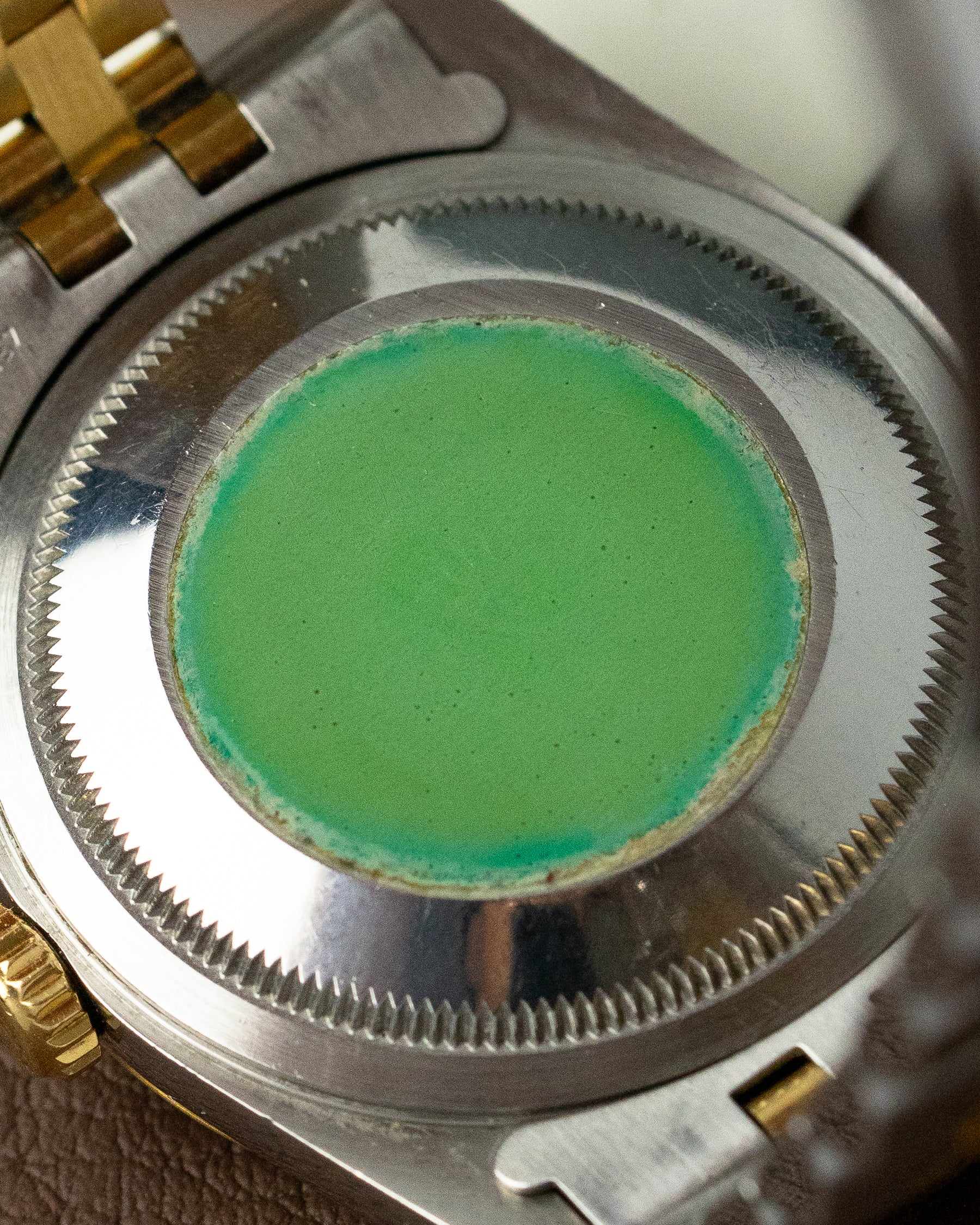 This specific model is distinguished by its two-tone design, which merges stainless steel with 18k yellow gold. We are always excited to offer a two-tone piece, because it’s different from the ‘regular’ pieces you’ll often see. It’s just something different, especially with a dial like this particular example.