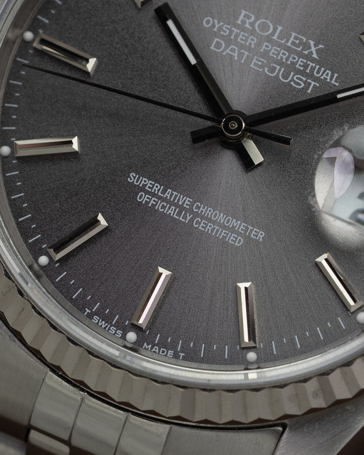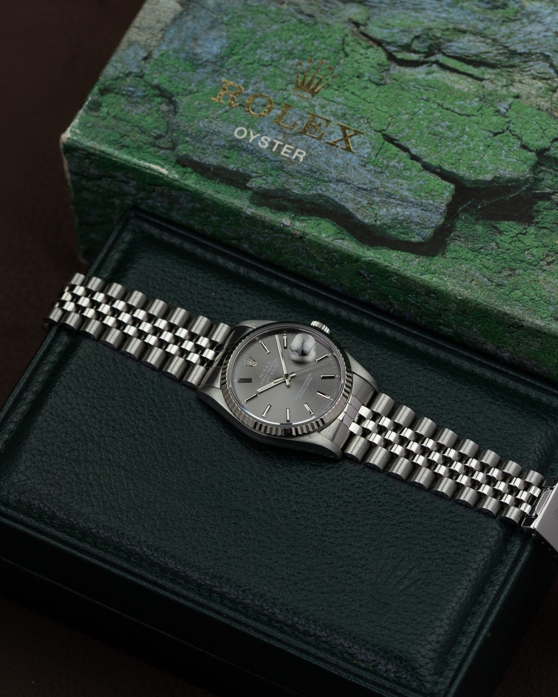 In this case we present you the Datejust 16234 with a Grey Dial without minute-track. A beautiful example in perfect and full-set condition.