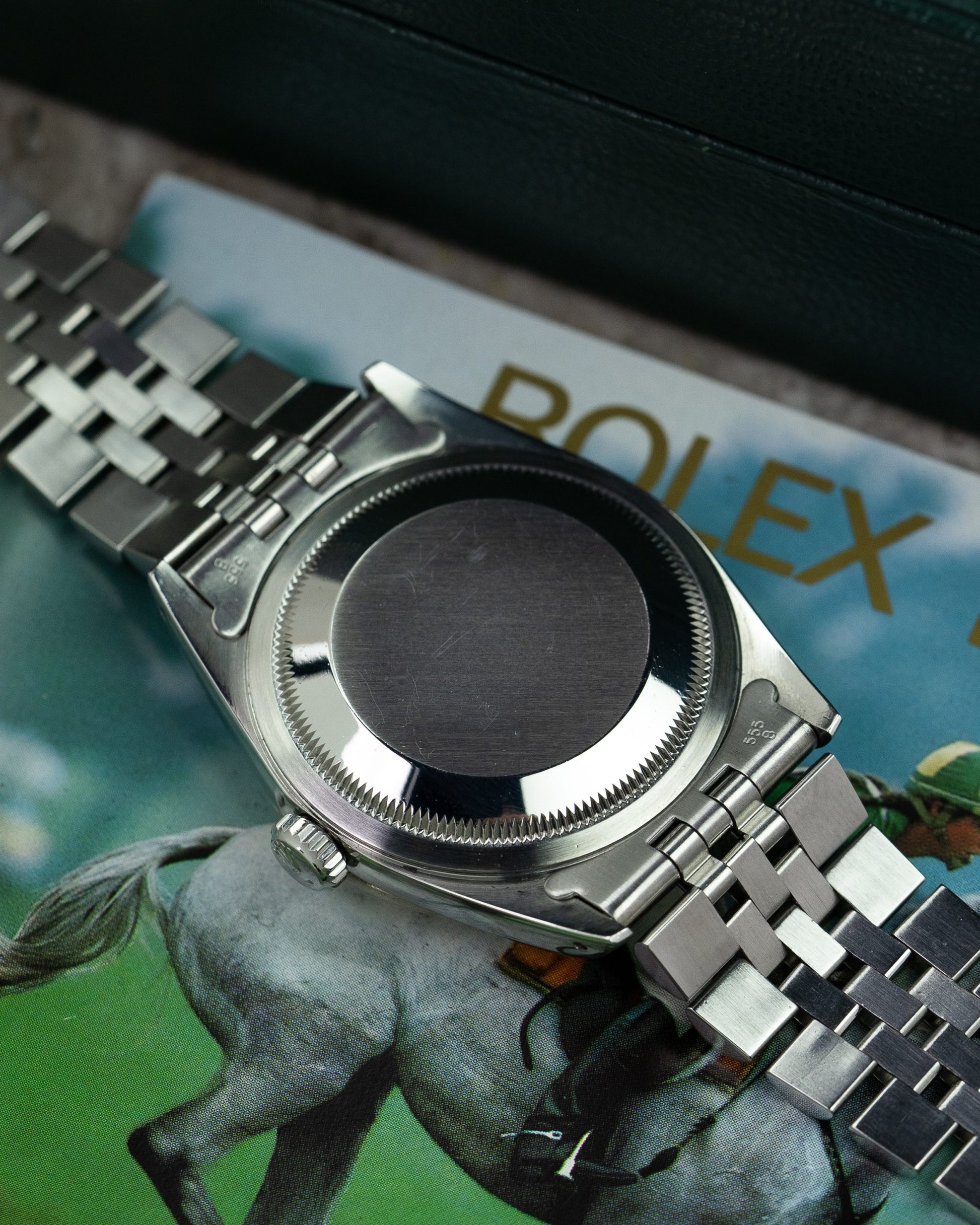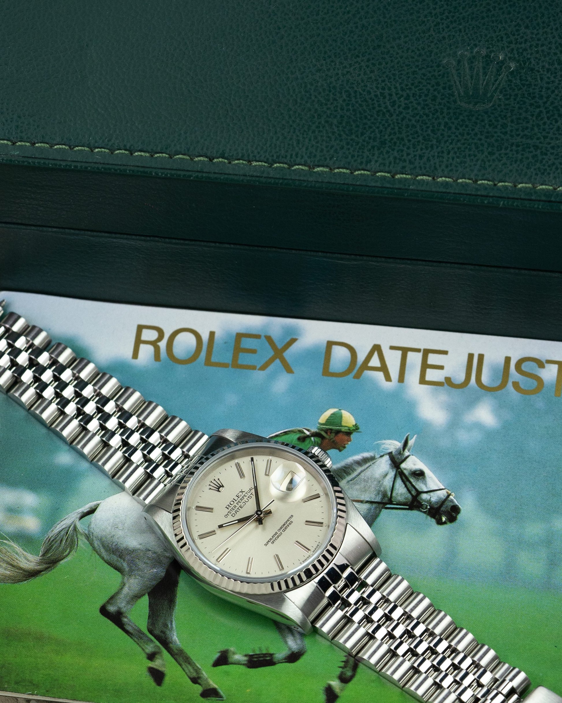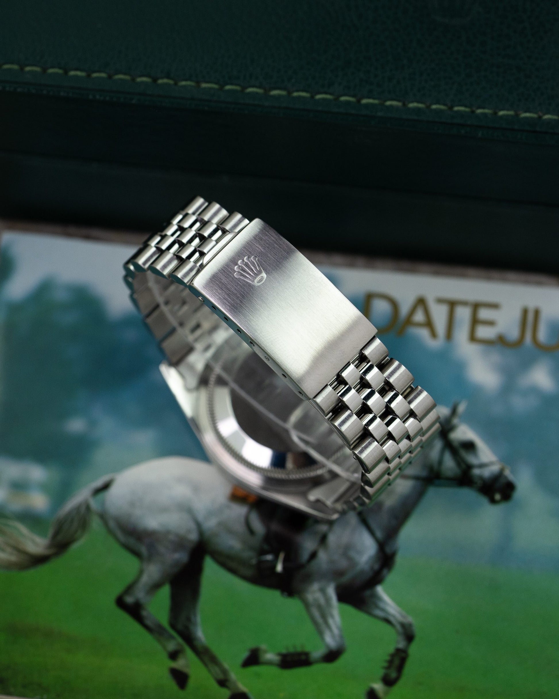 We all know that the Datejust is one of the most iconic and desirable models from Rolex. There is so much variety to be found in the model, and this particular example is exactly showcasing it. This time we have a Silver dial no minute track 16234. The watch is in great condition and is accompanied by the original box and papers.