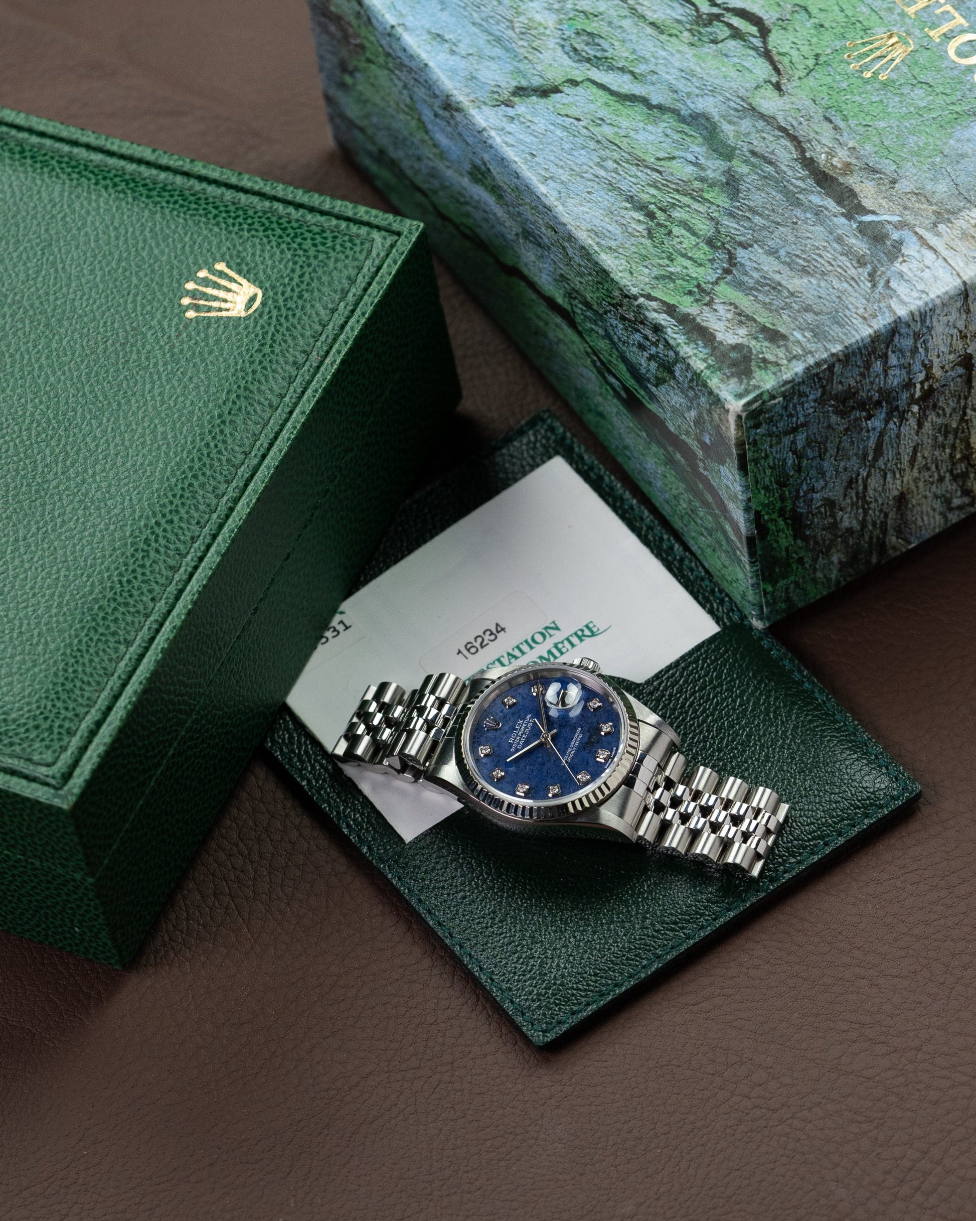 The Rolex reference 16234 is a model we acquire frequently, primarily because it serves as an excellent starting point for both watch collectors and enthusiasts. What makes this particular 16234 stand out is the addition of a rare Sodalite dial—a detail you don’t often come across.