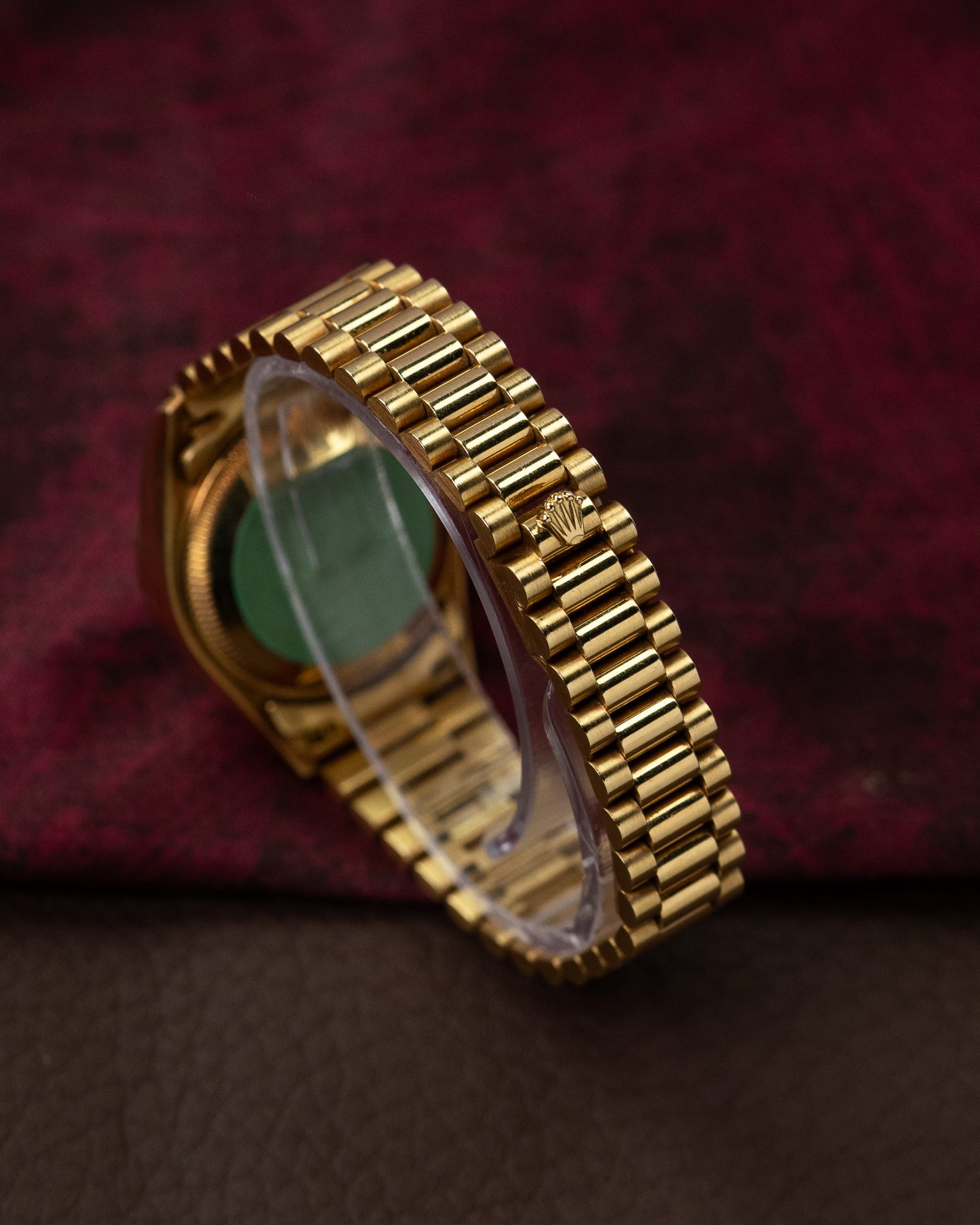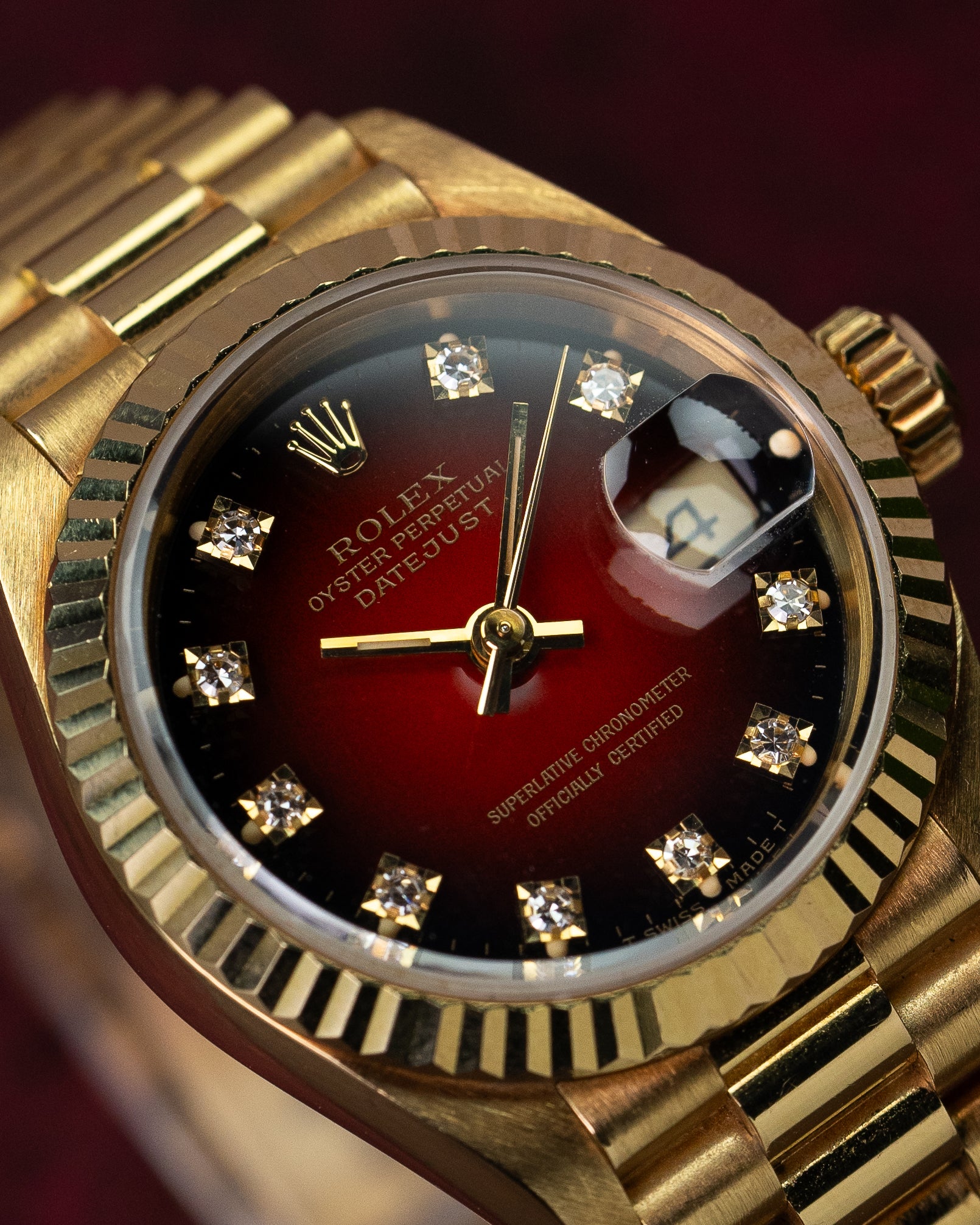 The 18K yellow gold case blends perfectly together with the stunning Red vignette dial which is complimented by diamond hour markers. The 26mm Lady’s are one of our best selling models, and we can understand why. It’s classic, elegant and timeless in every single aspect.