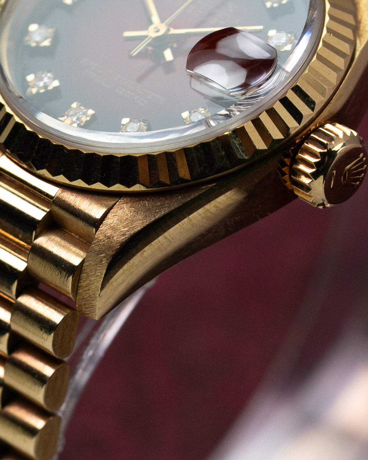 Sometimes you don’t need to explain its uniqueness and beauty due to the overall aesthetic and design features of a watch. We’ve sold a lot of Lady Datejust examples in the past, but this is the first one with a unique Red Vignette Diamond dial.