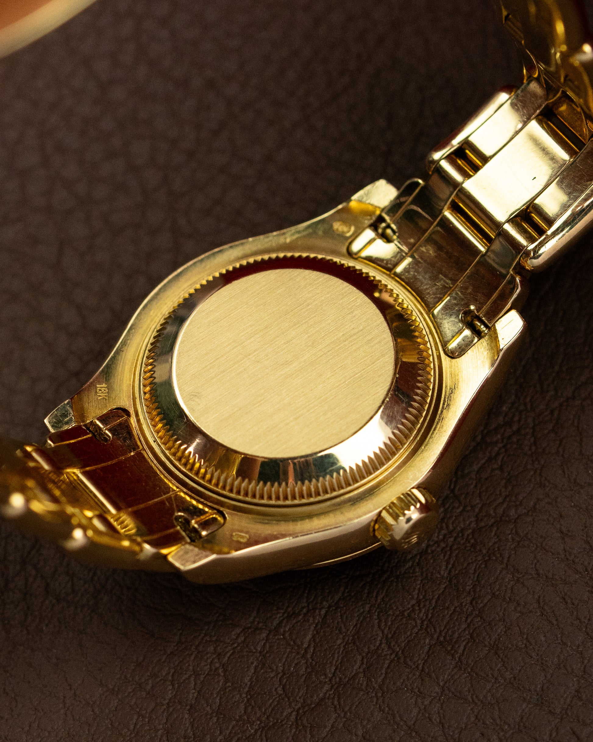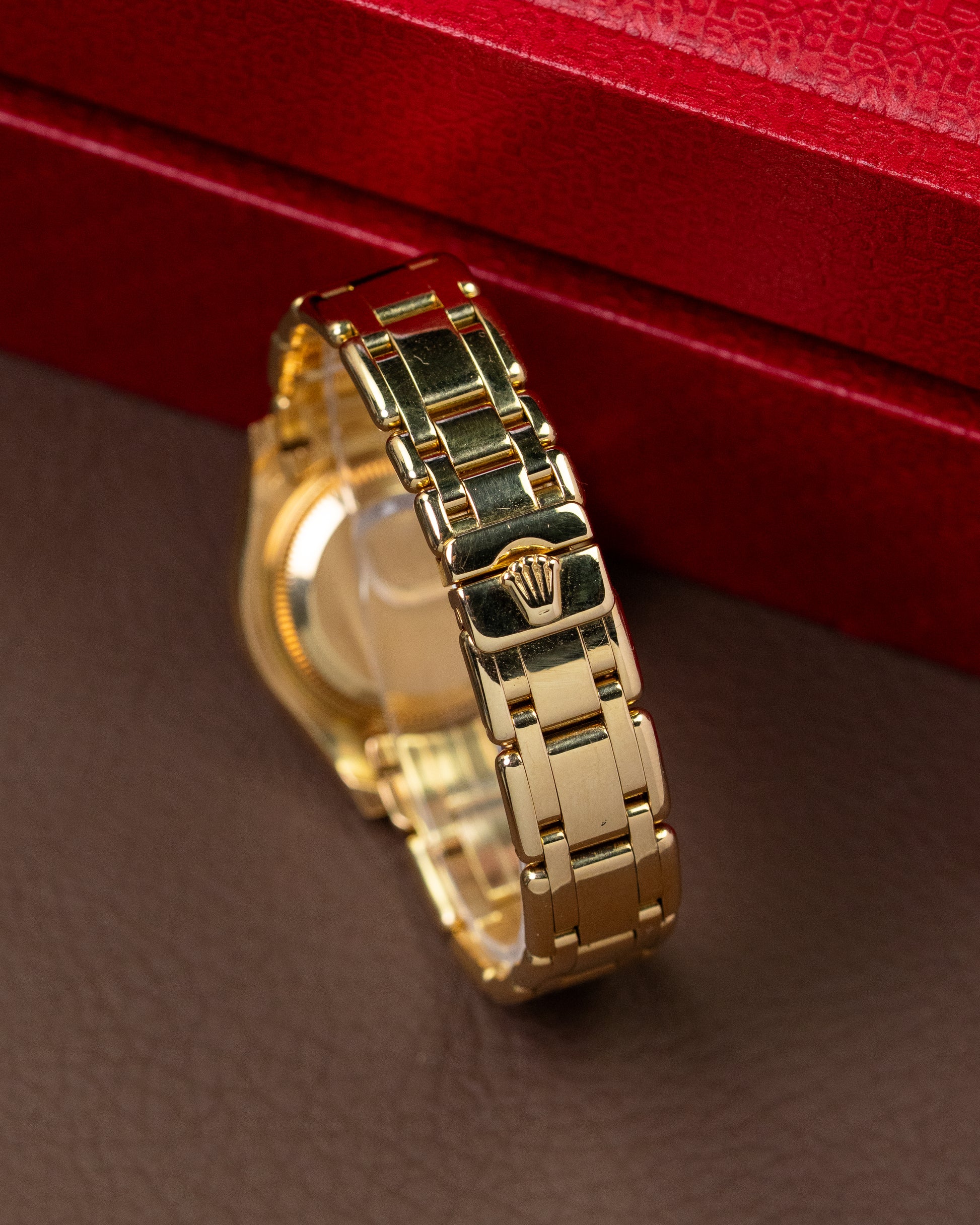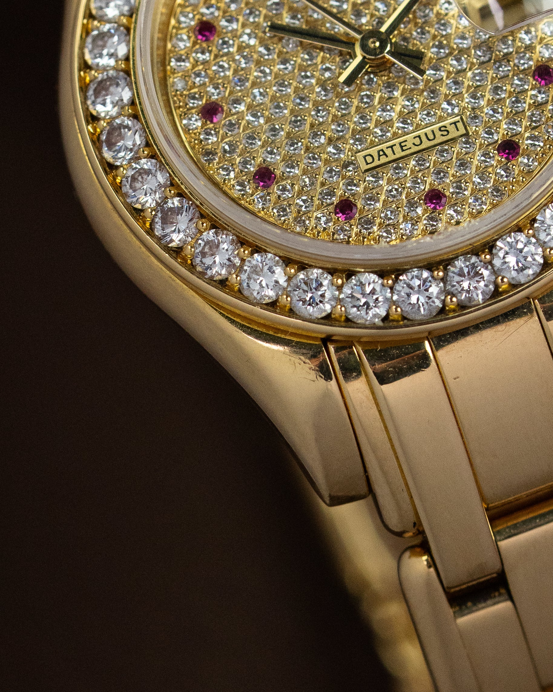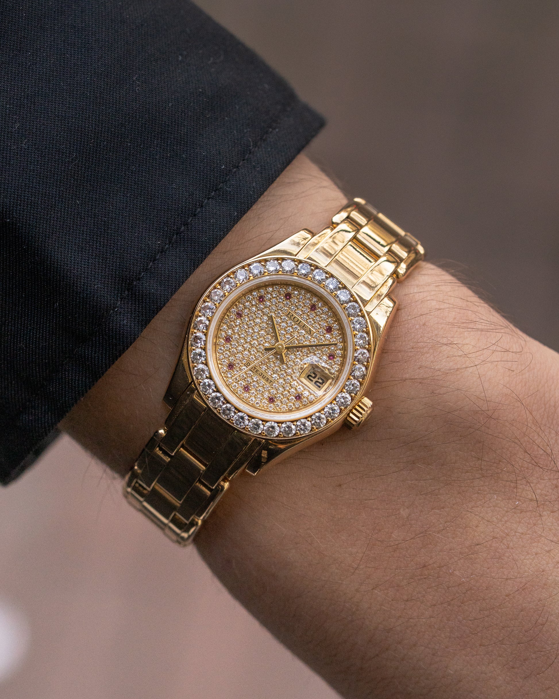 This Pearlmaster we present to you is not for everyone. It is executed in 18K yellow gold and has a full pavé diamond dial, ruby hour markers and a factory-set diamond bezel and dial. When light shines on the diamonds, you will be surprised by its appeal.