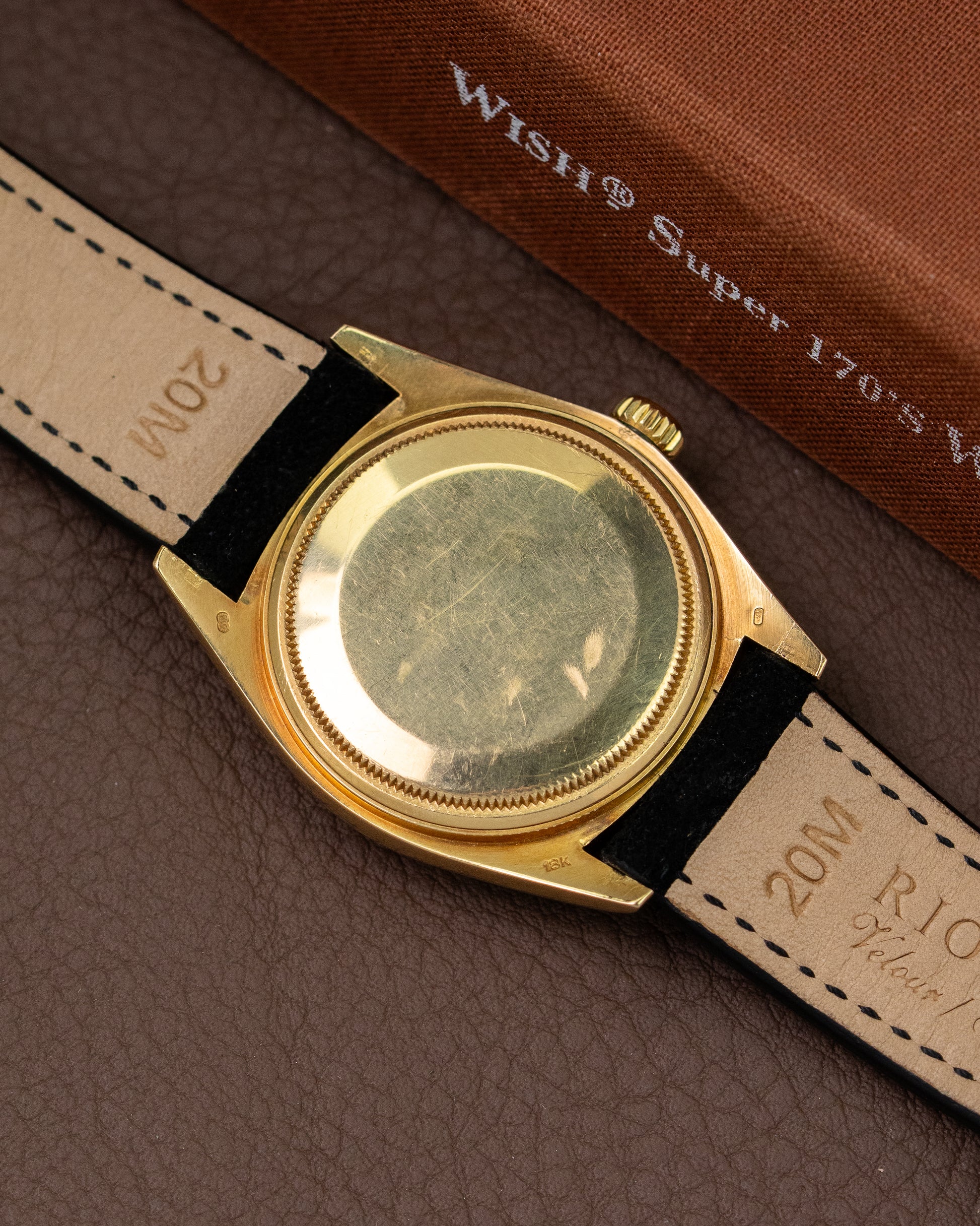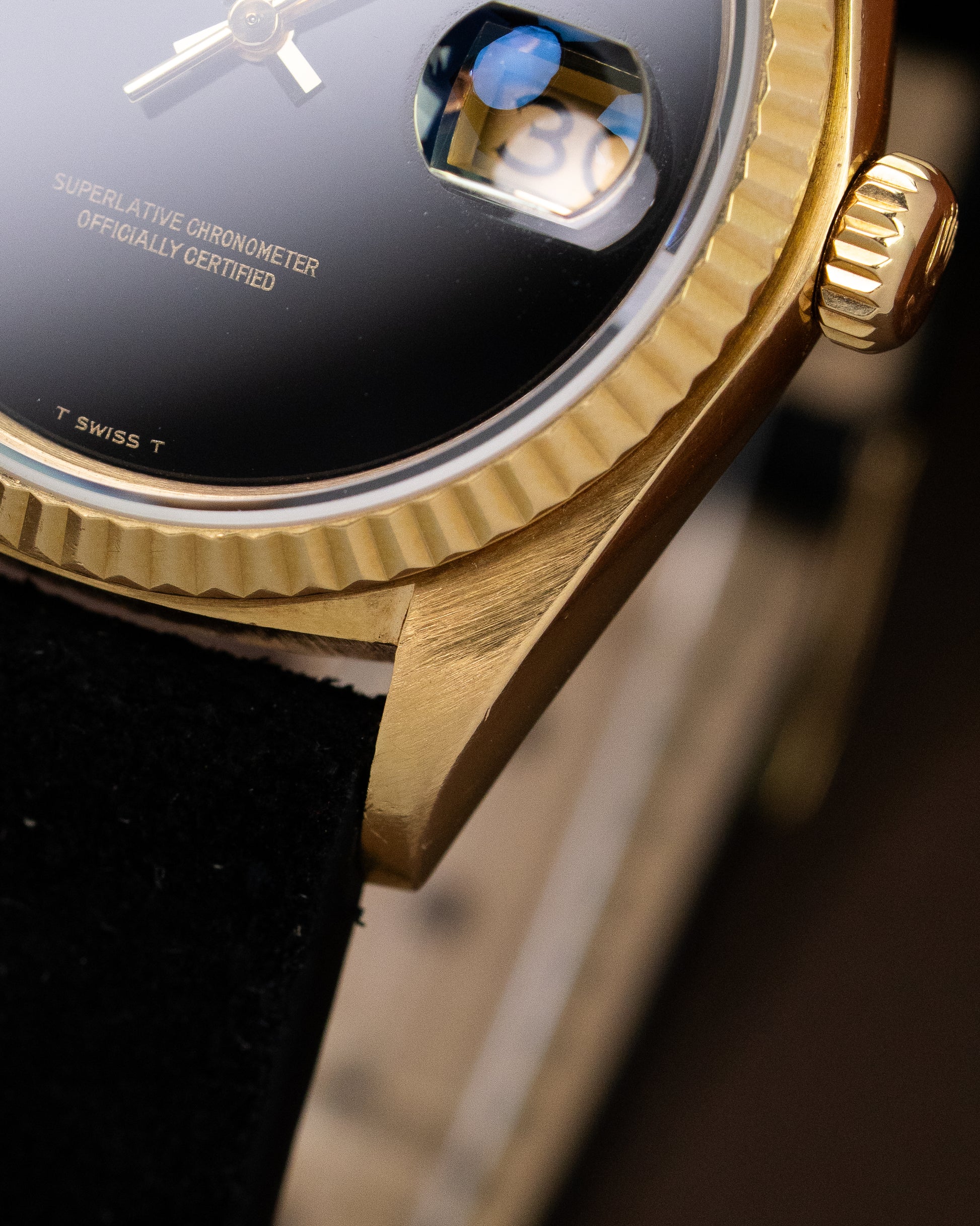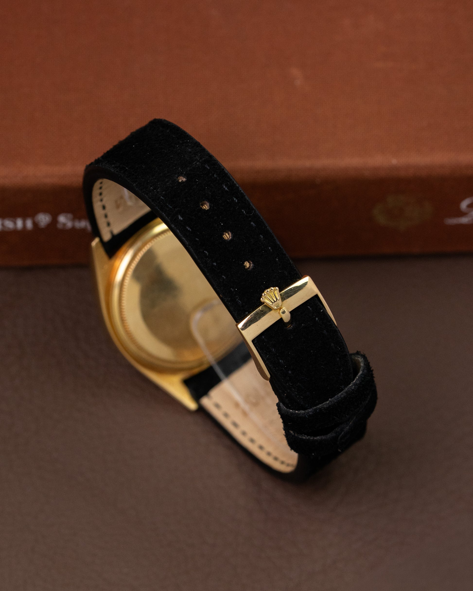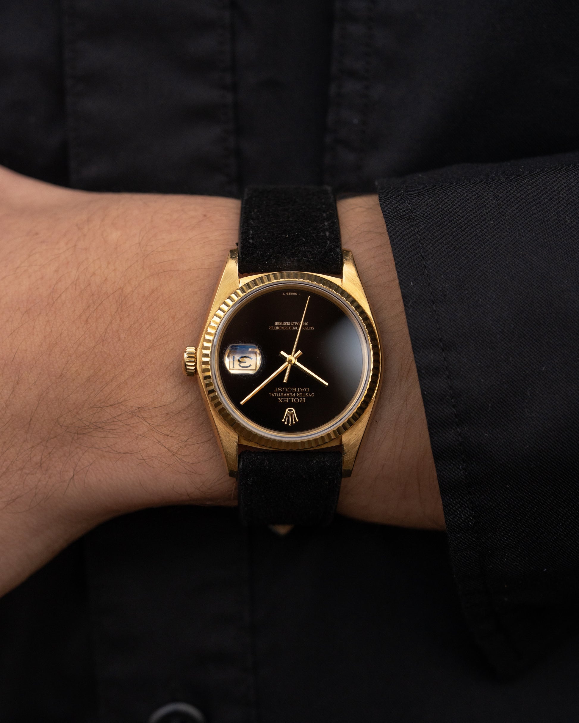 The watch is fitted on a black suede strap adding that matches perfectly with the dial and has a Rolex buckle.
