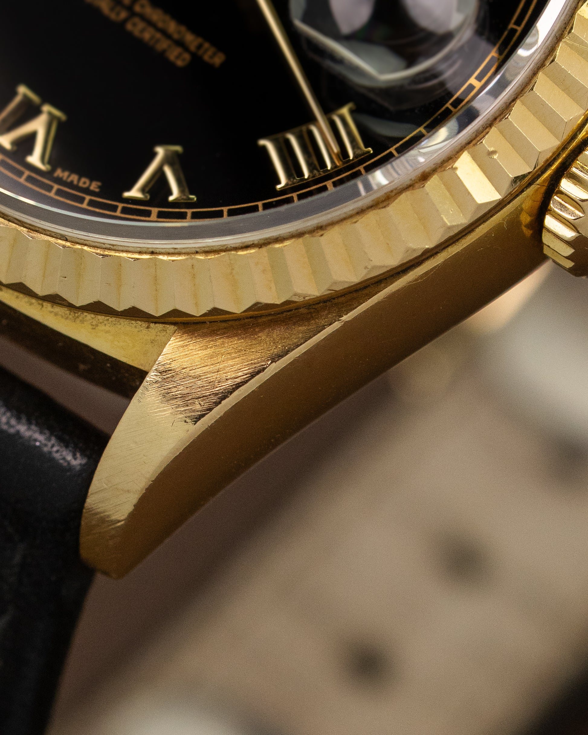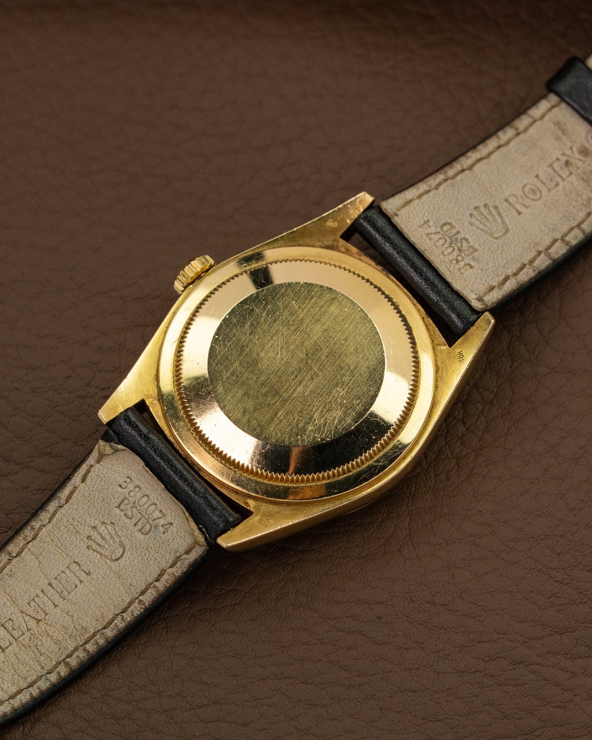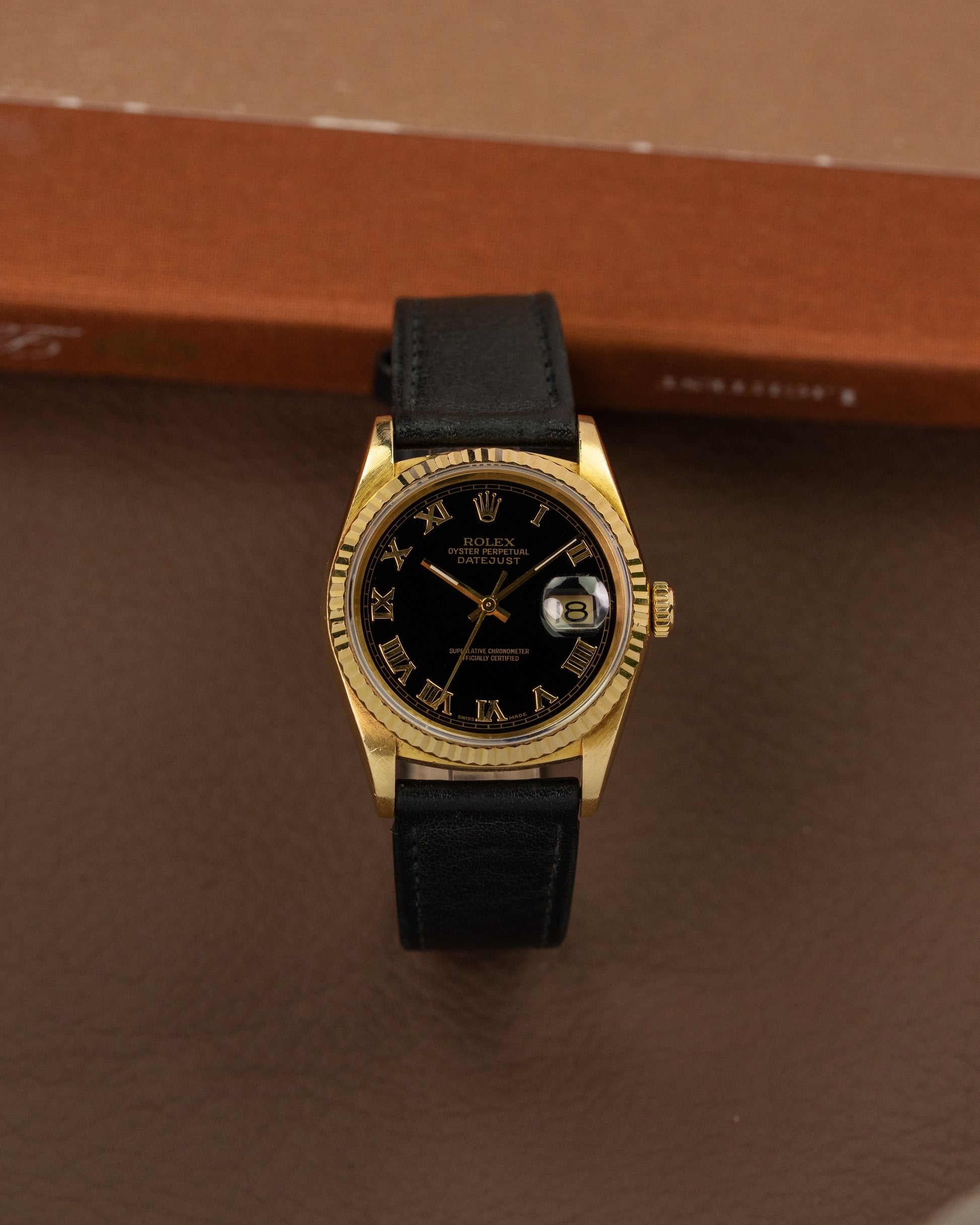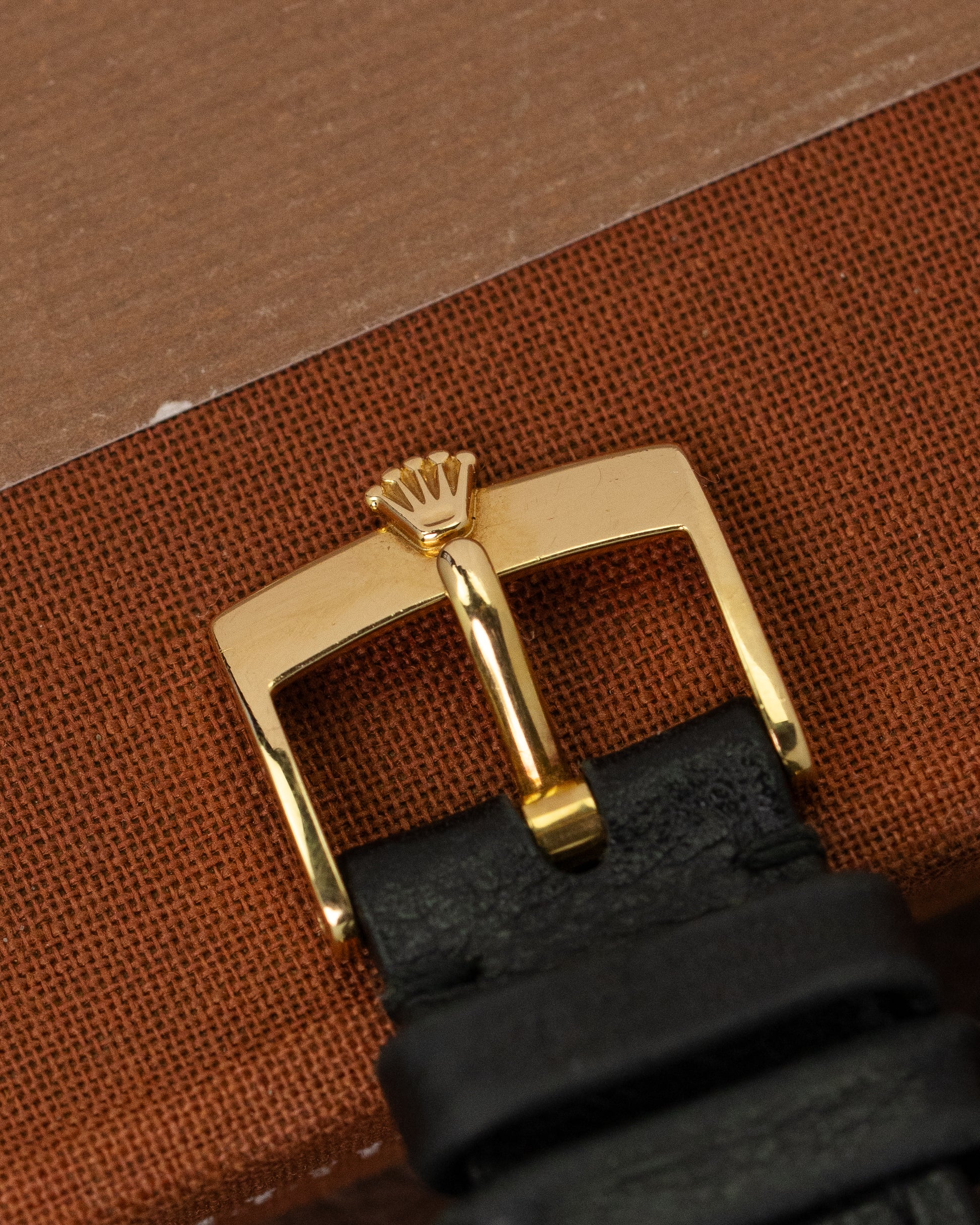 This particular piece dates to 1989 and features a black Roman numeral dial with gold-applied markers, a combination you don’t often see on this reference. It’s fitted with its original Rolex leather strap and 18K yellow gold buckle.