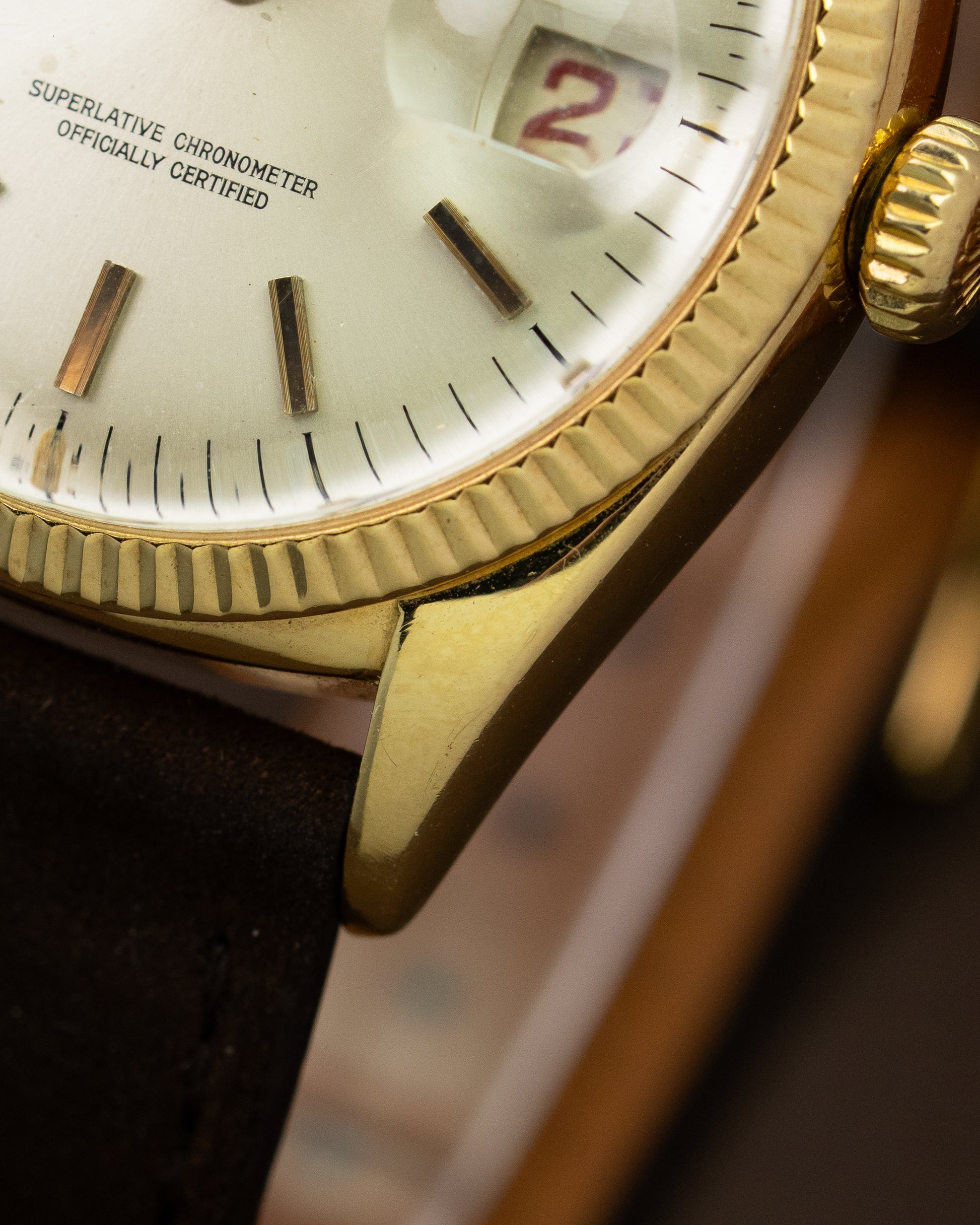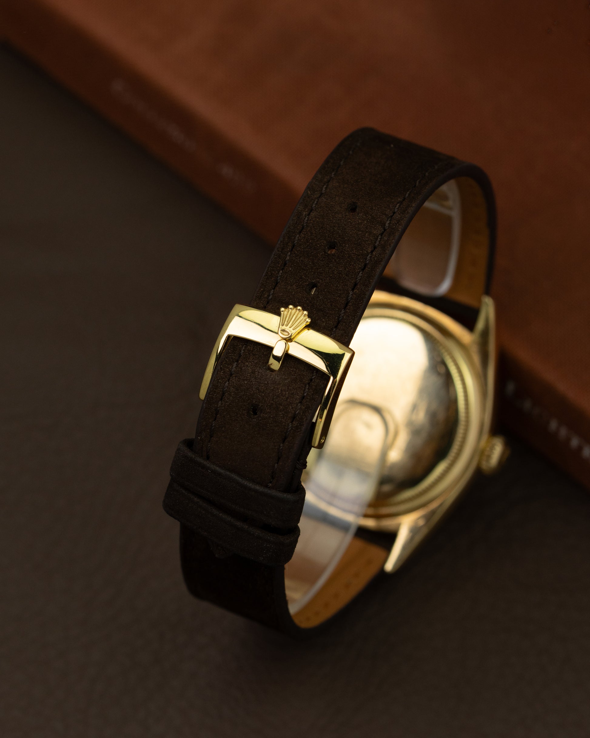 This Rolex Datejust dates back to 1963 as one of the last reference 6305 models. The case is made out of 18K yellow gold and is put on a leather strap to match it's classic appeal. It was most common for this model to feature a roulette date disk, however this example has an all red date disk making it a more rare piece. The dial has been replaced with service.