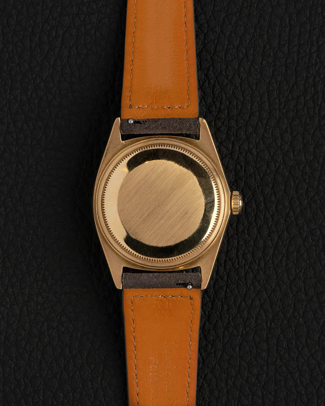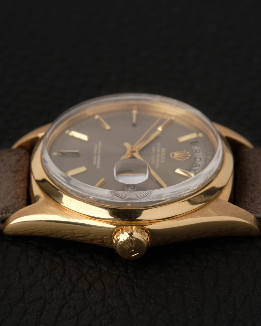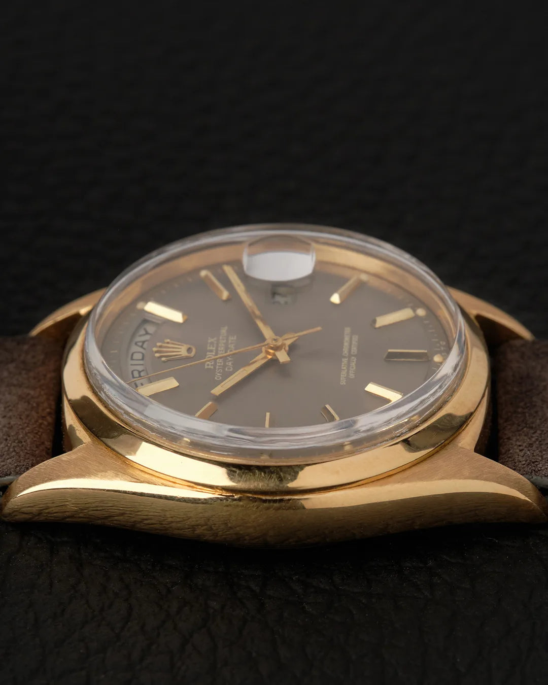 We present to you a Rolex Day-Date reference 1802 crafted in 18K Yellow Gold. The '2' in the reference refers to the smooth bezel, which is most of the times fluted. Because of the smooth bezel, all the attention is drawn to the dial.