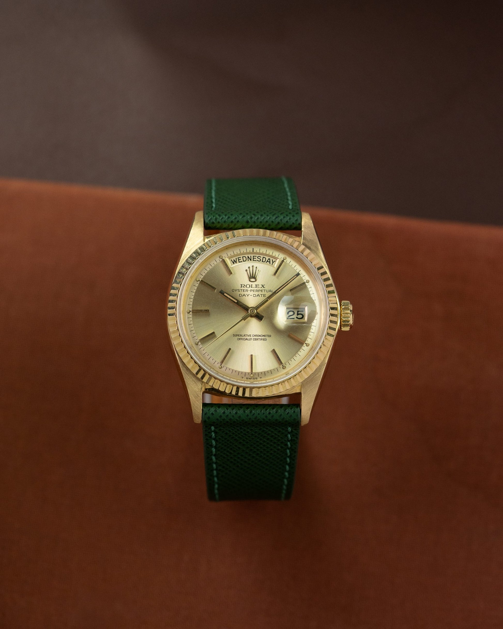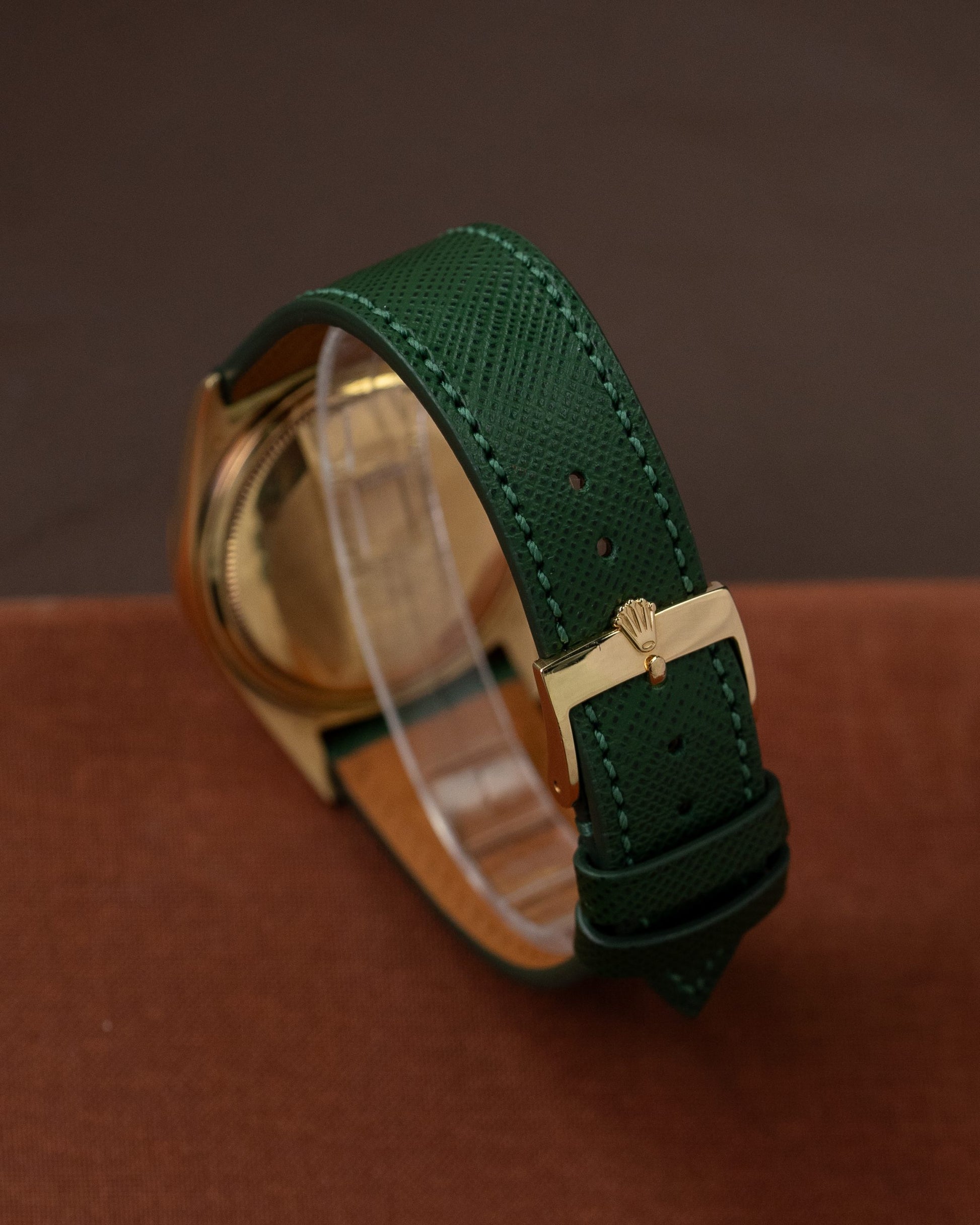 Crafted from precious metals such as 18k yellow gold, white gold, and platinum, the Rolex 1803 belongs to the brand's flagship line. While the Rolex Day-Date is often seen on a President bracelet, this particular model features a green strap with a Rolex buckle.