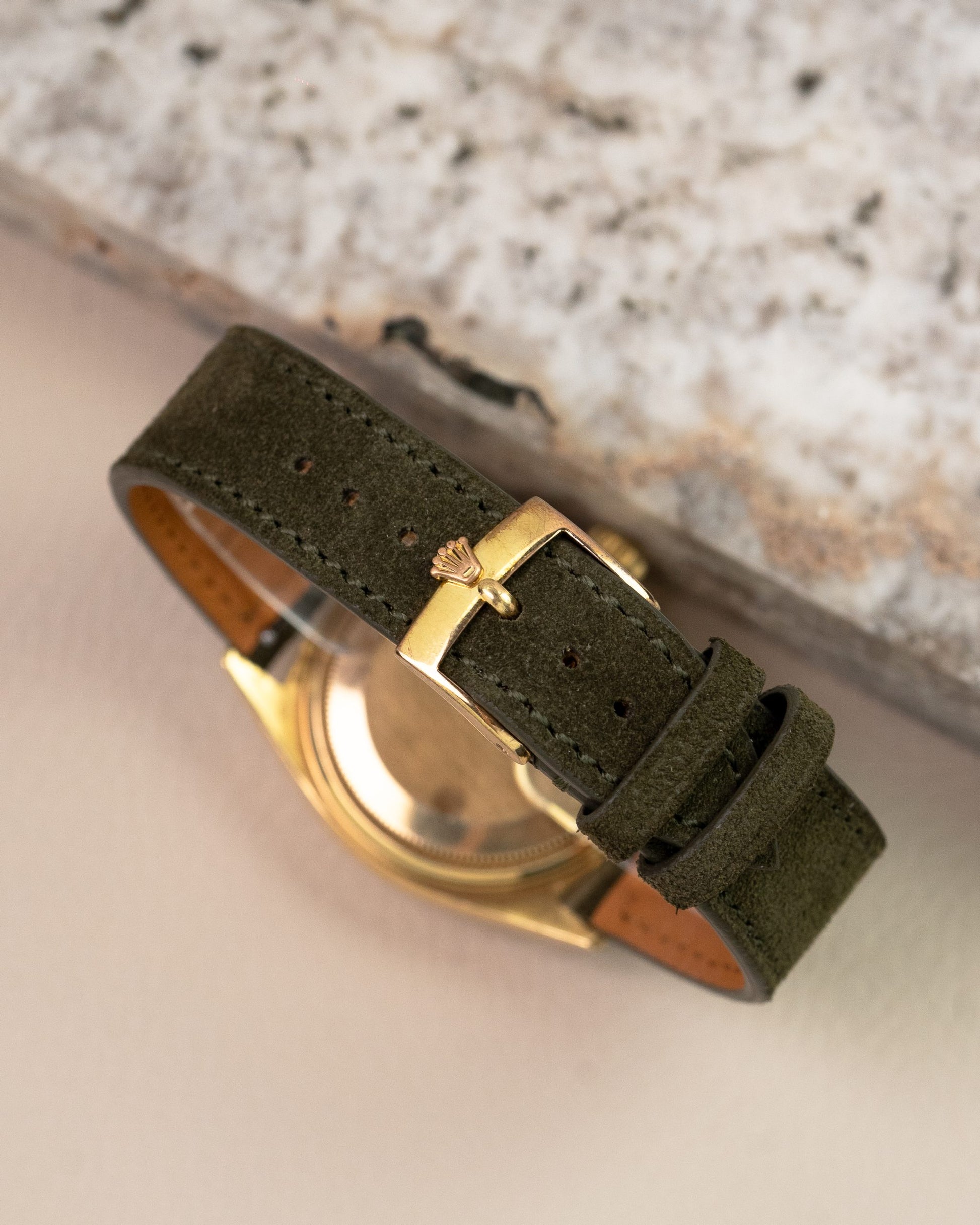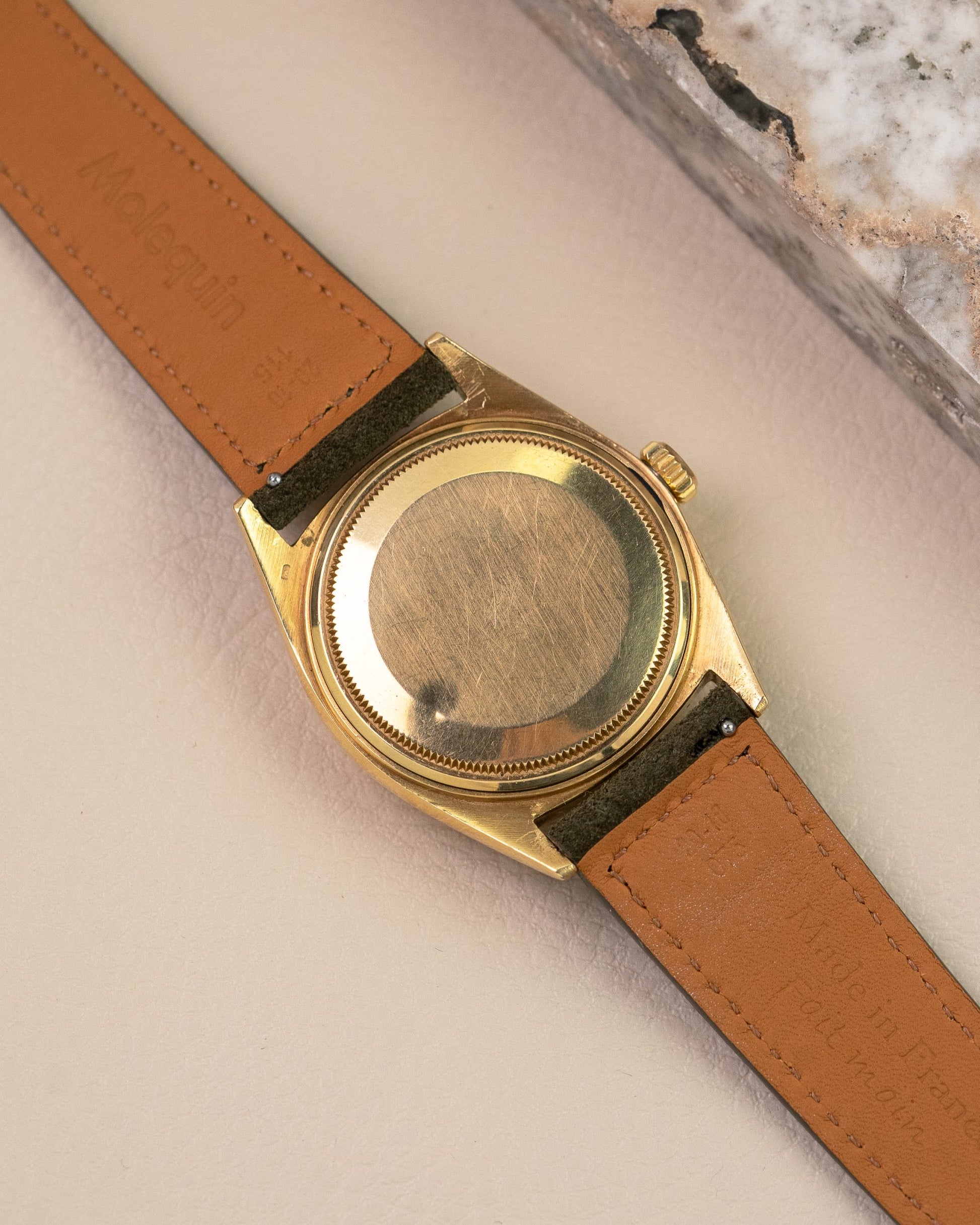 The 1803 never fails to amaze us due to its variety in configurations. There is so much rarity and uniqueness to be found in the 4 digit models from Rolex, and this 1803 is a perfect example. This Day-Date 1803 from 1965 features a beautiful silver dial which is complimented by many different design touches.