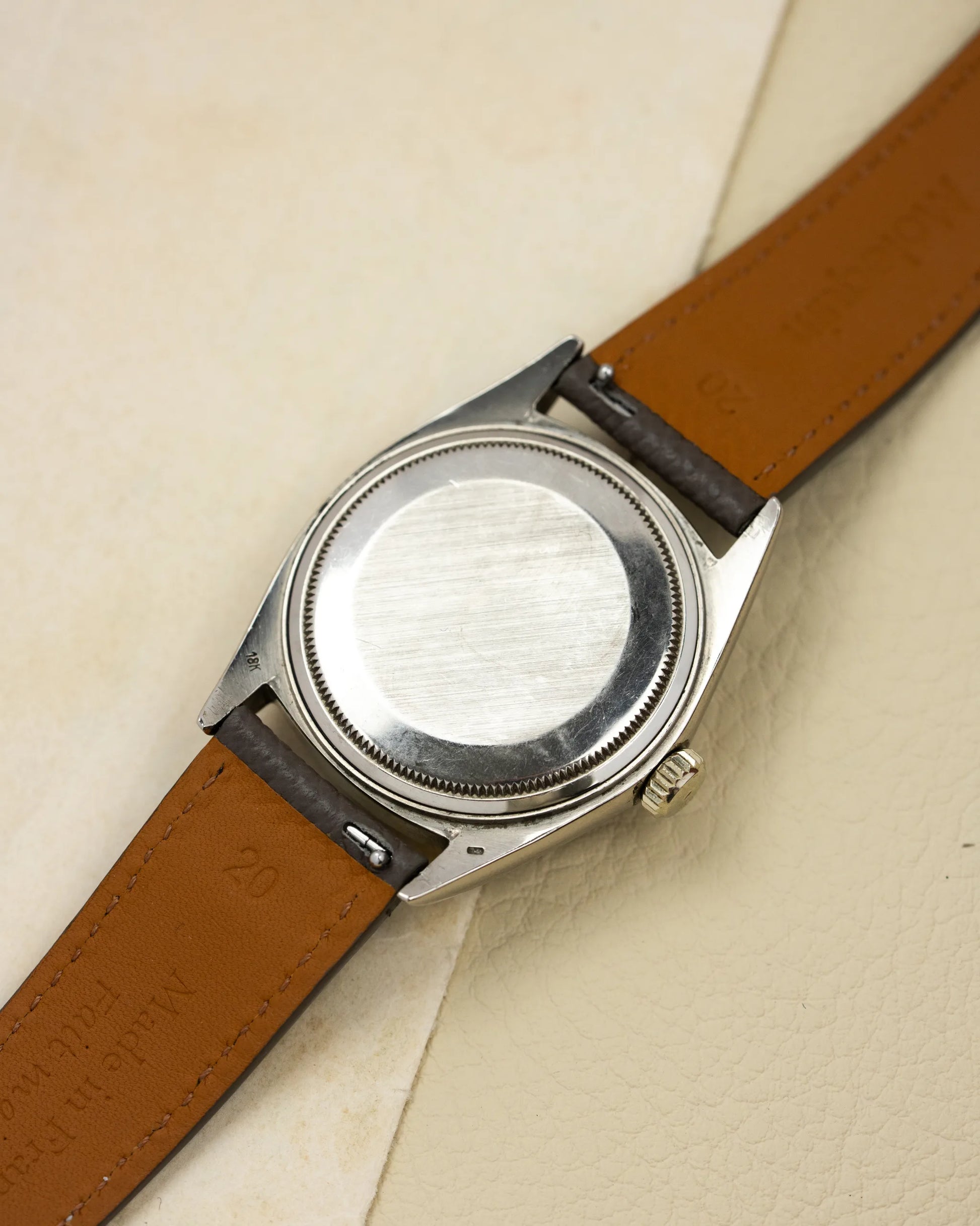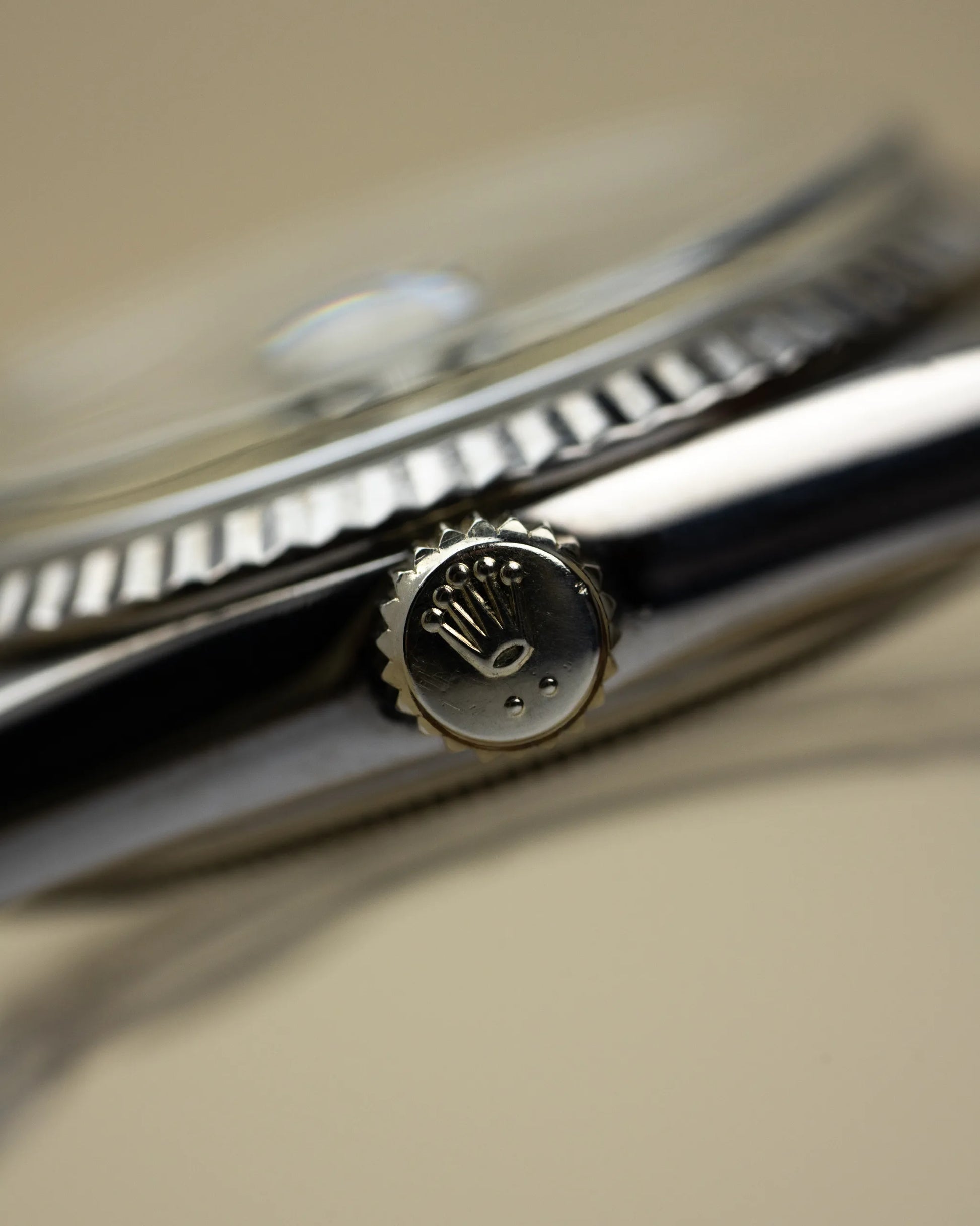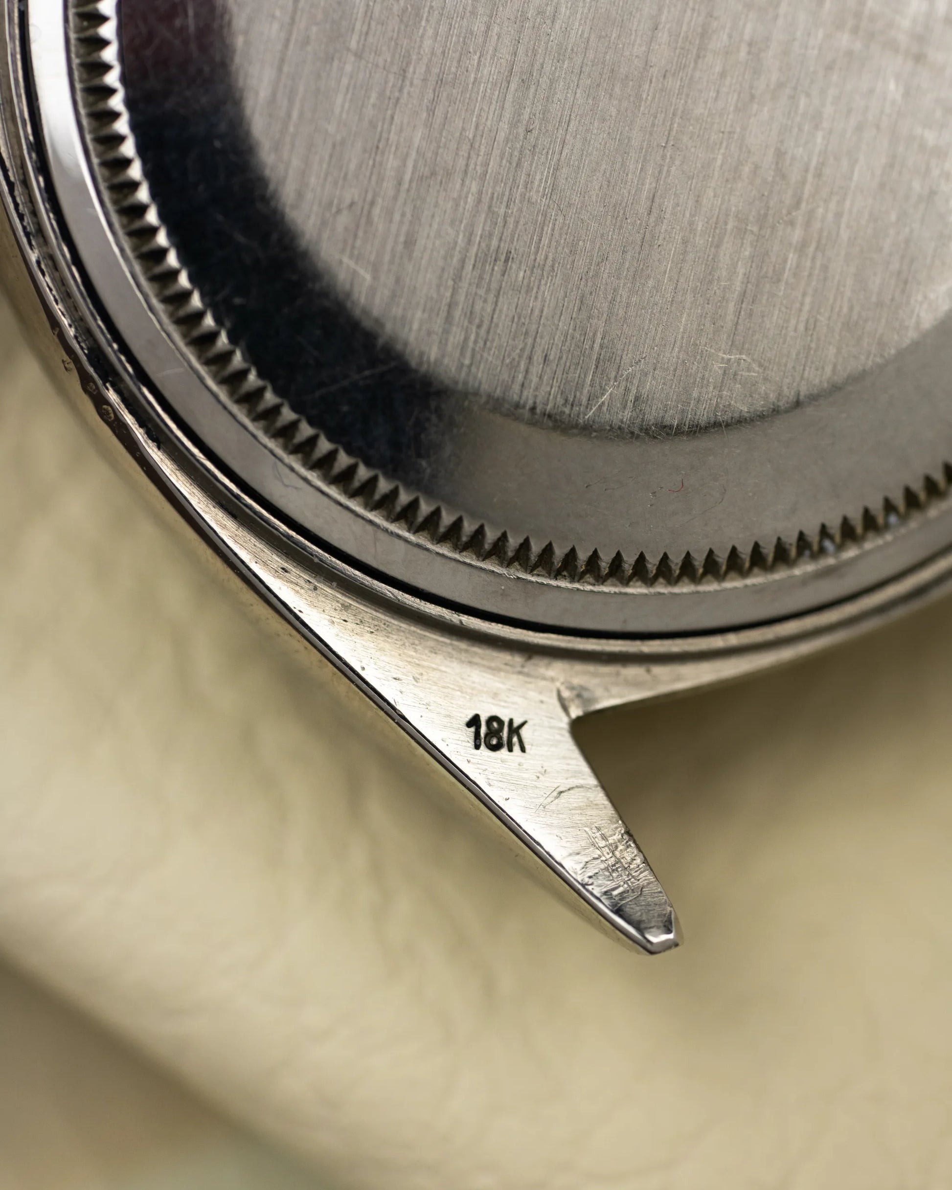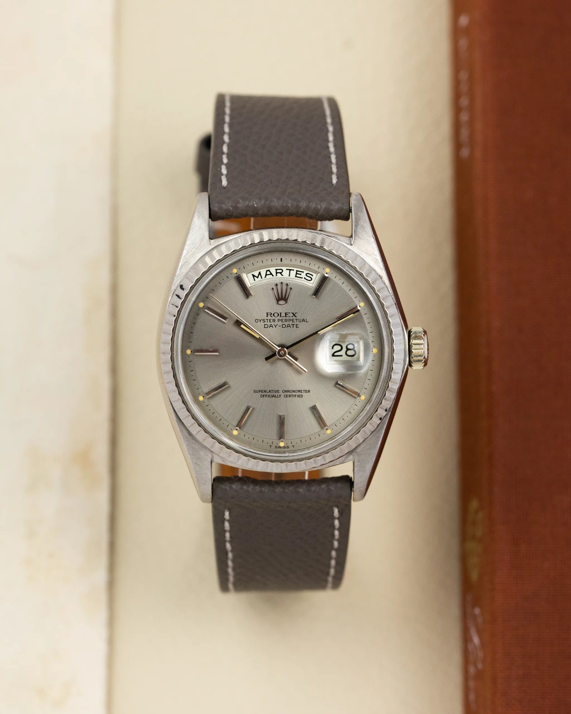 We love to offer something you won't see often, which is what this Day-date is; a great example of ref 1803 but in white gold. The stealthy choice, white gold gives the warmth and heft of gold, but in a classy way. It's a conversation piece, because some people may think it's a stainless steel watch. A perfect example of the phrase ''If you know, you know''