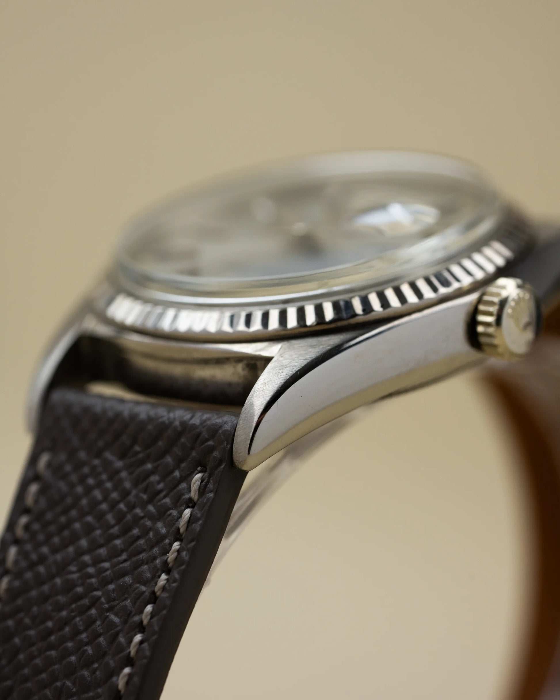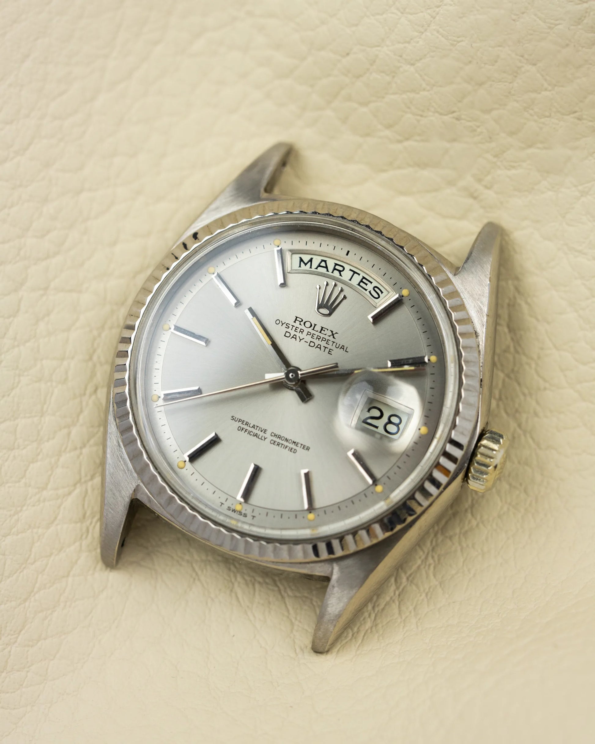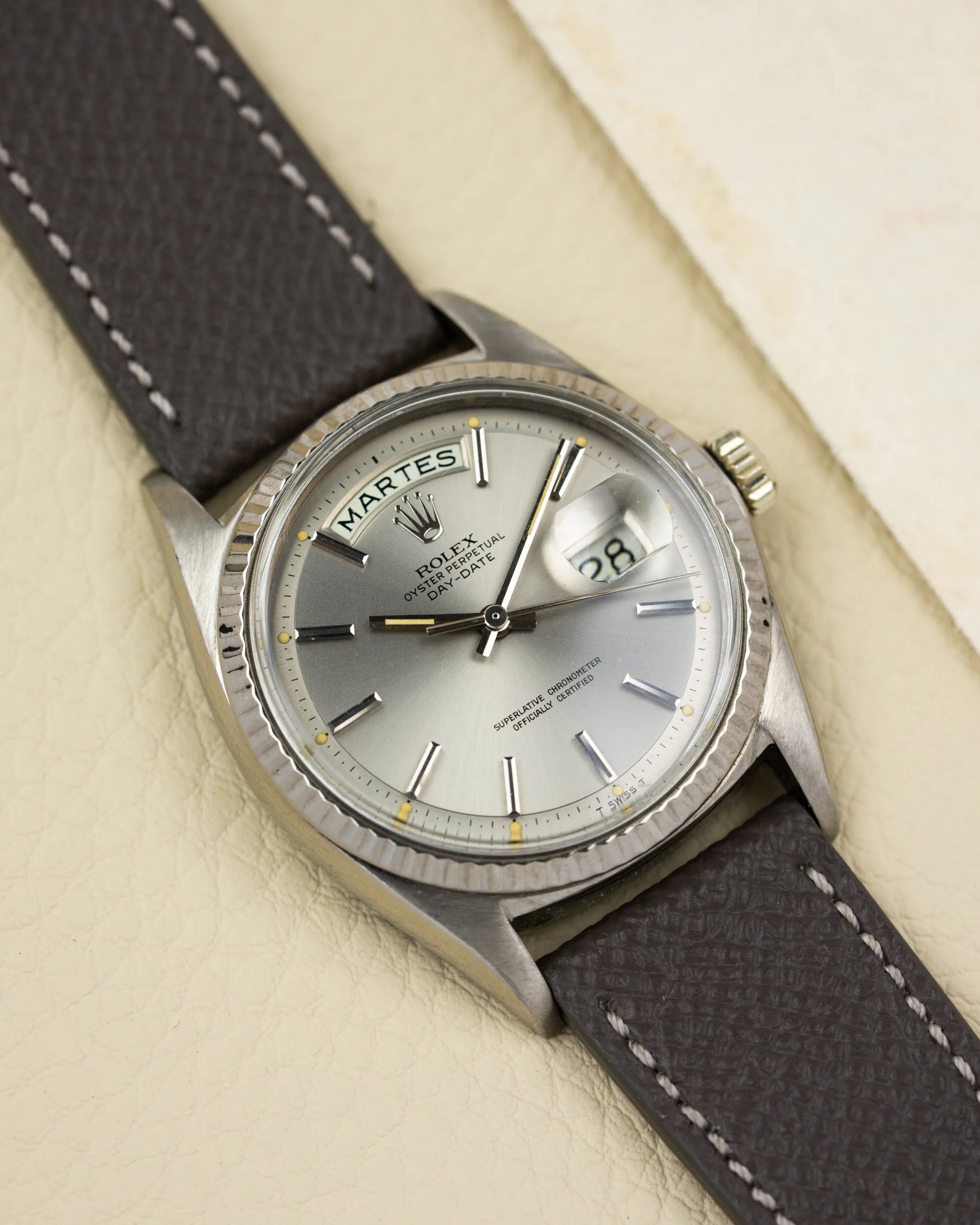 The watch houses a beautiful grey pie pan dial. The lume has an amazing patina. This Day-Date retains a strong case and the bezel is also in good and crisp condition. Always a pleasure to have a well-preserved 1803.