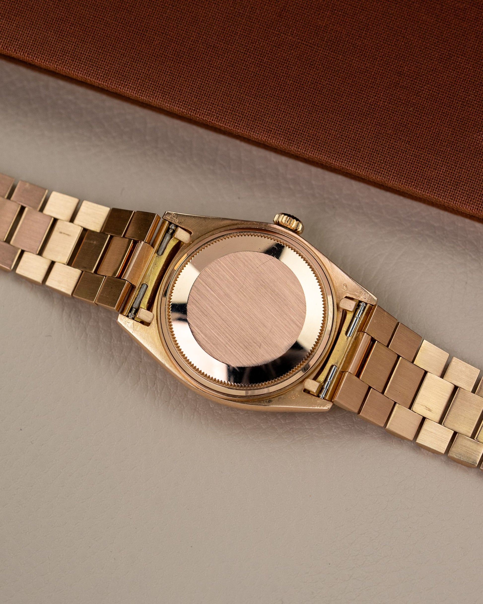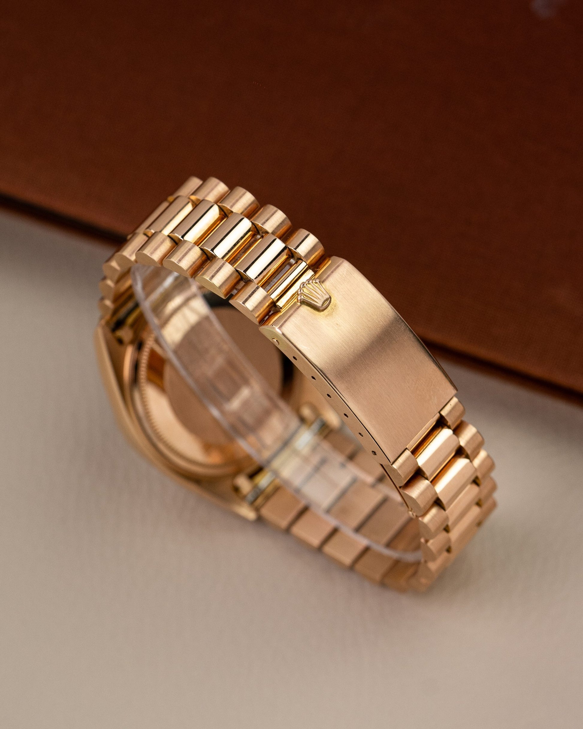 It's a pleasure to offer you a Day-Date which not only amazed us by its condition and rarity but also the feeling it gave us when we first saw it. This particular example is a silver dial rose gold 1803. This 1803 in one of the finest condition we’ve encountered yet.