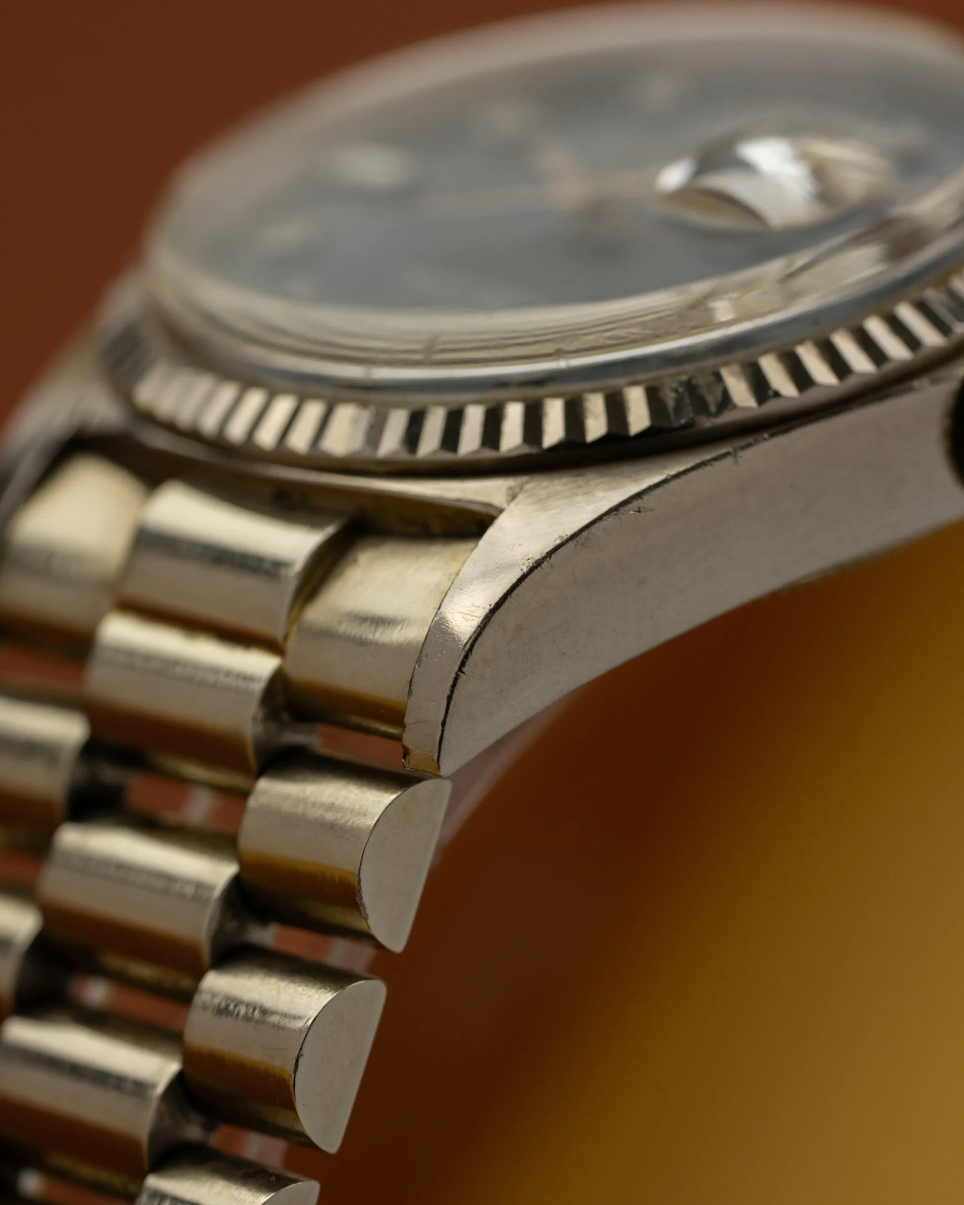It’s a sigma dial! Two small Sigma symbols enclose the T Swiss T that would tell you something that on this watch was probably a but unnecessary. The sigma symbols were added tot let the owner of the watch know that Rolex used precious metals on the dial, hands and movement. This was done so that the intrinsic value would go up, changing the perspective of those who bought these watches that it was worth just that bit more. Something that would not be as important on a fully white gold watch but its there nevertheless. The fact that it is fully white gold is already quite rare.