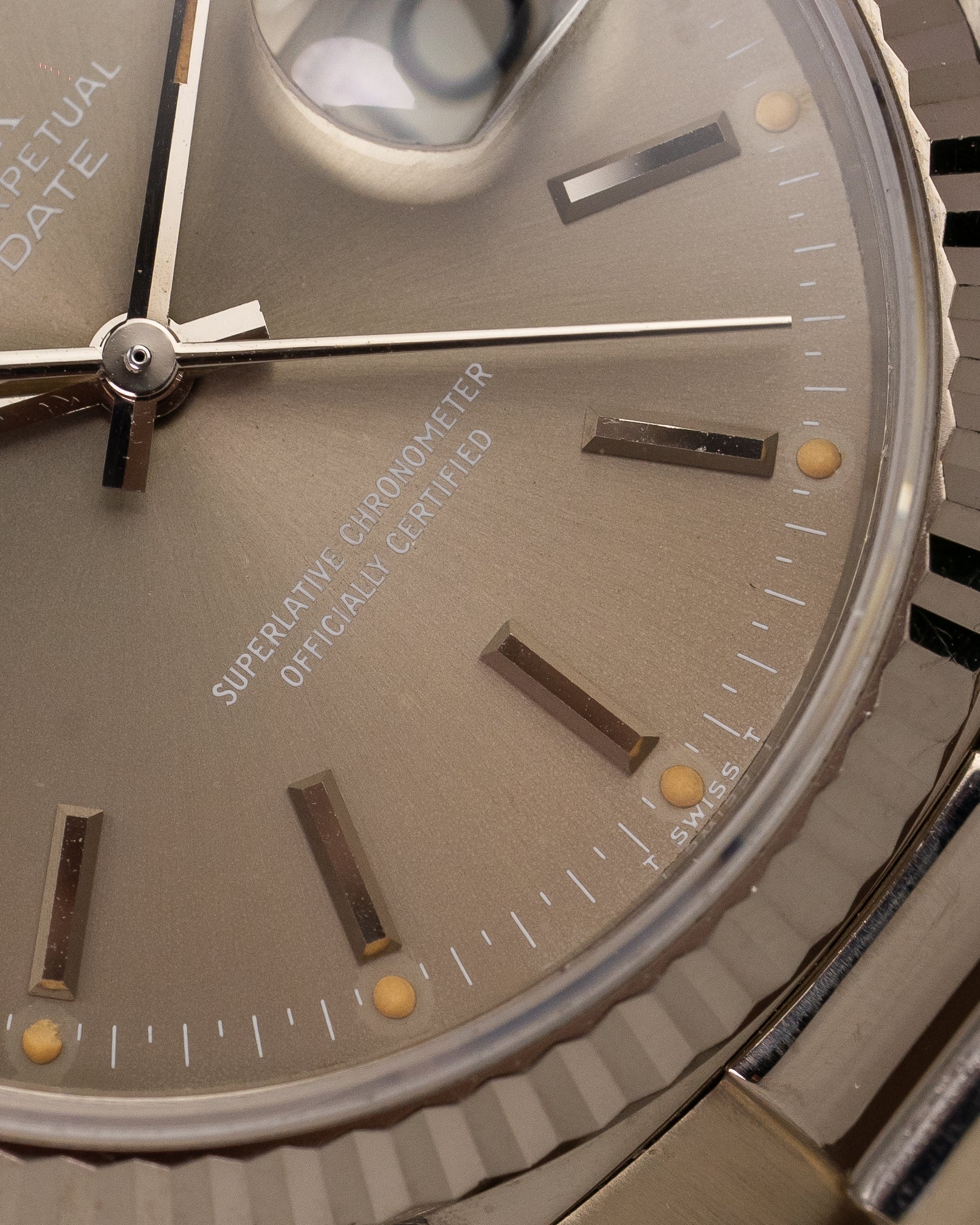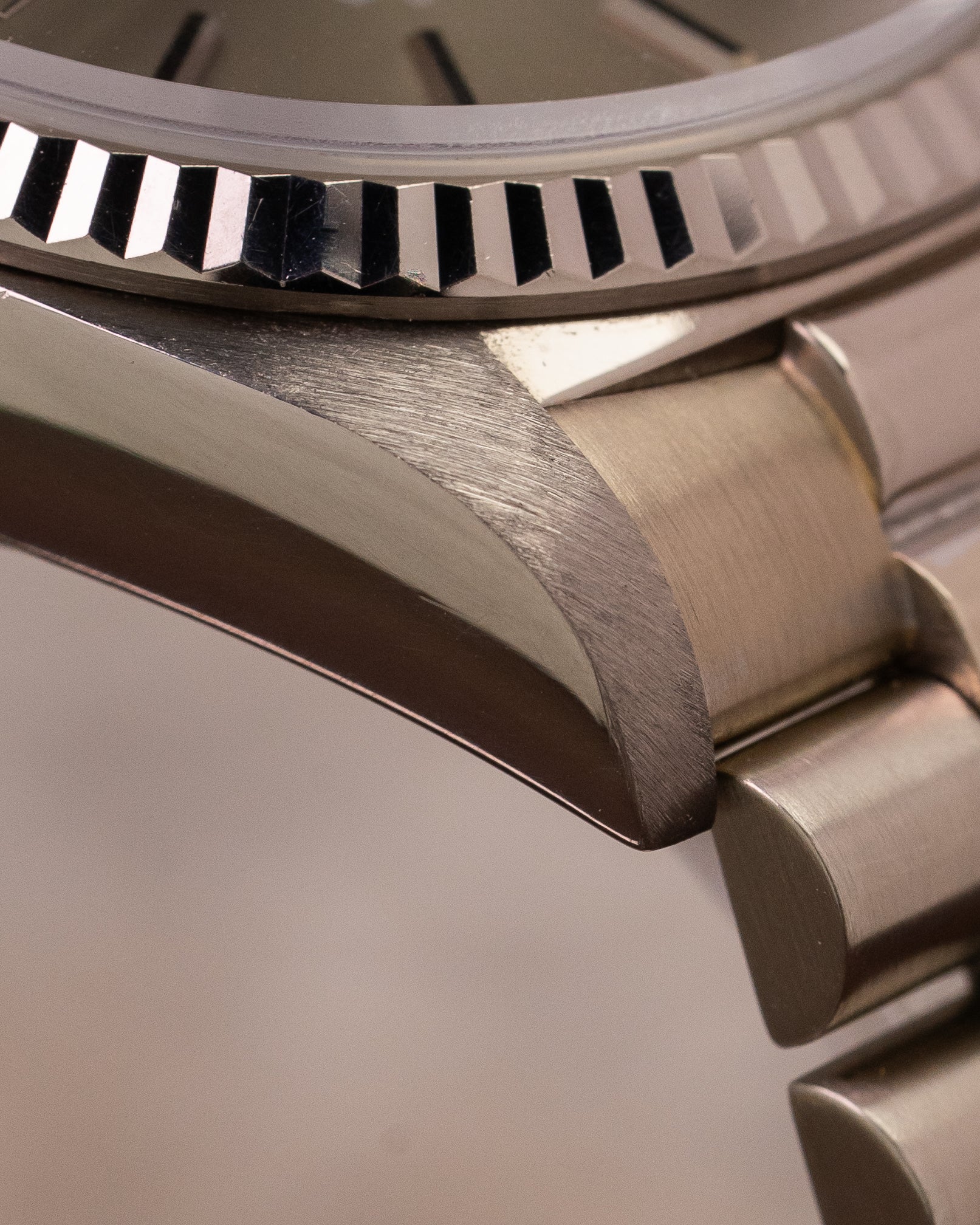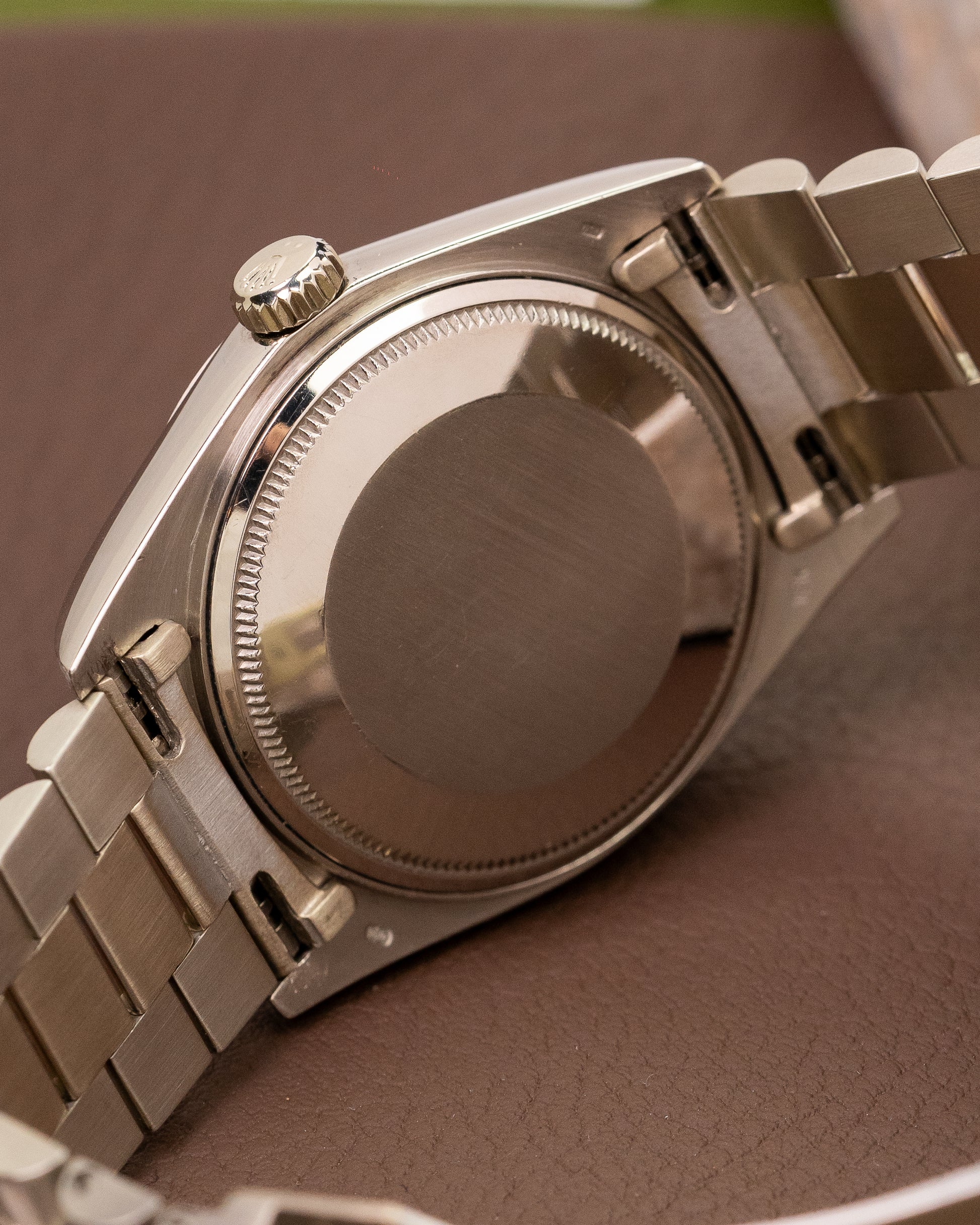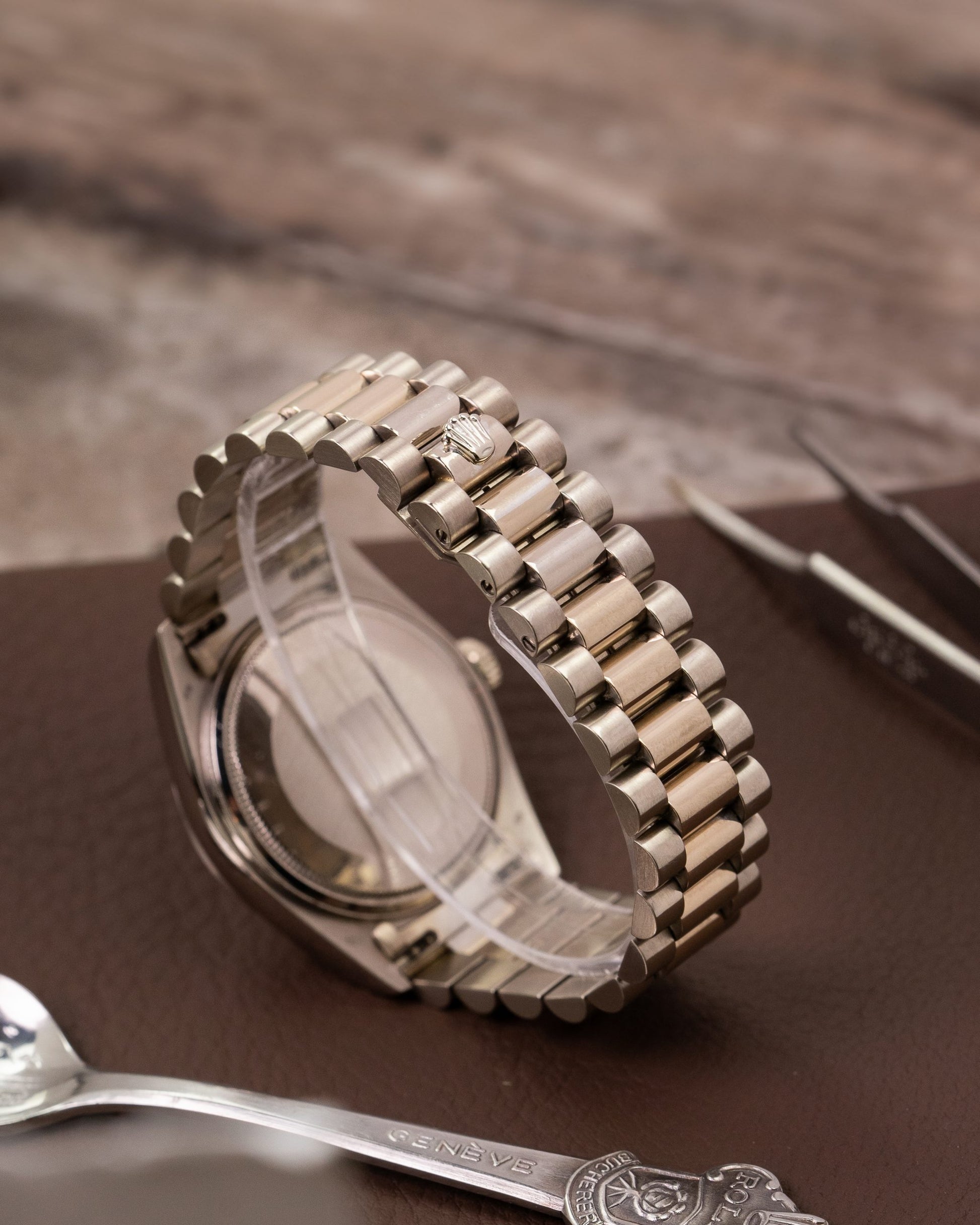 Sometimes a watch is just right. Just how you’d like to see them. This particular example is a a White Gold 18038 with a so called ‘Taupe’ dial. The ‘Taupe’ dial is one of our favorite dials ever, but the combination with white gold is just art. The Day-Date was mainly produced in yellow gold back in the days which makes the white ones a lot rarer. There is also another feature that can’t be missed.