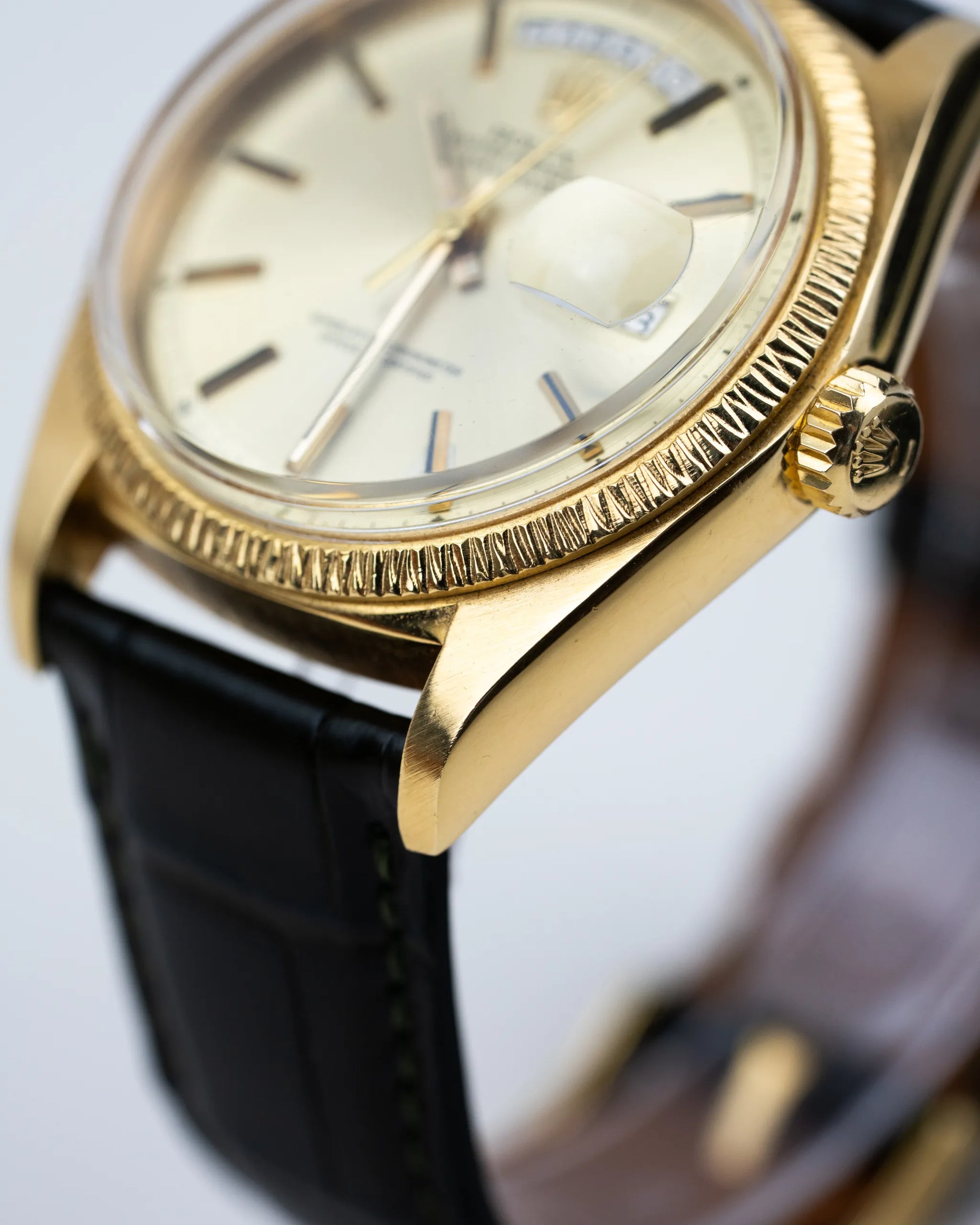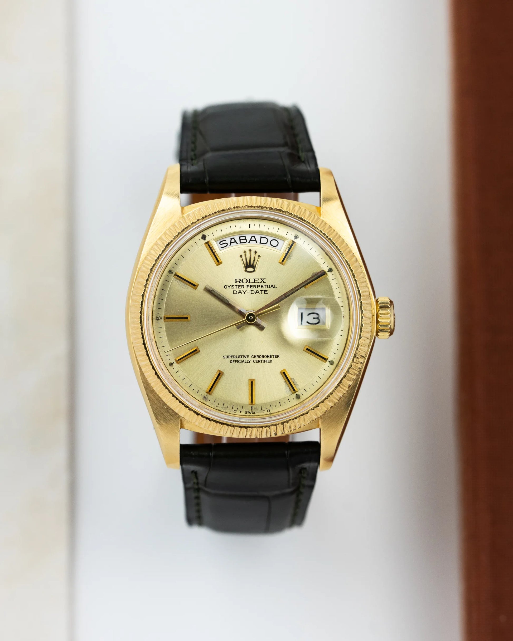 Crafted from precious metals such as 18k yellow gold, white gold, and platinum, the Rolex 1803 belongs to the Flagship line of Rolex. The Rolex Day-Date is most of the times accompanied by a President Bracelet, but in this case a Dark Green Alligator Strap with a Rolex Buckle.