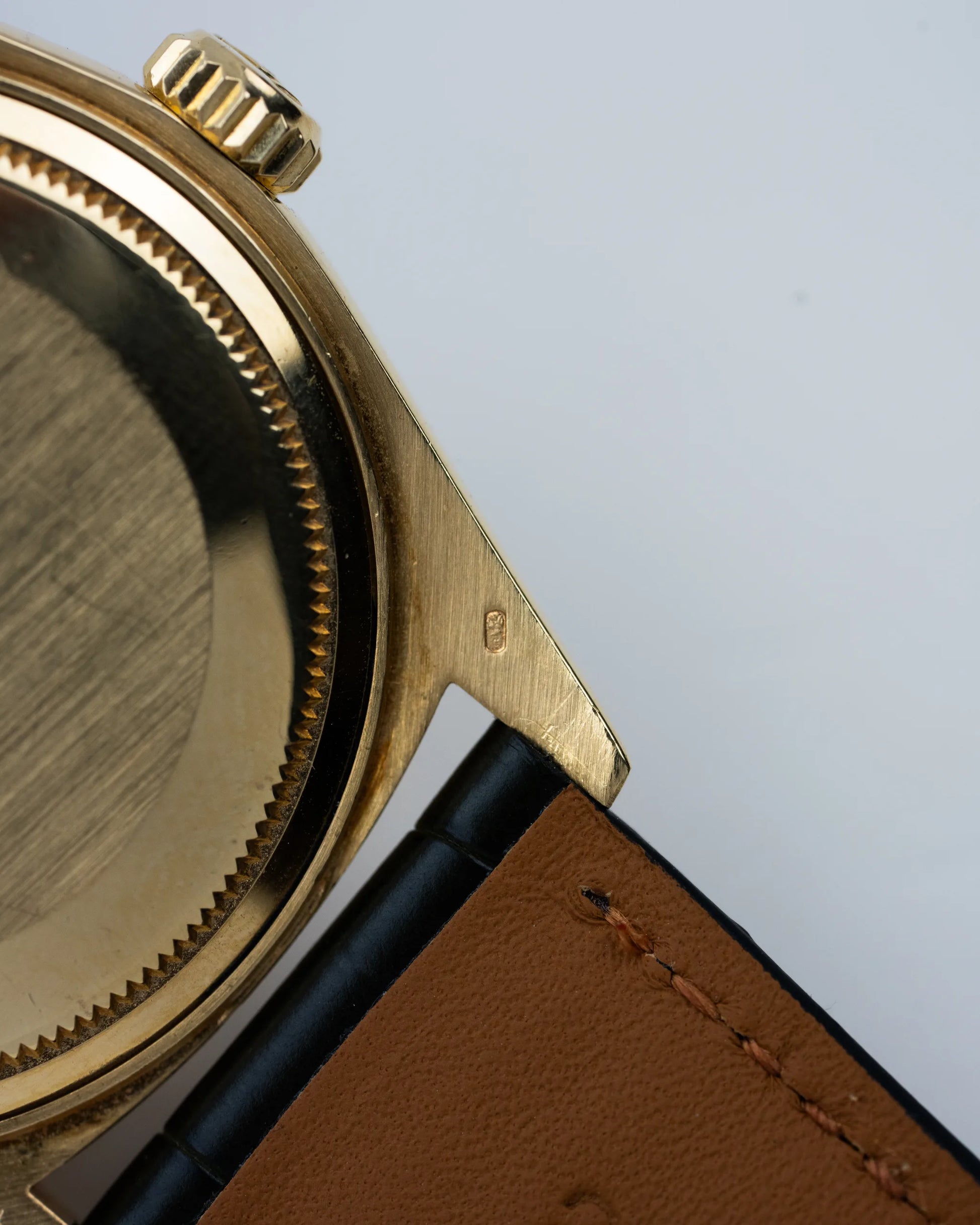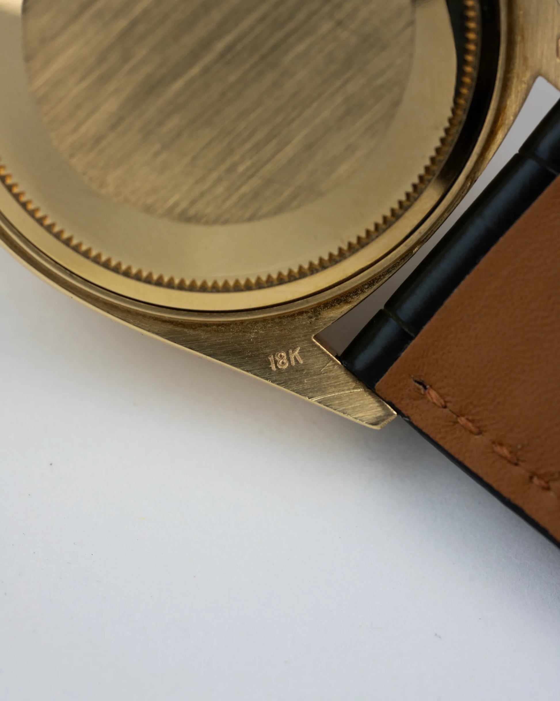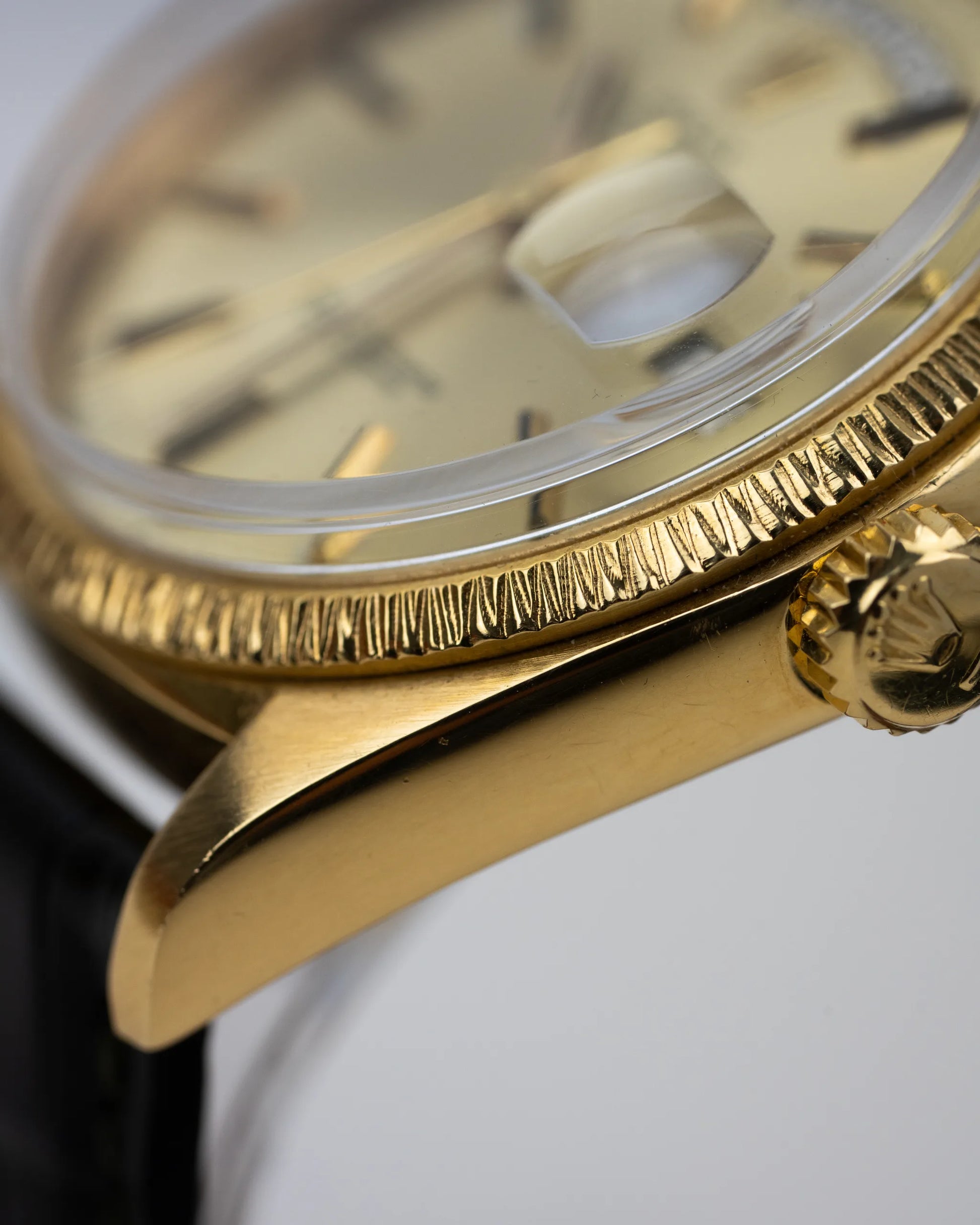 The eye catching part of this watch is the 'Bark' Finish on the bezel. It mirrors the texture of bark from a tree and was very popular during the '70s and '80s. One of the features of the Rolex 1803 is the Day-Date complication, which displays both the day of the week and the date on the dial. This watch features a Pie-Pan Sigma Dial.