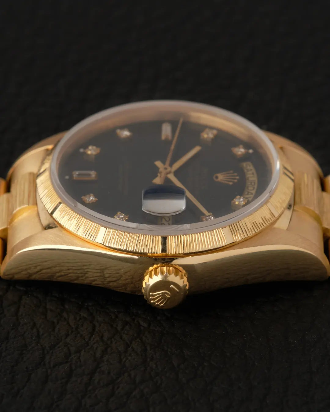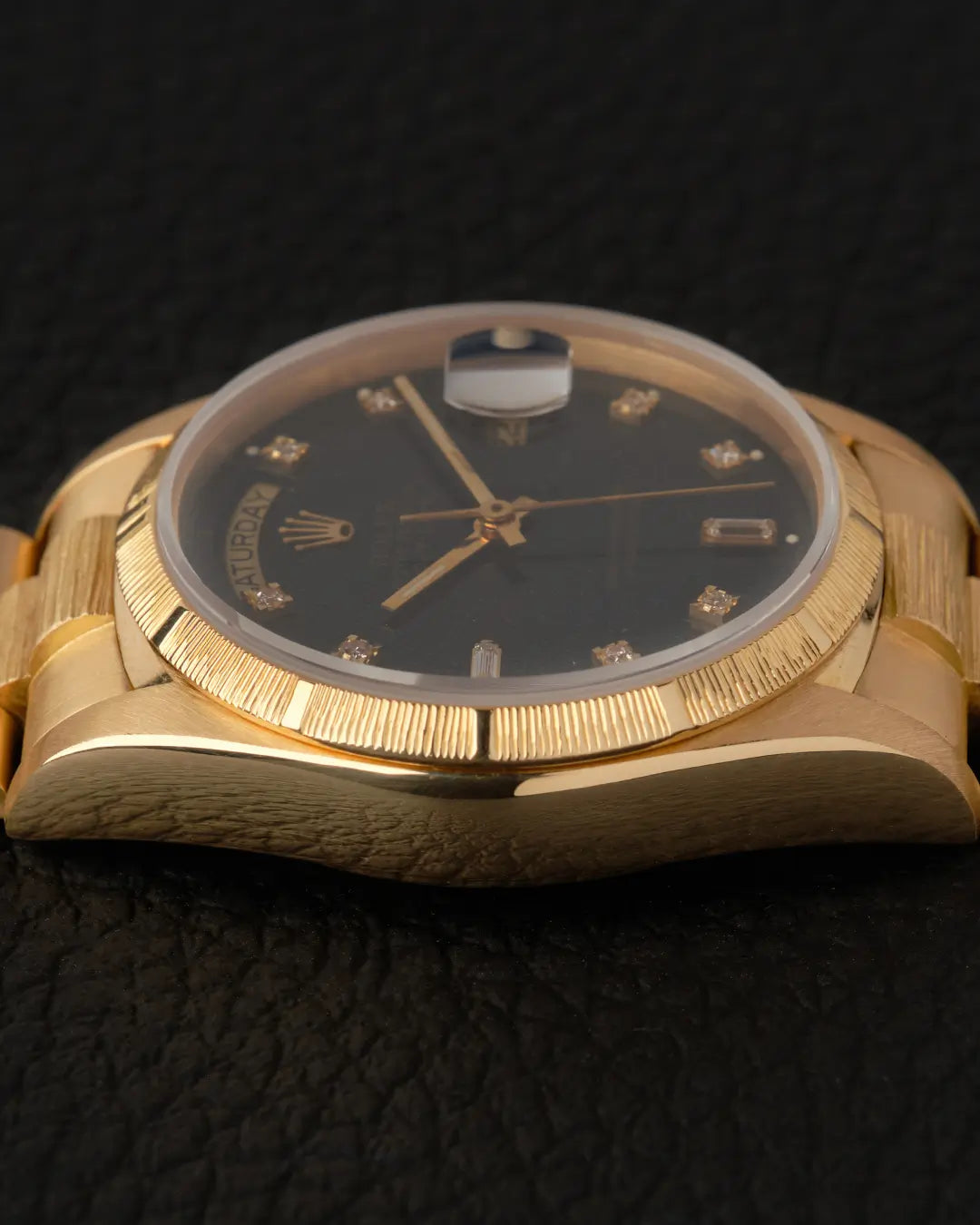 Another Day-Date has joined our collection, this time it's a 18078. The '7' in the model number refers to the finish displayed on the bezel and bracelet, named 'BARK,' named after the textured surface of tree bark.
