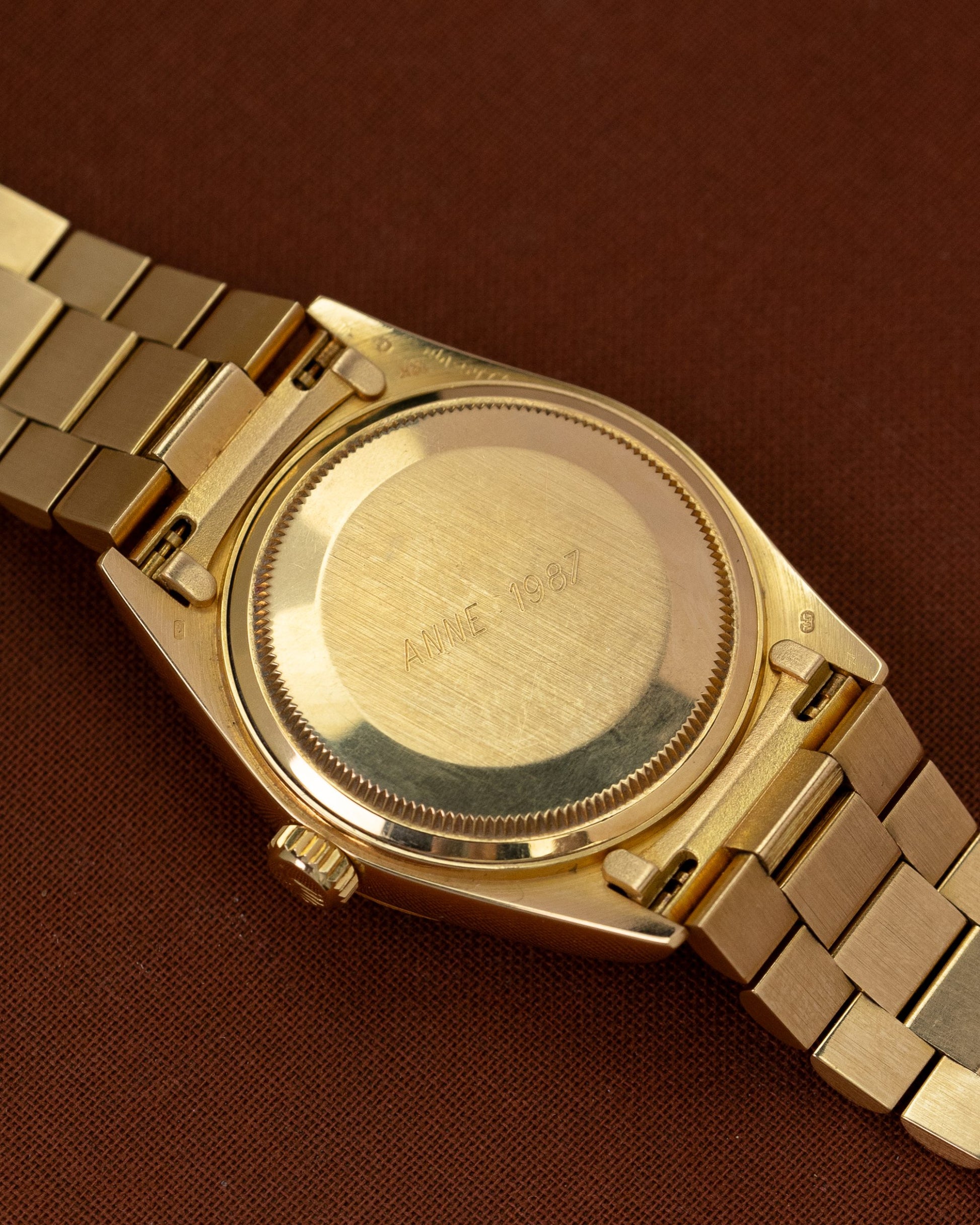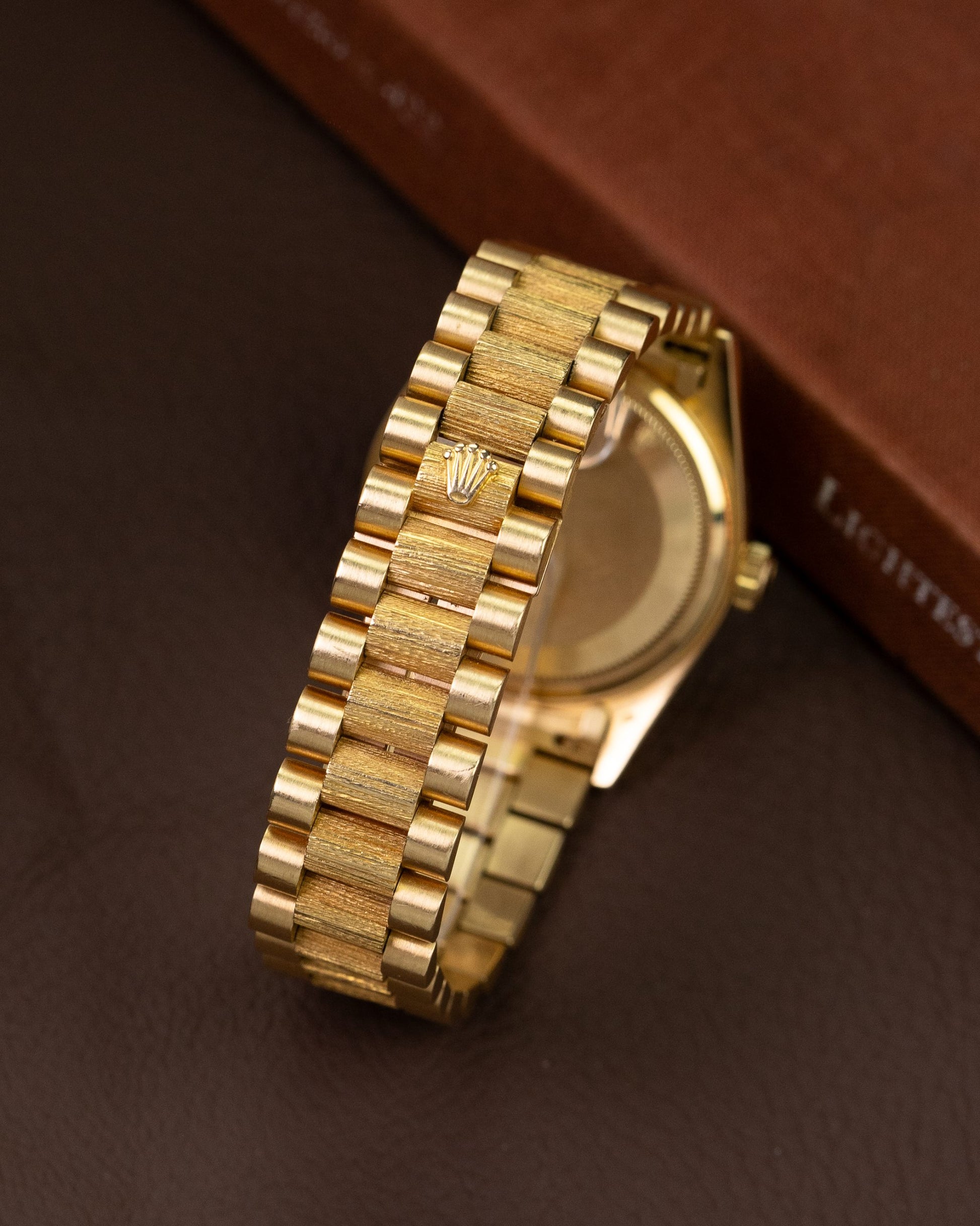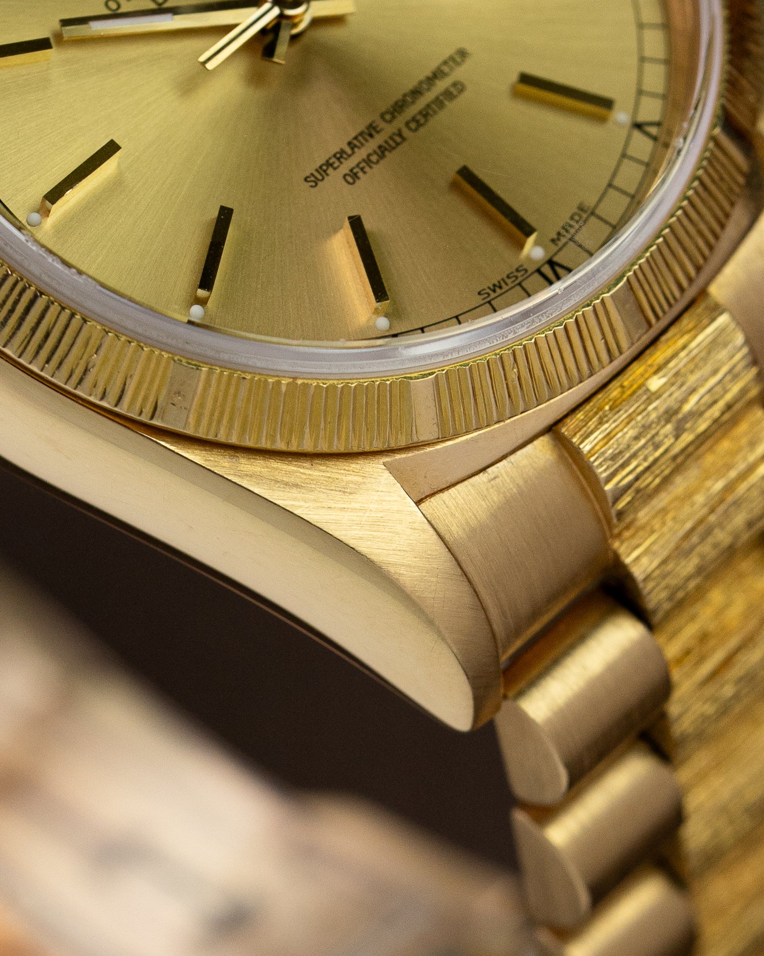 Here is another Rolex Day-Date 18078 Bark in perfect condition. The "7" in the reference number refers to the Bark finish on the bracelet and bezel, which resembles the texture of tree bark. This unique finish was first used by Rolex in the late 1960s. Rolex no longer produces watches with this finish, which is why we're happy to offer this example in outstanding condition—featuring sharp lugs and a bracelet with no stretch.