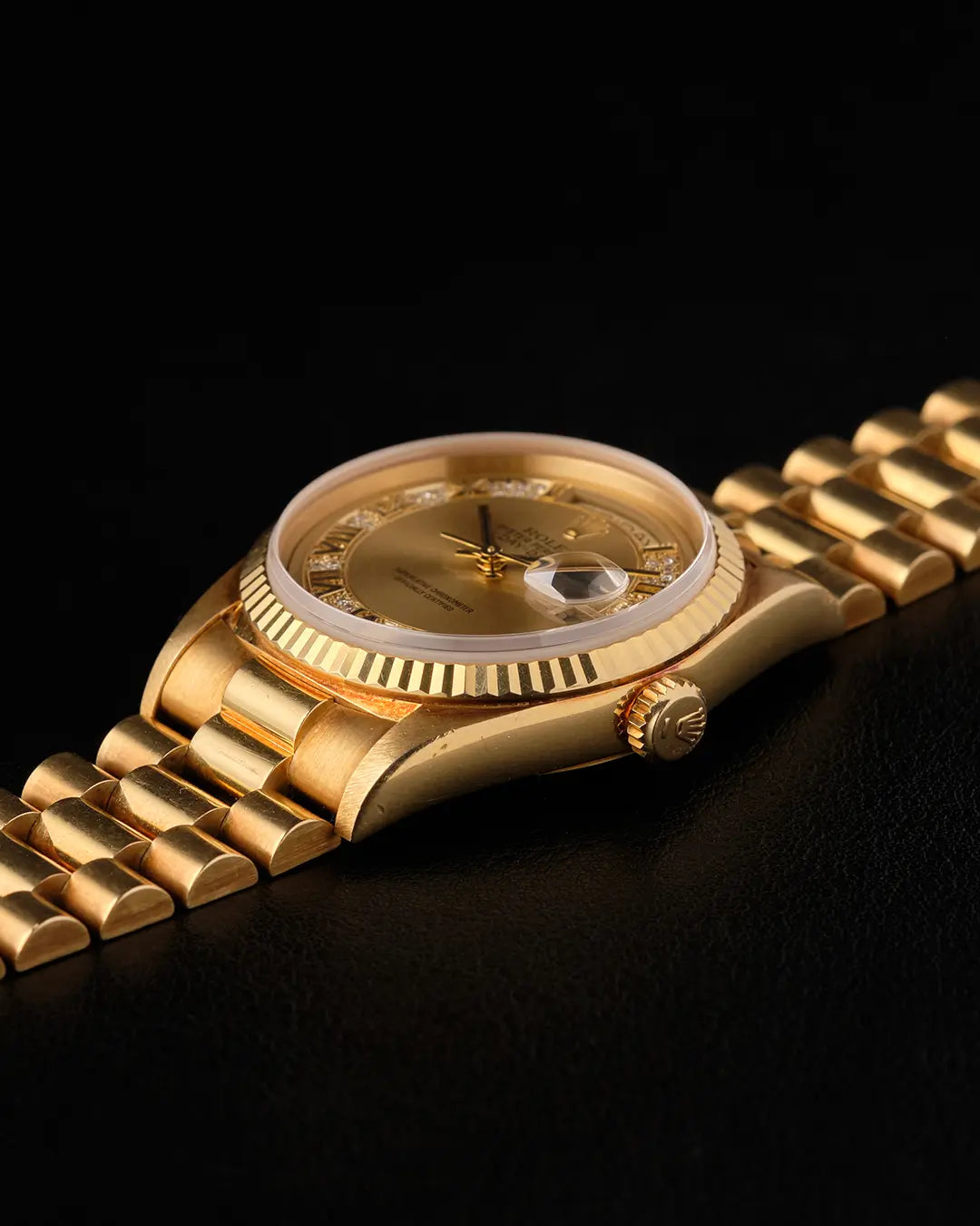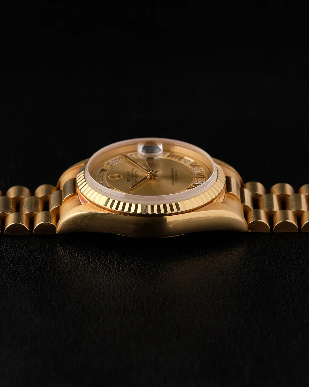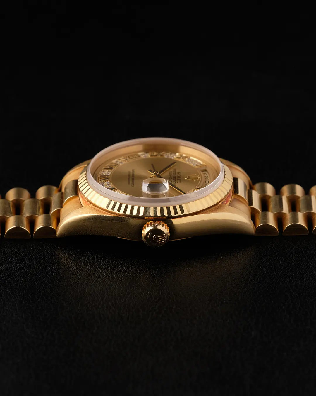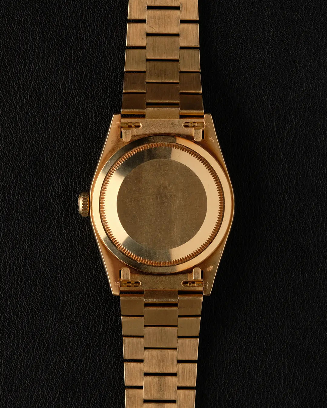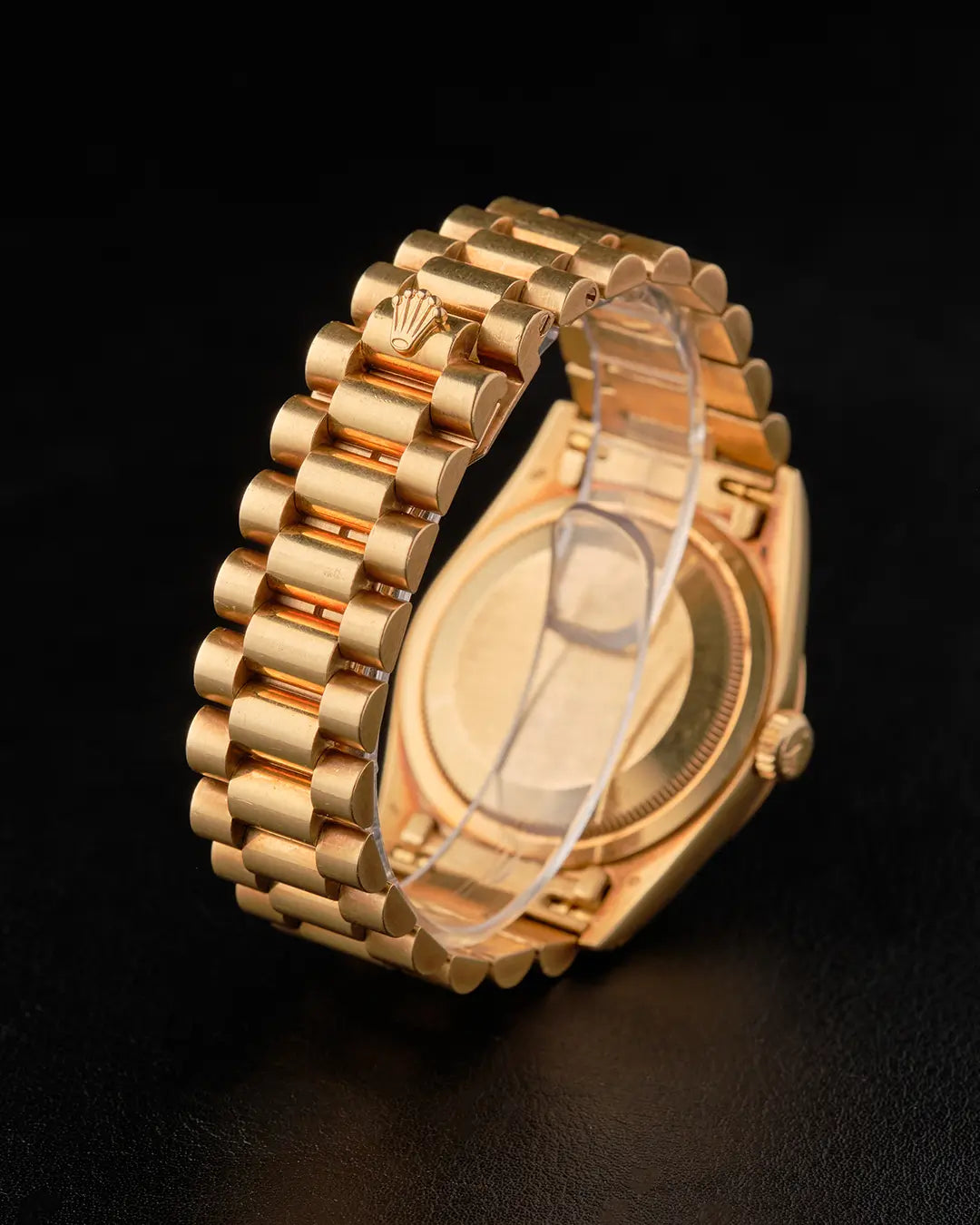 The meaning and use of the ancient word myriad is 10.000 or when spoken about an indefinite large number. This contradicts the rarity of this Rolex Day-Date Myriad. Whilst diamond set day dates are not that uncommon, this specific lay out is. On first hand, the dial looks really clean but when taking a closer look, many little diamonds are to be found on the outer side of the dial giving it an extra dimension. What else makes this watch special is its condition. A beautiful patina can be found on the bracelet and between the lugs and the love marks confirm this watch is unpolished. A true vintage enthusiast watch worth seeing in person.