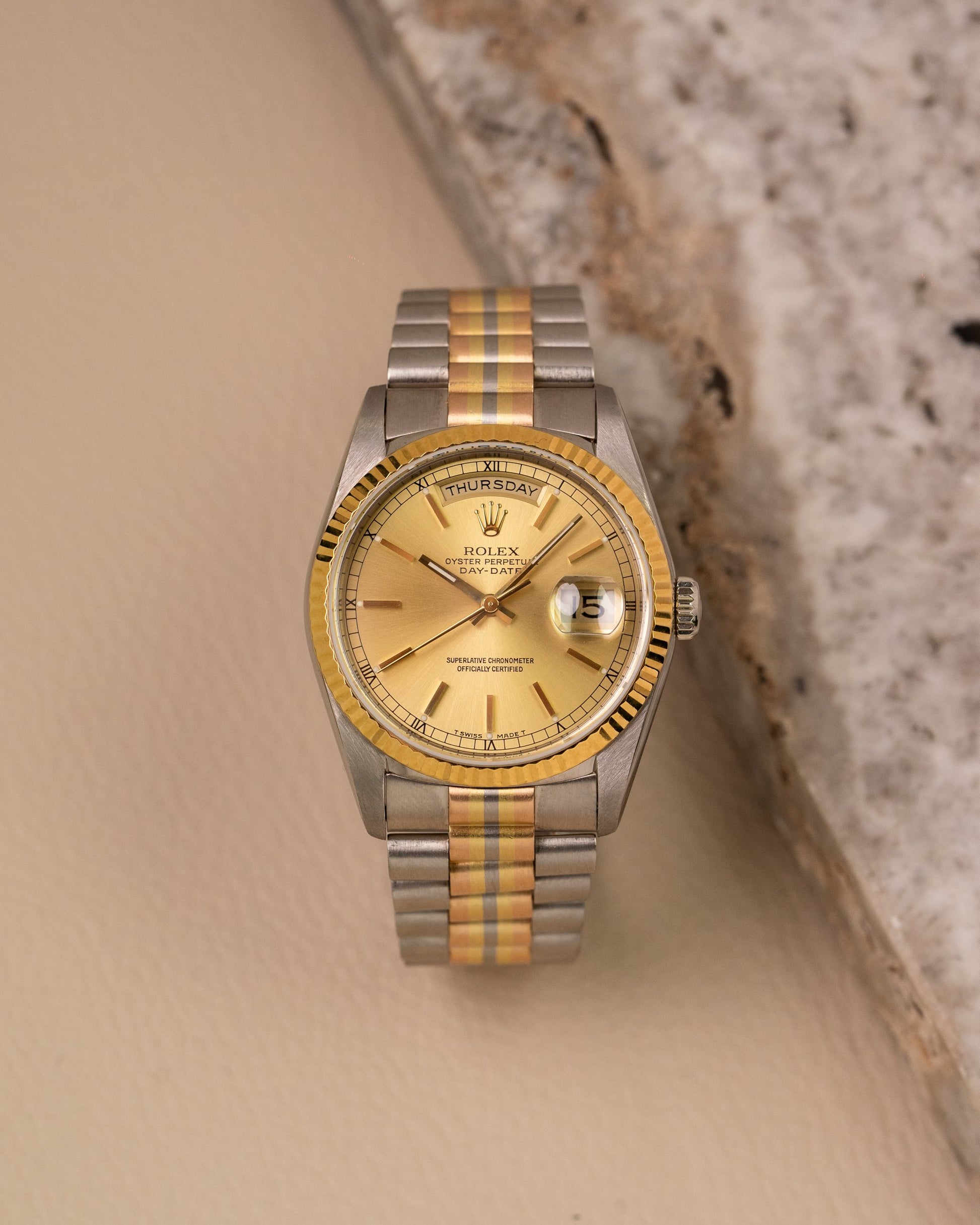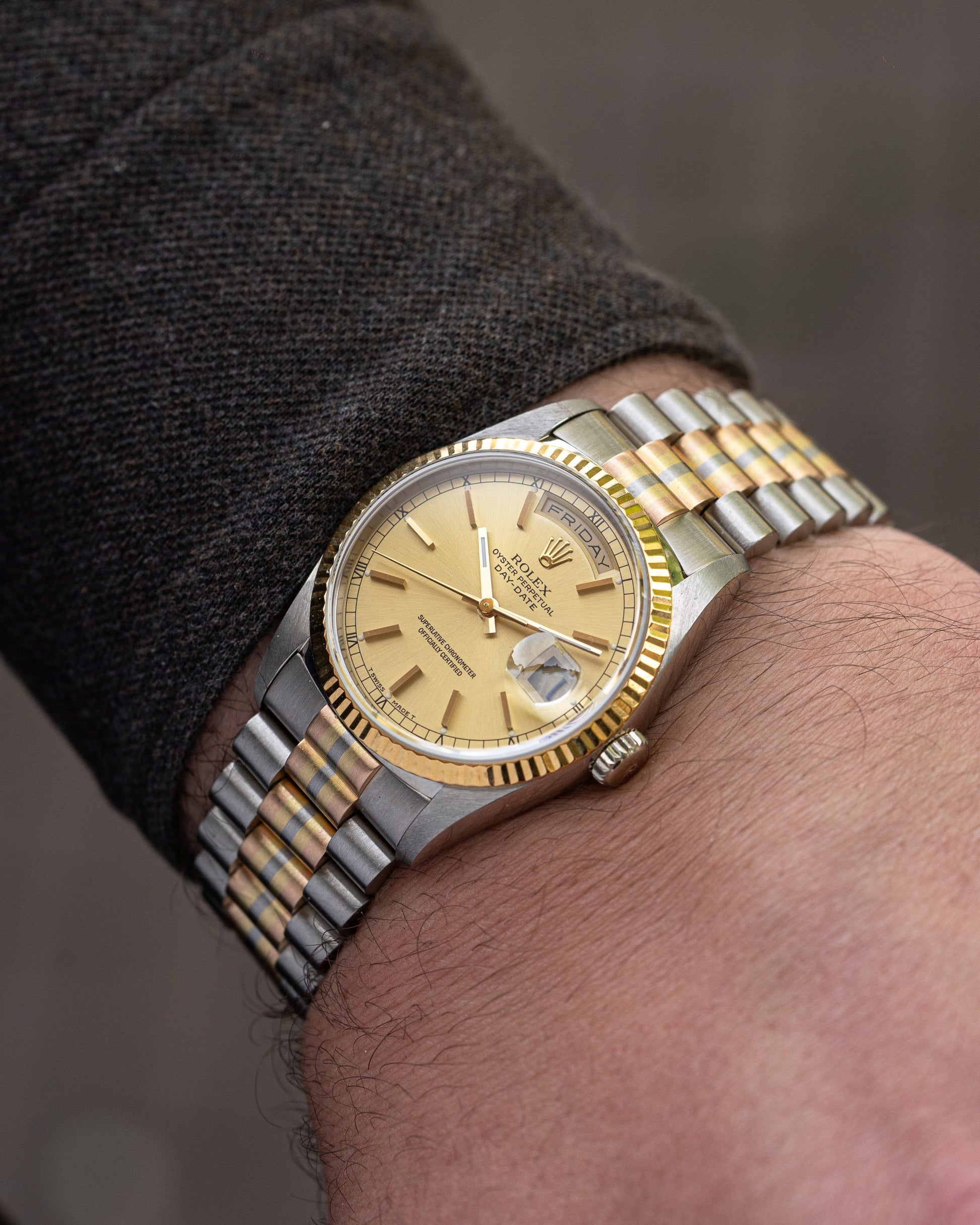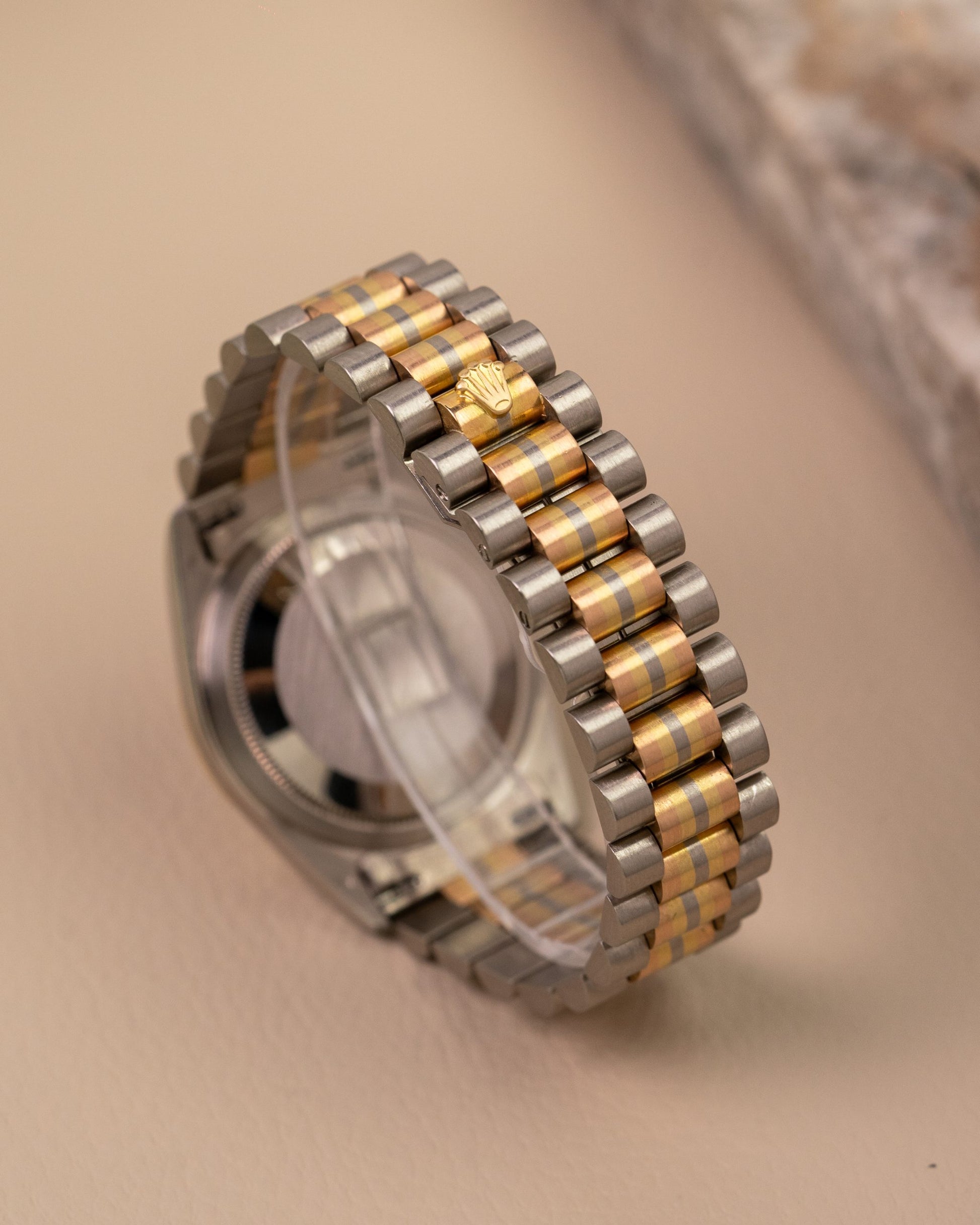 Here we have a Rolex Day-Date that we don't see often. The reference 18239B features a case primarily made of 18K white gold. The fluted bezel is made of yellow gold, but the most interesting aspect is the bracelet. It showcases a combination of three gold materials: yellow gold, white gold, and rose gold—a blend also seen in watches from other brands.