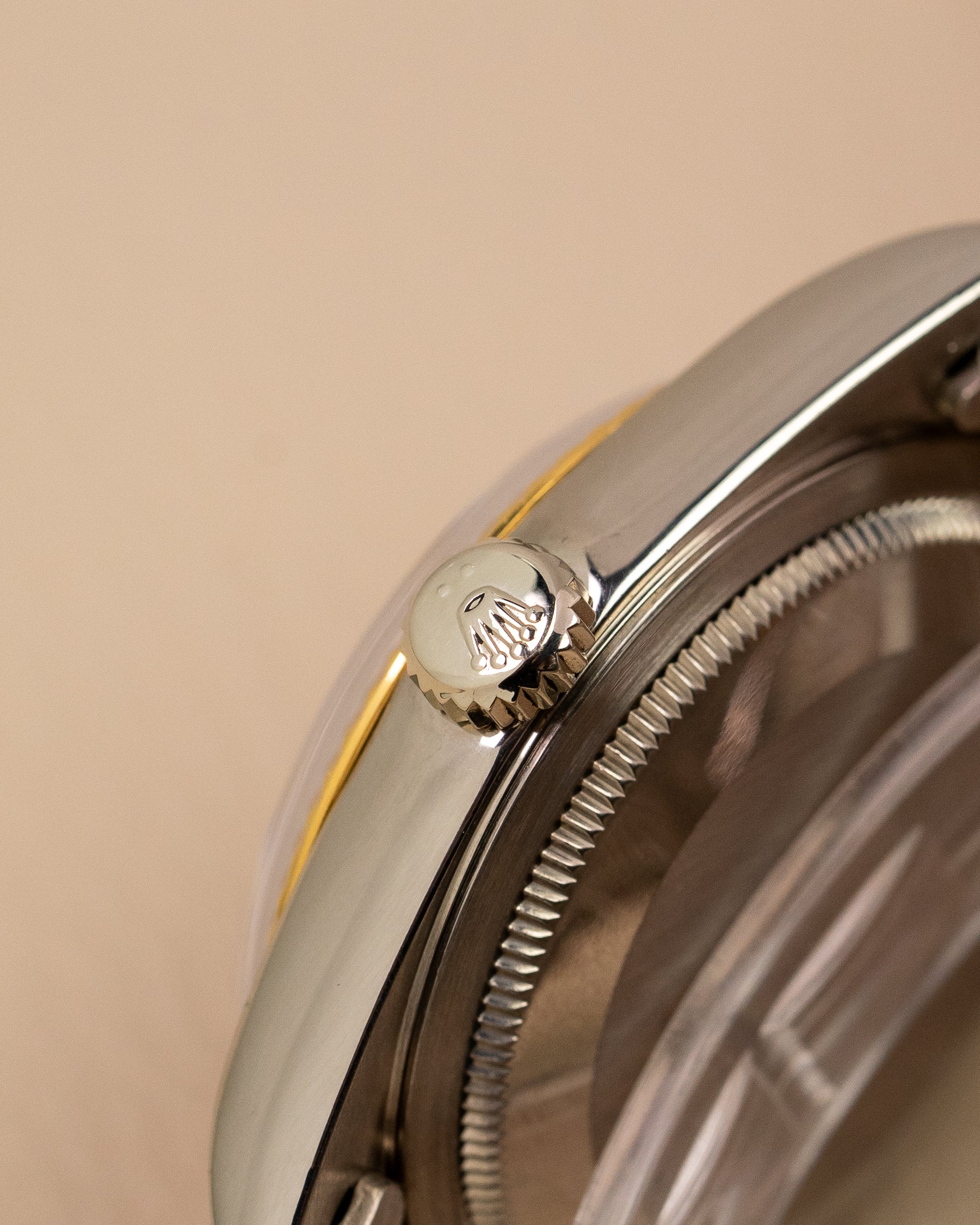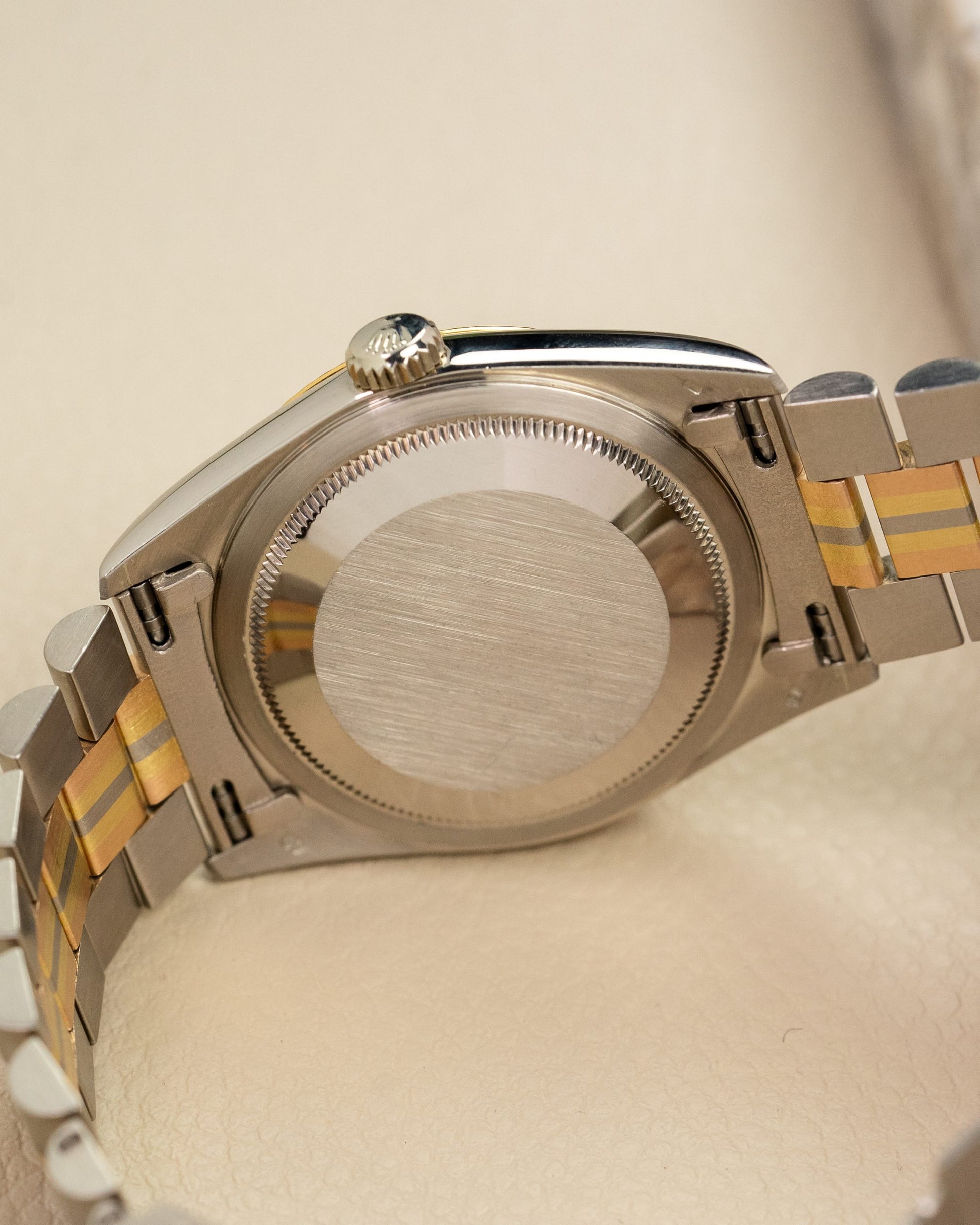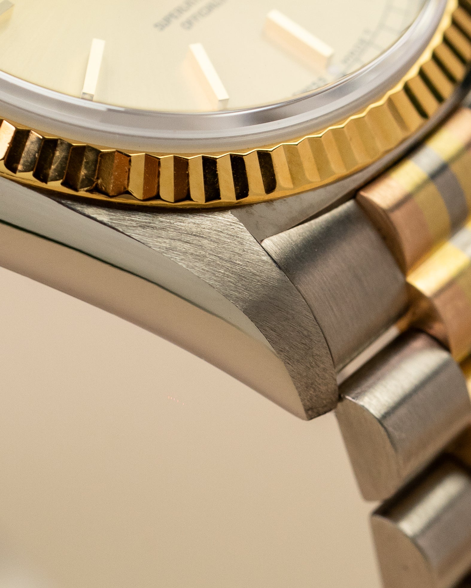 Here we have a Rolex Day-Date that we don't see often. The reference 18239B features a case primarily made of 18K white gold. The fluted bezel is made of yellow gold, but the most interesting aspect is the bracelet. It showcases a combination of three gold materials: yellow gold, white gold, and rose gold—a blend also seen in watches from other brands.