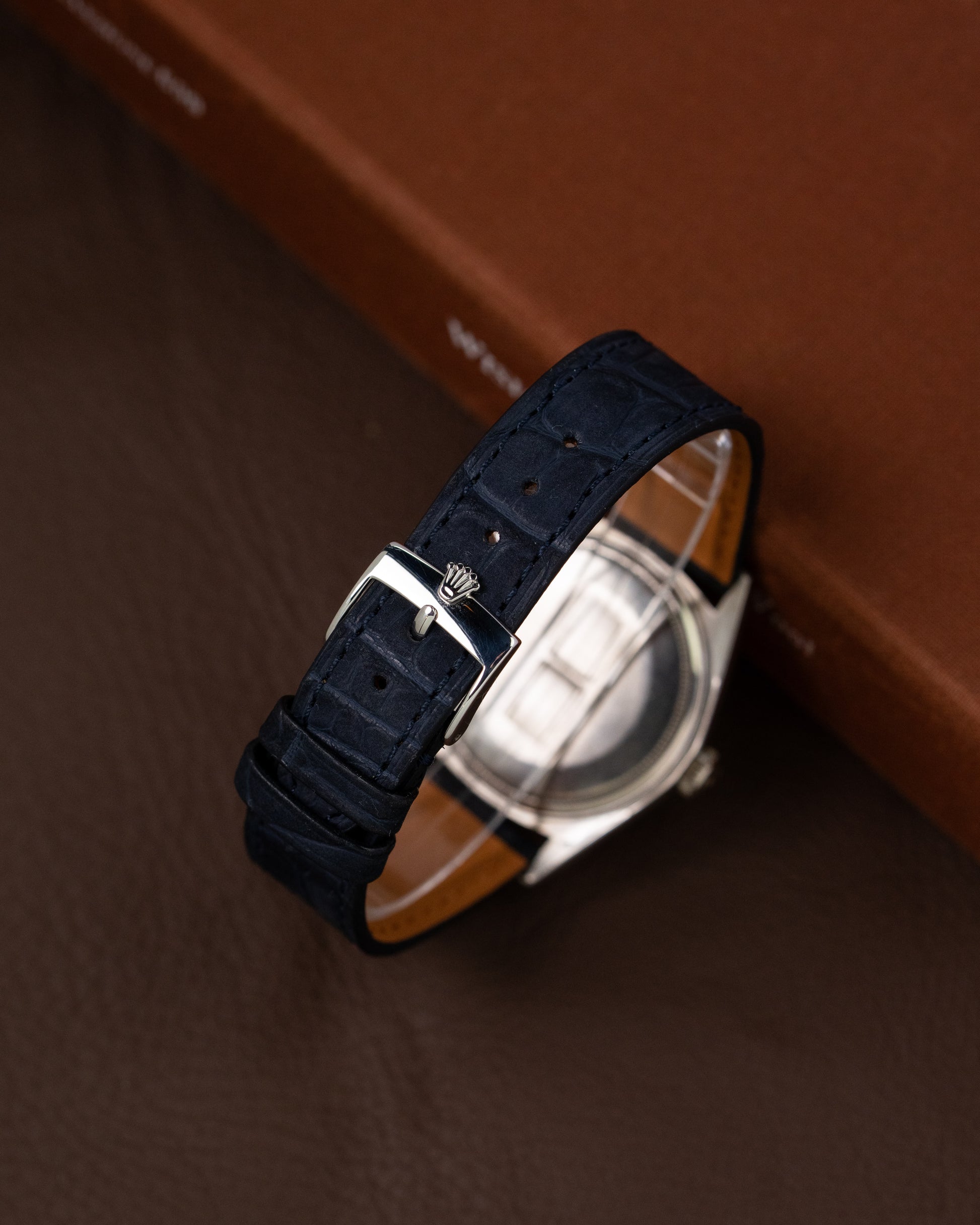 This timepiece is fitted on a navy leather strap and comes with an original Rolex buckle. It comes as a Watch Only.