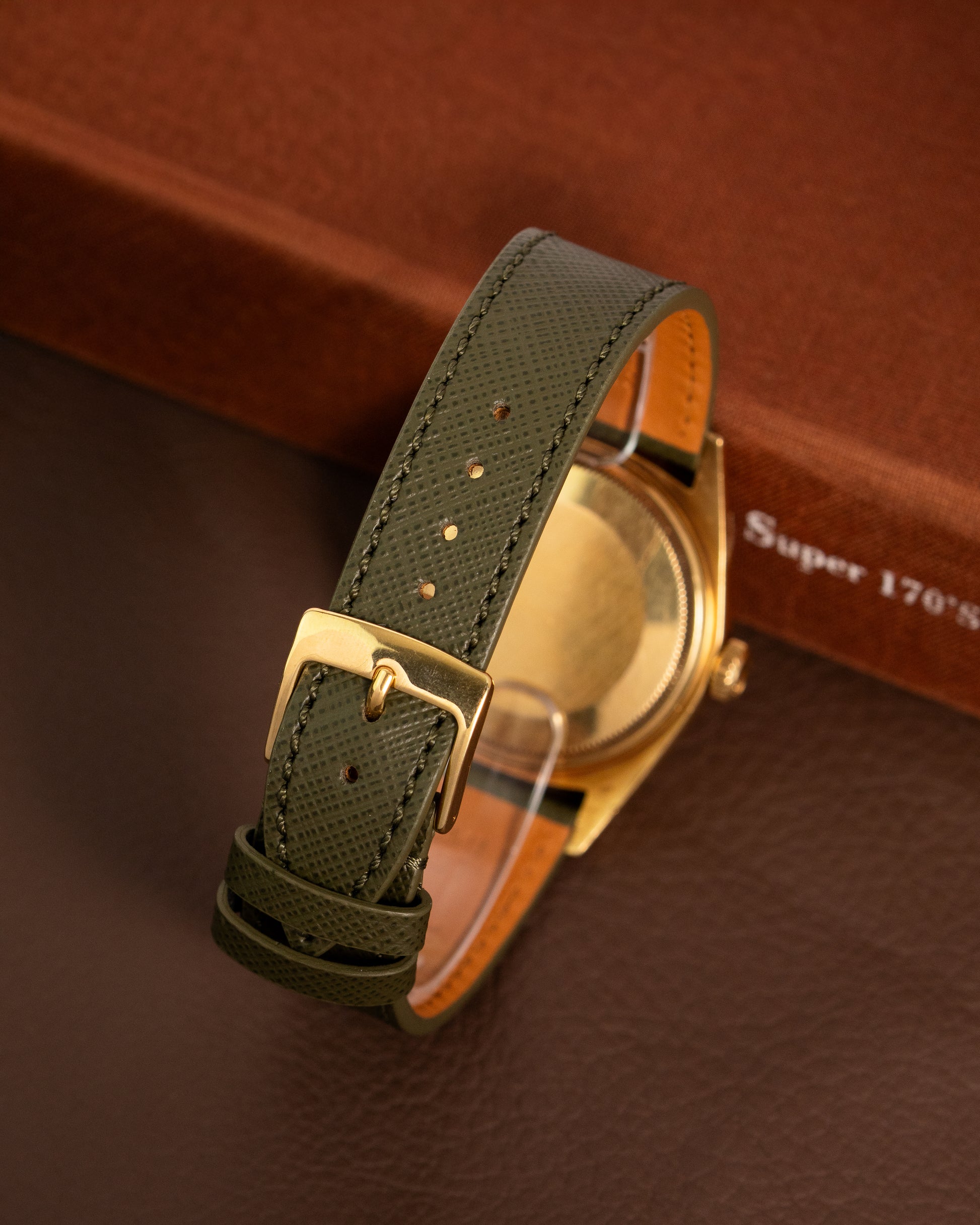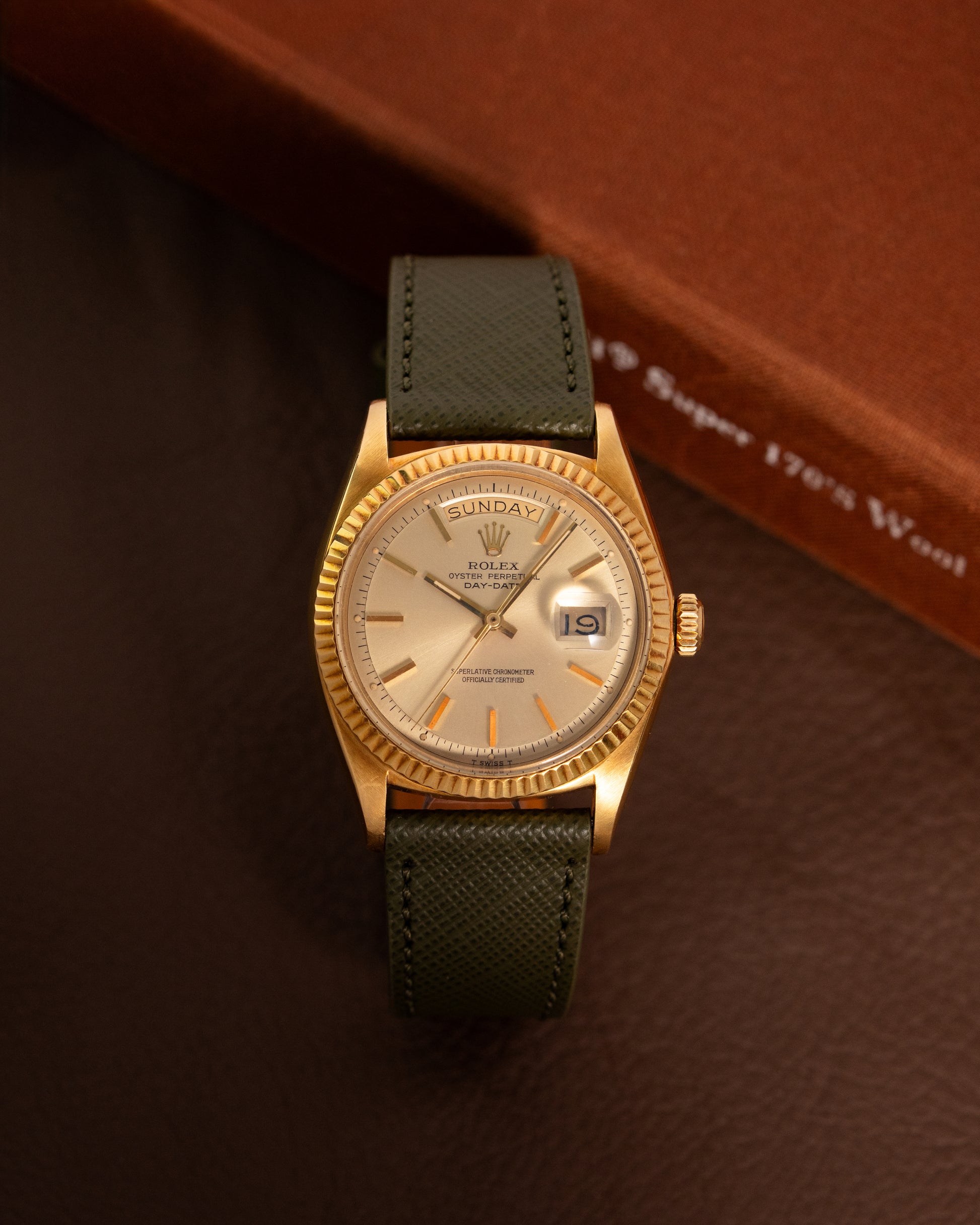 Crafted from precious metals such as 18k yellow gold, white gold, and platinum, the Rolex 1803 belongs to the brand’s flagship line. While the Rolex Day-Date is often seen on a President bracelet, this particular model features a leather trap which gives the watch a very clean look.