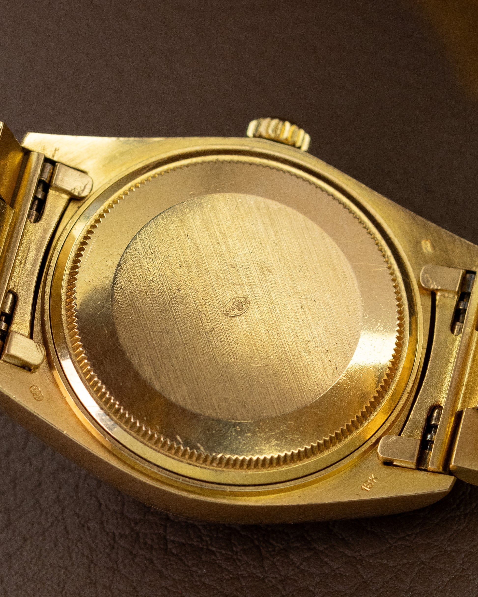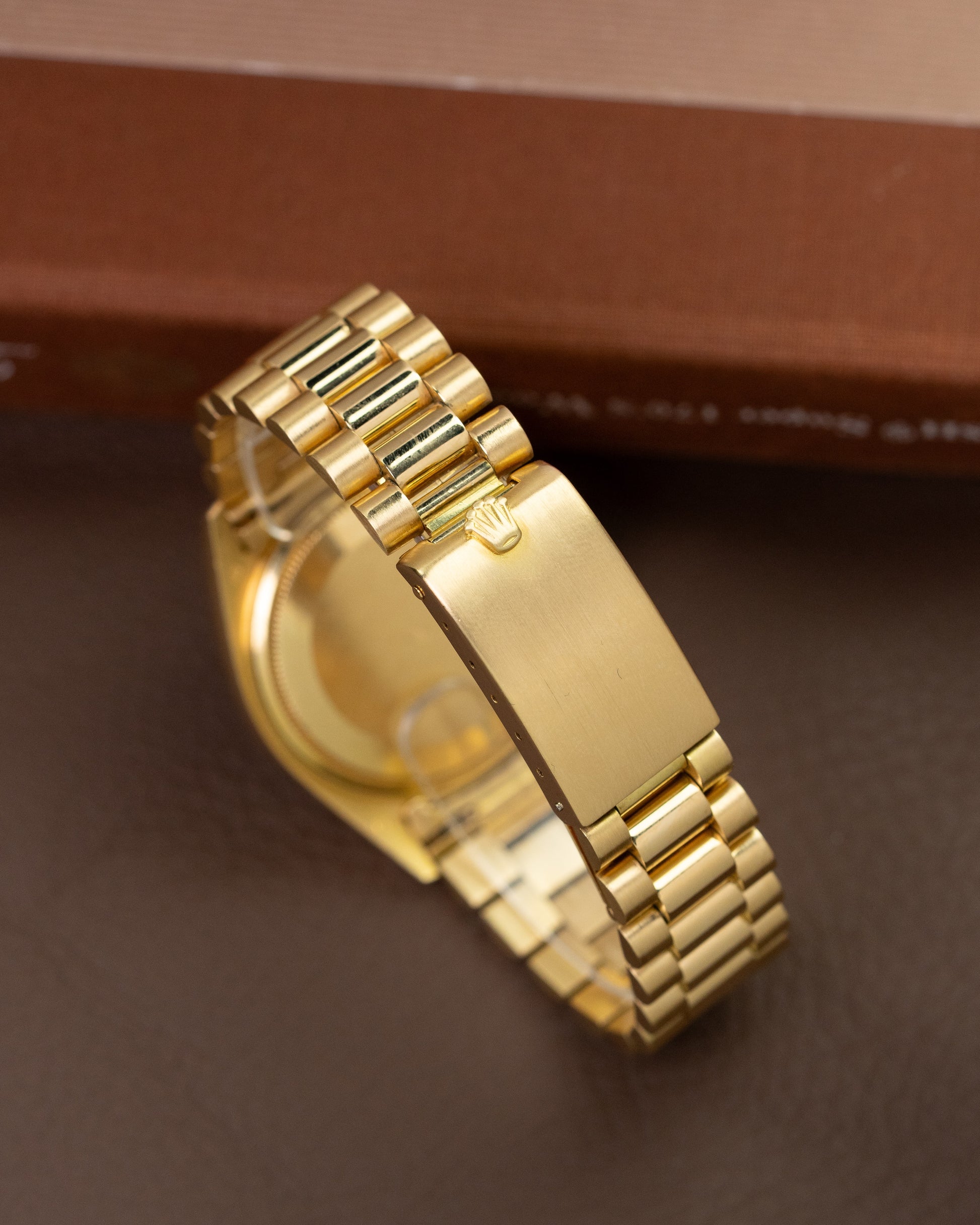 This particular timepiece is made out of 18K yellow gold, in which this model is most recognizable. The legendary reference 1803 has a pie-pan dial, meaning that the minute track is slightly lower than the rest of the dial giving beautiful depth when looking at it. The dial itself is very rare. From a distance you'd think it is just a brown dial, but in fact it is a confetti dial referring to the high amount of speckles on the face.